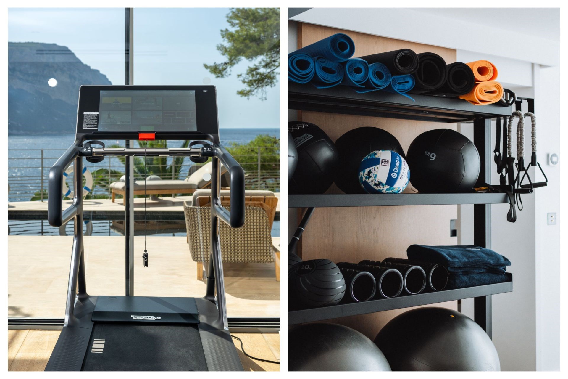 In the Lower Villa, guests will find two more en-suite bedrooms on the second floor, each with private balconies, plus a private massage room. Heading down to the first floor, there is a spacious living area with comfortable lounge seating, an elegant dining table, and another fully-equipped dining kitchen. Adjoining the living room is a fitness room filled with Technogym equipment and a hammam for post-workout relaxation. All rooms on this floor lead out to the main terrace and first pool.
