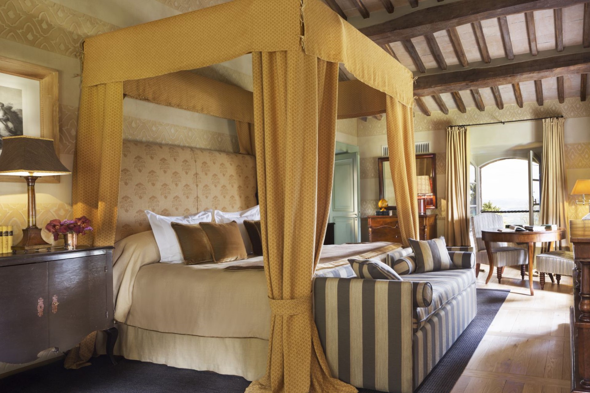 Villa Castello is adjacent to the ruins of a medieval castle on a hill that dominates the glorious Val d’Orcia, south of Montalcino.