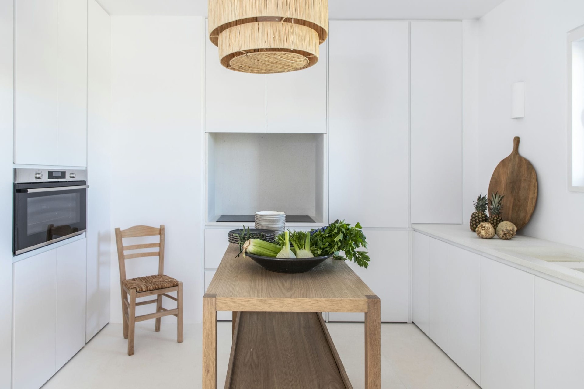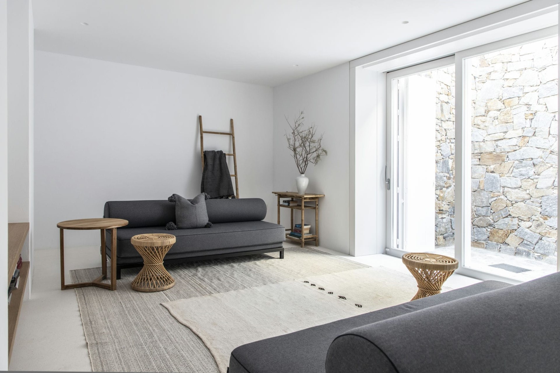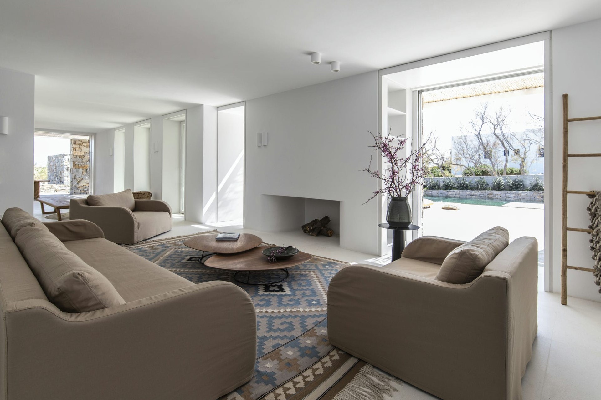 The main living room inside the villa also opens up to the pool terrace via large glass doors, allowing the sea breeze to permeate the whole property. Fresh white walls and ceilings, neutral colour palettes and minimalist design enhance the bright seaside atmosphere found here.