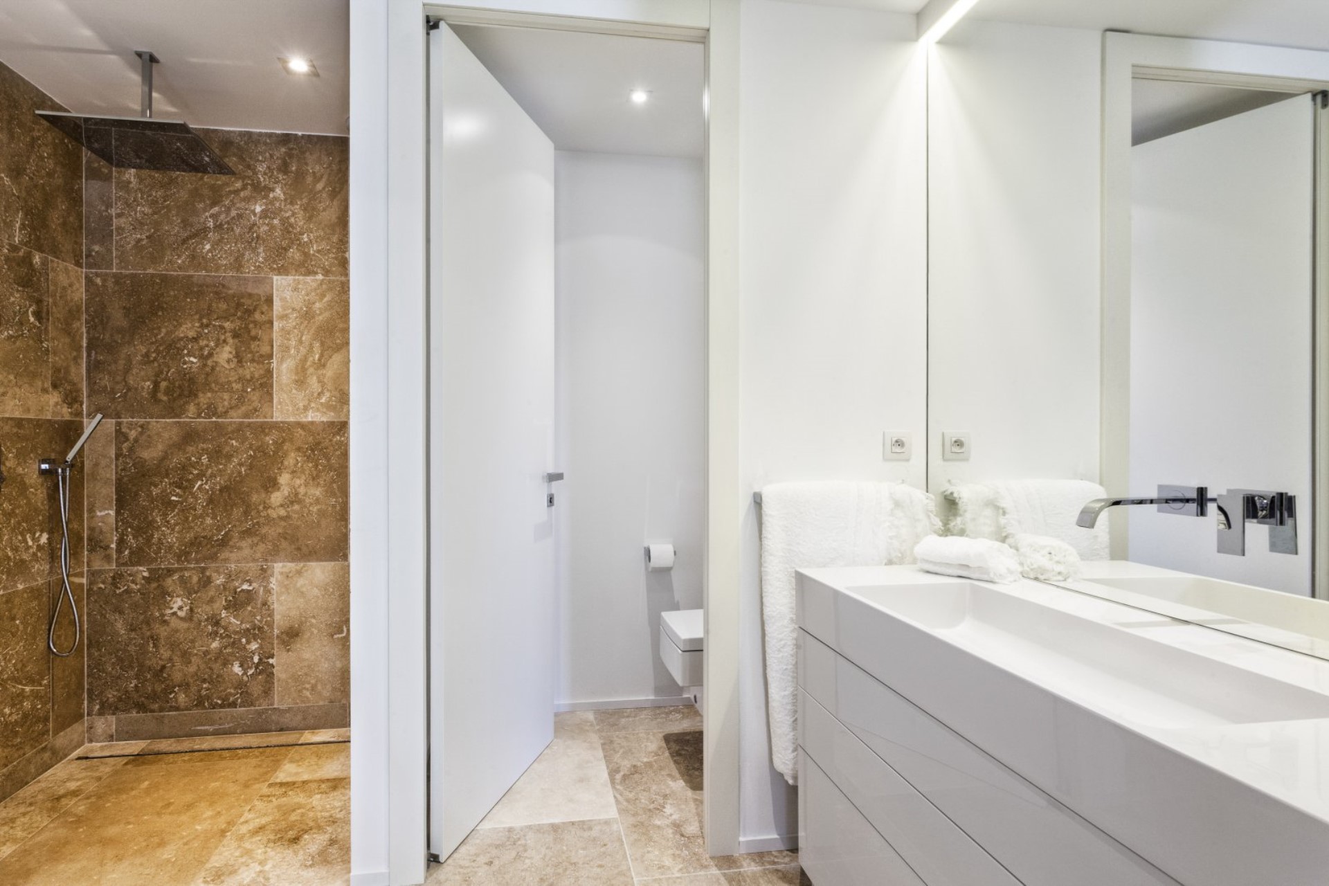 The master bedroom is located on the first floor and features a fireplace, and a bathroom with shower and bathtub. On the same level, there are another two en-suite bedrooms. All three bedrooms have splendid ocean views and access to a terrace with sunbeds. The main villa’s lower level comprises two more bedrooms that share a bathroom, a cinema room and a laundry.