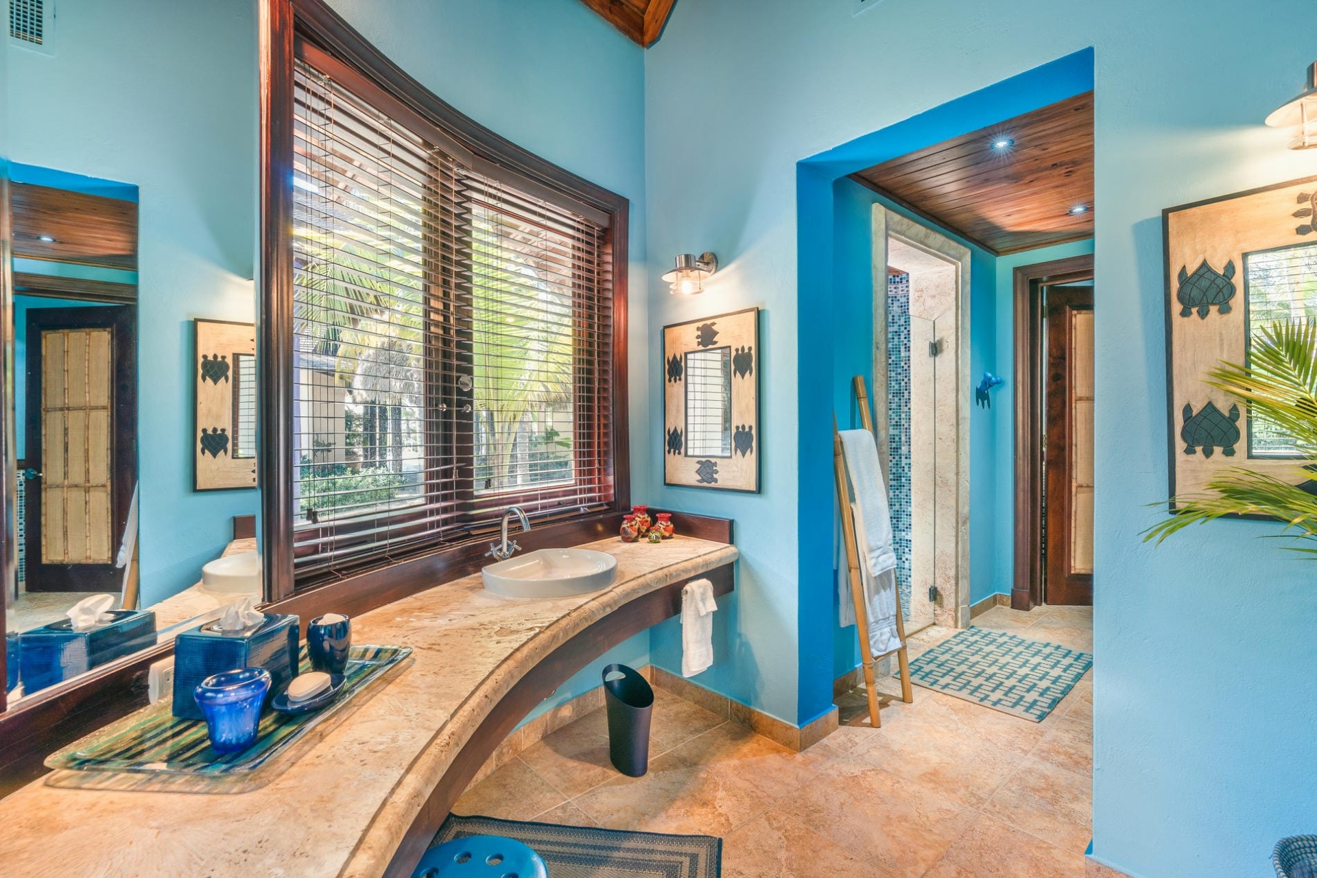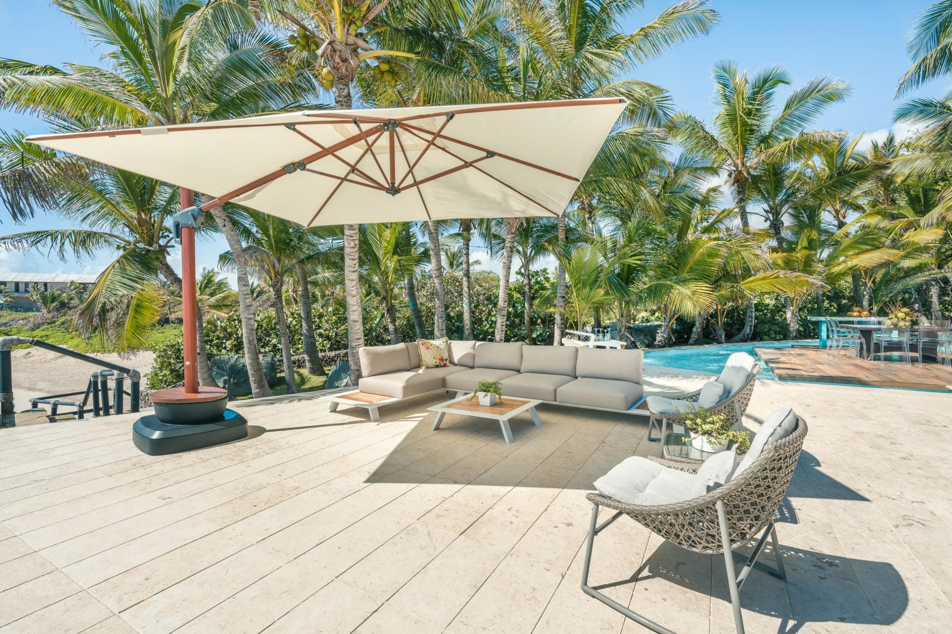 There is ample open garden space to enjoy time in the sun and a private path that leads directly to a private white sand beach with waters protected by a breakwater, making it perfect for young and old alike.
