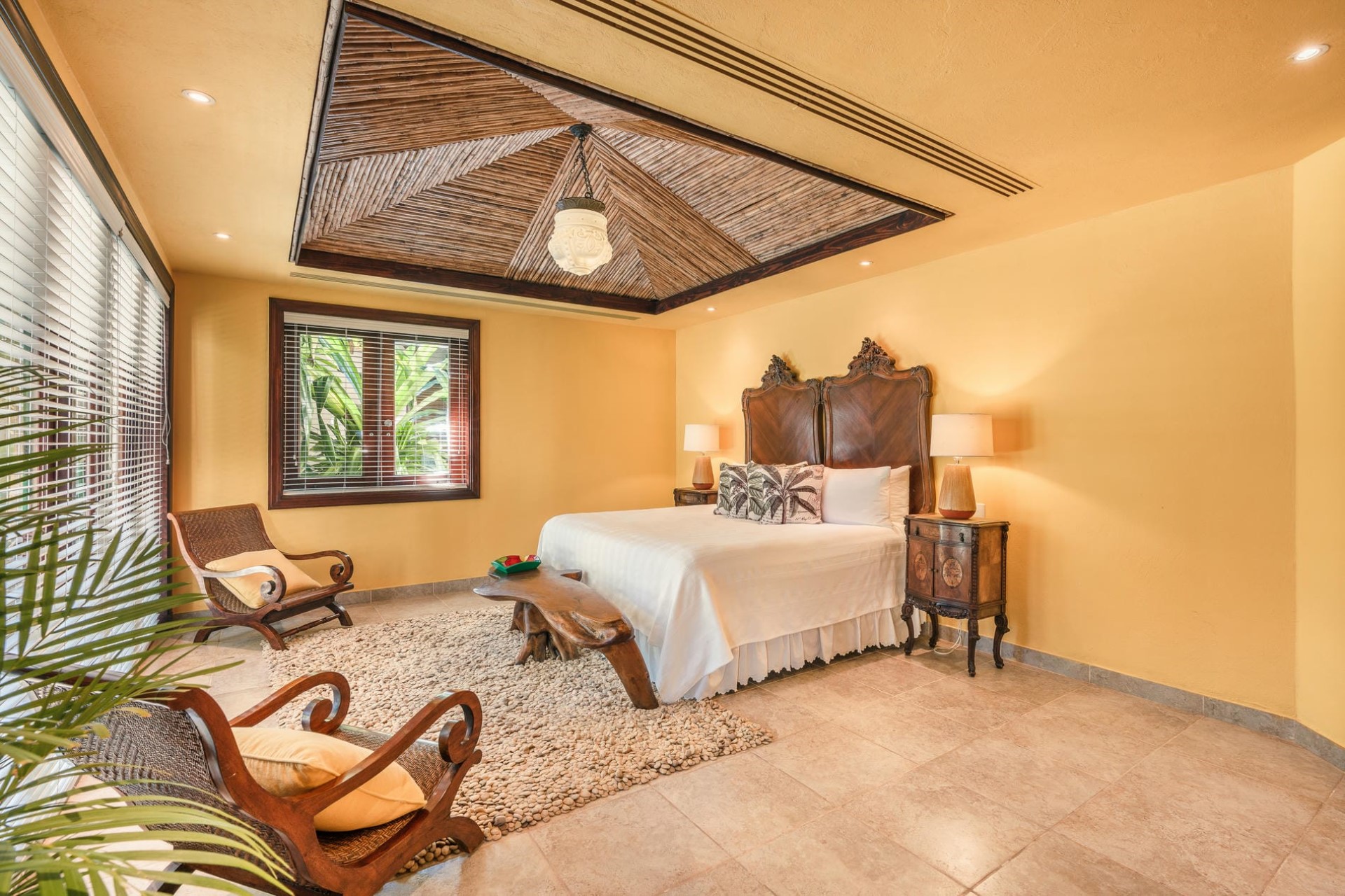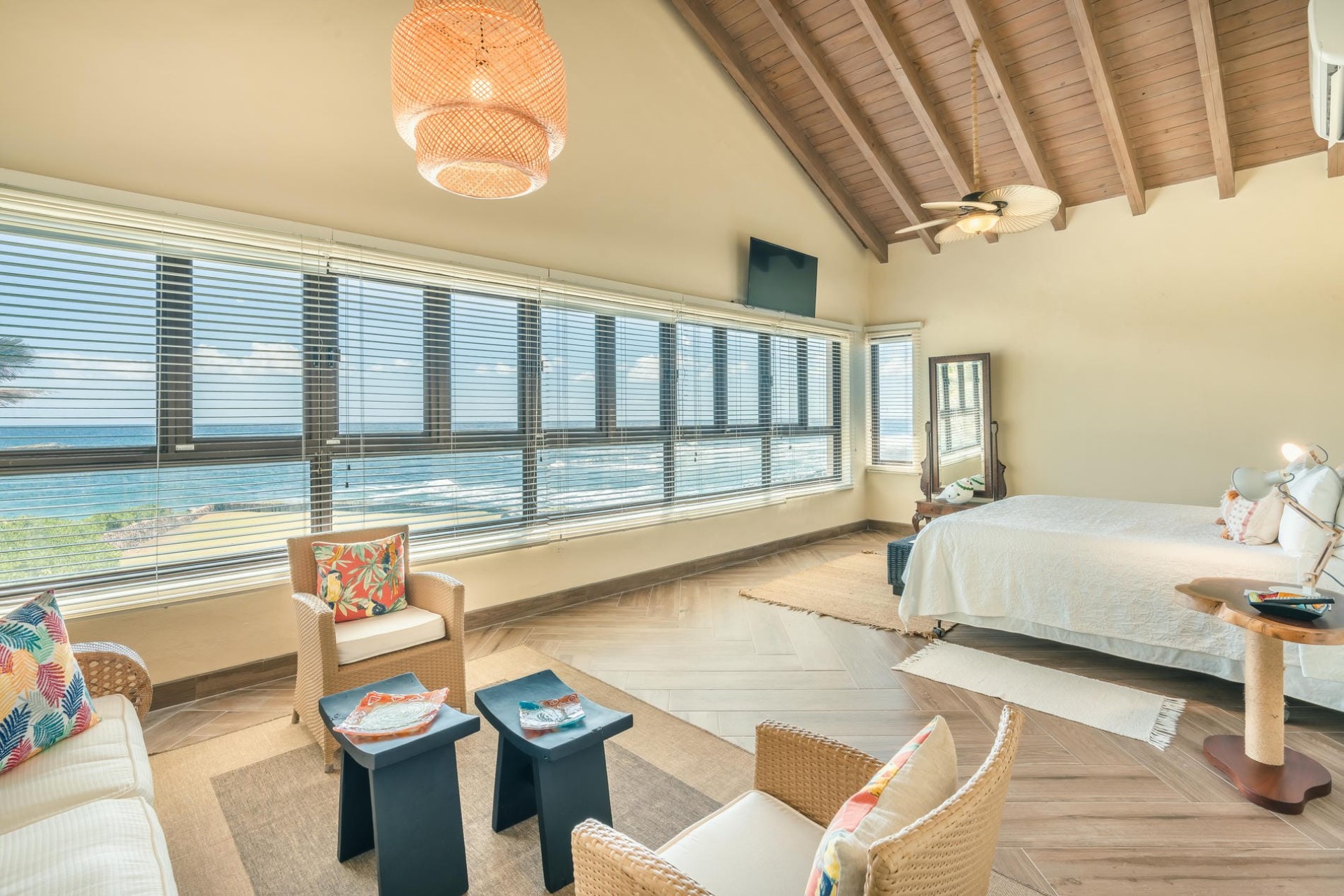 Within the oceanfront guest house lies the master bedroom, with wall-to-wall sliding doors allowing guests to drink in the incredible ocean views. Upstairs, a second king-size bedroom also embraces the fantastic ocean location with windows spanning the length of the room.