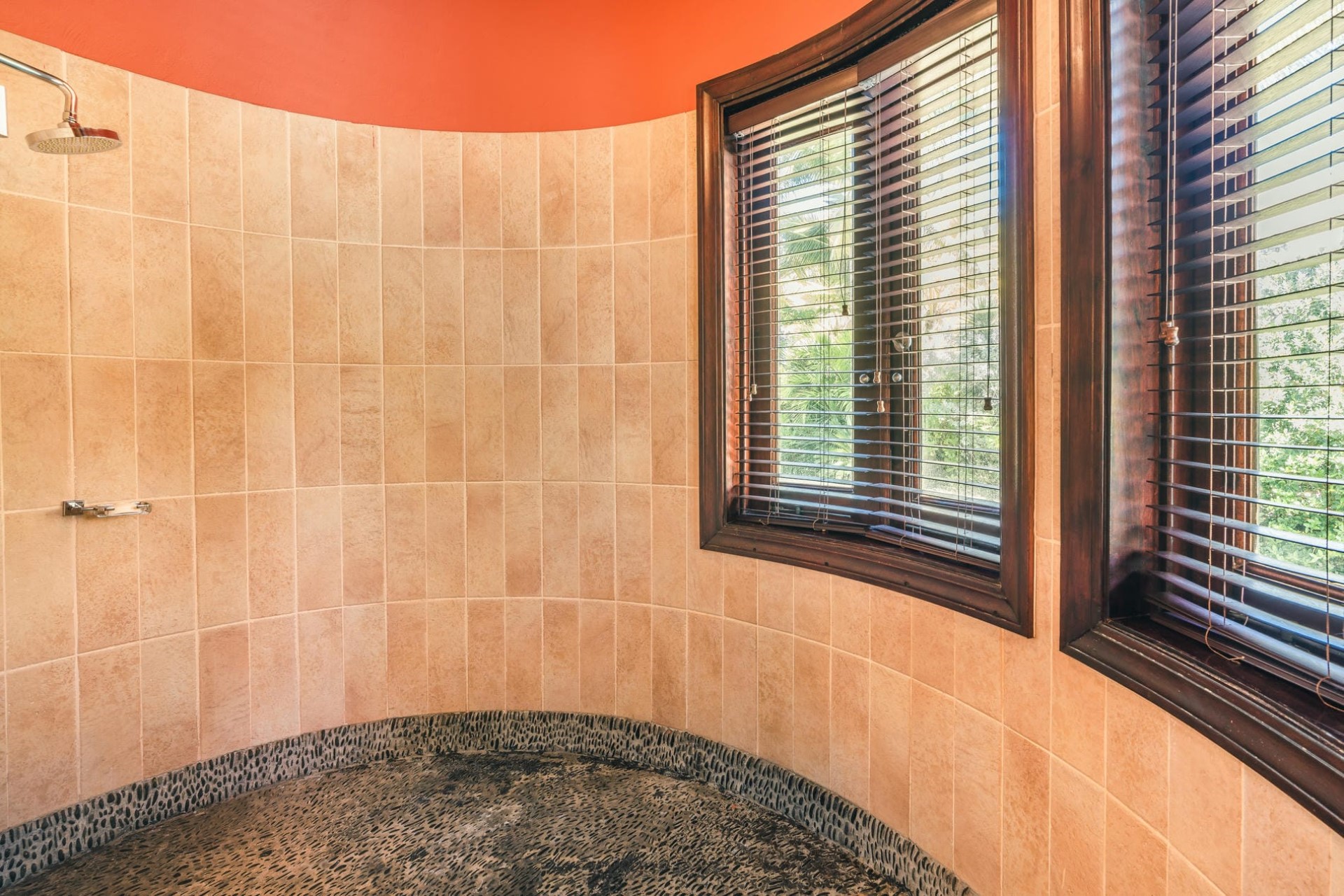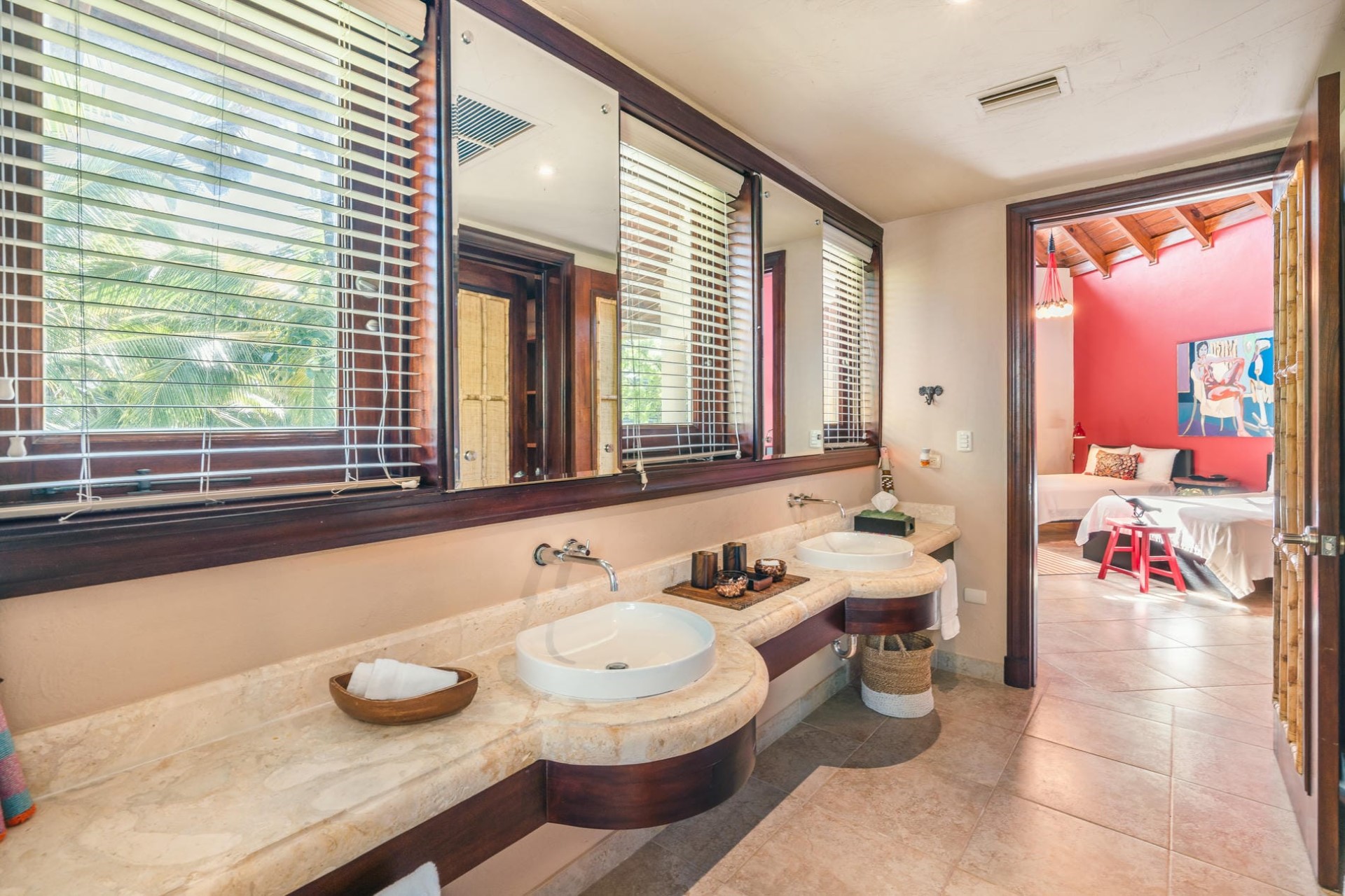 Bedroom 3 – king-size bed, sitting area, en-suite bathroom with dual vanity & shower, and pool area access