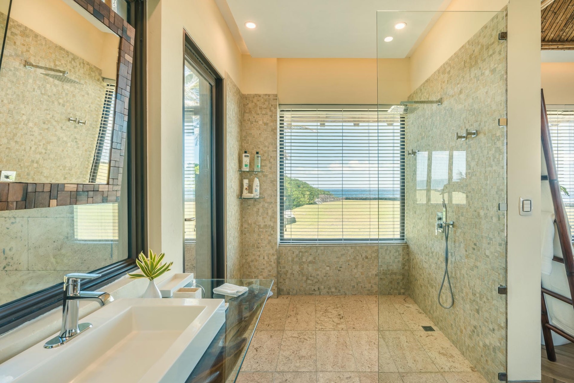 Master Bedroom 1 – king-size bed, sitting area, en-suite bathroom with dual vanity & shower, private terrace, and ocean views
