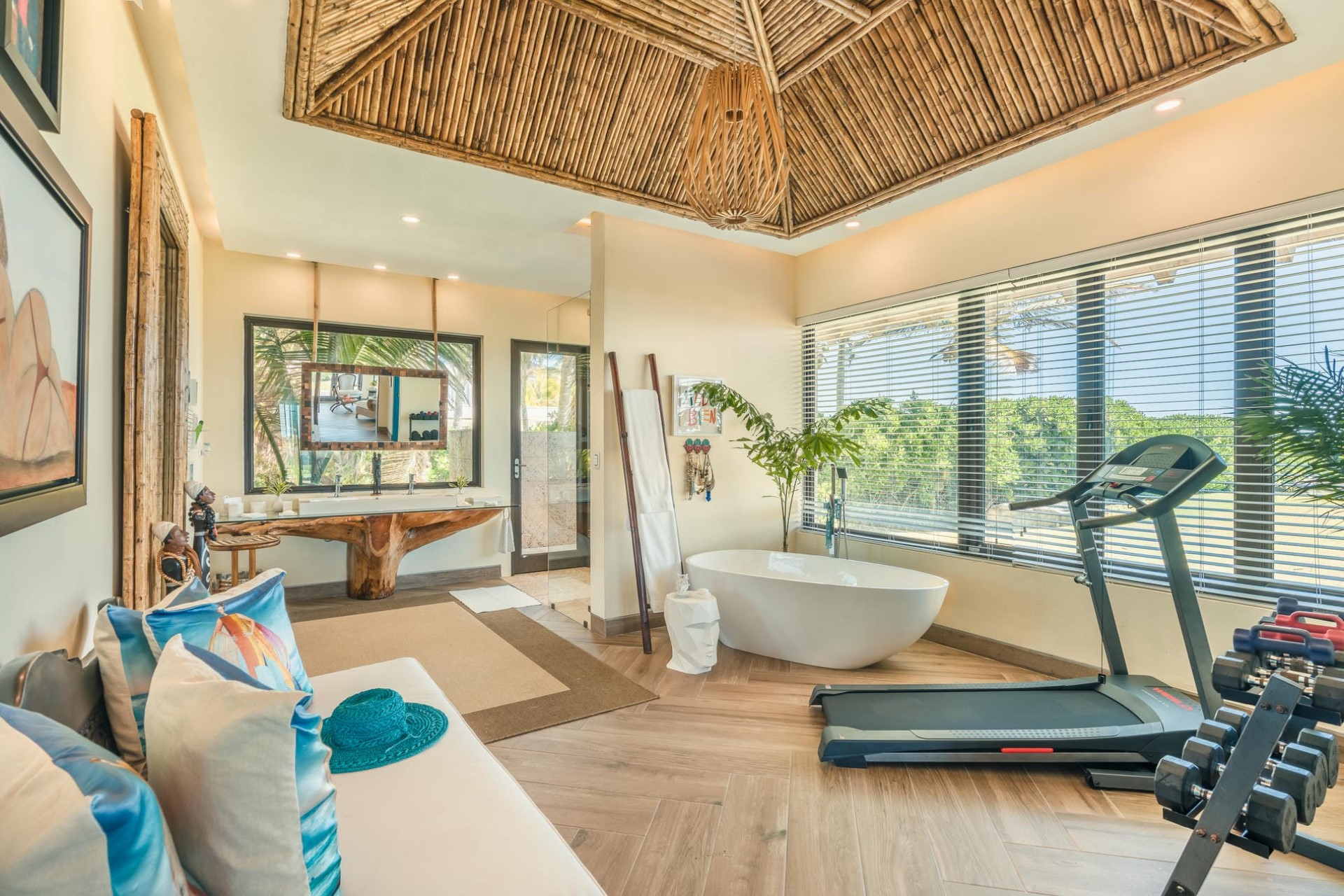 A unique pool runs around the villa like a moat, giving guests the feeling of being on a small private island. Spread across four buildings, there is ample space for family and friends to enjoy time together, as well as pockets of serene peace to recharge. The villa embraces the colours of the tropical landscape it finds itself in, both inside and outside, creating a warmth and rustic luxury not found in many villas of this size.