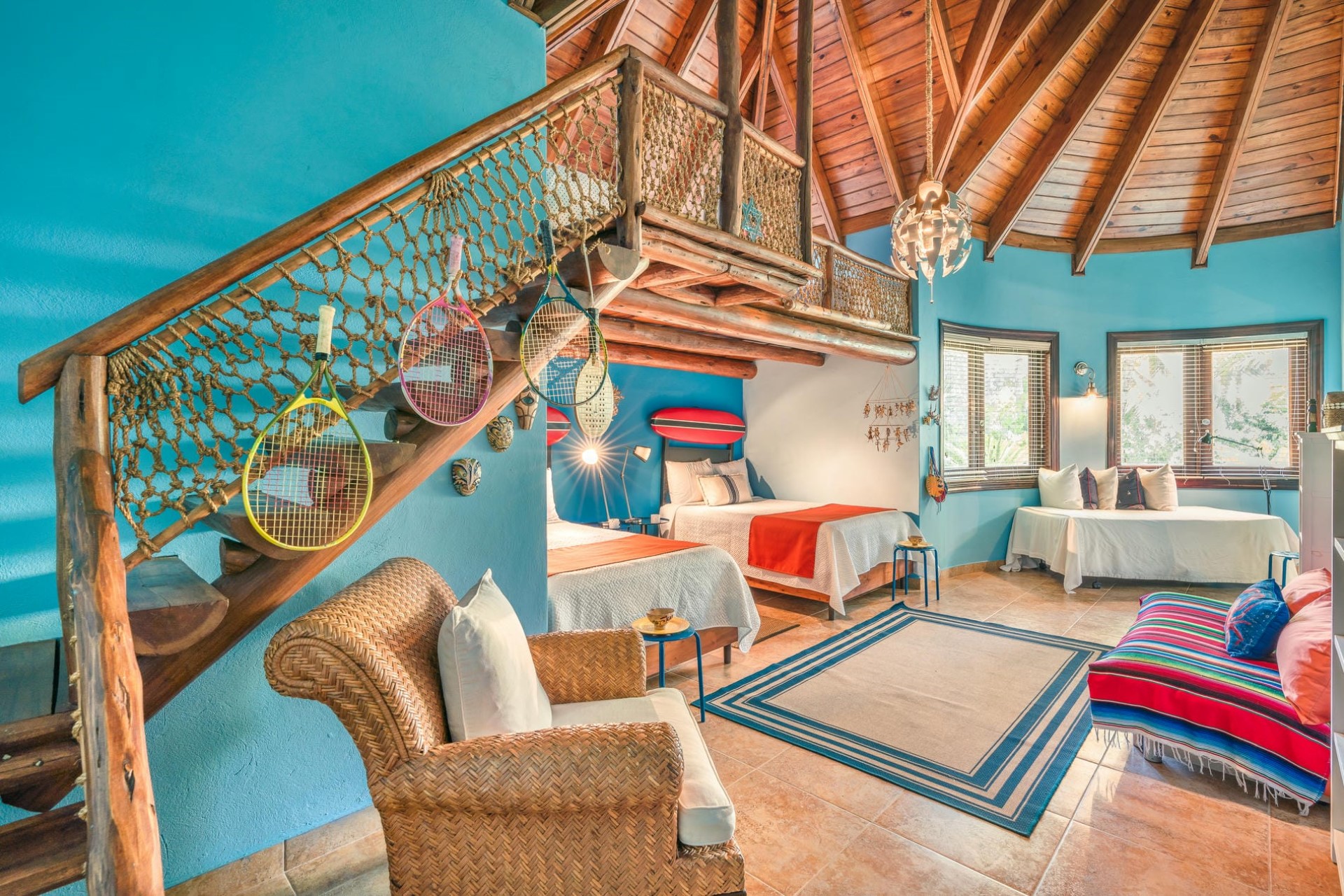 The final four bedrooms are located within the two buildings that comprise the largest part of the villa. There is one king-size room with access directly out to the terrace, two rooms with two queen-size beds, and a family bedroom comprising two double beds and a twin bed, plus two additional twins nestled in a cosy mezzanine, perfect for younger guests.