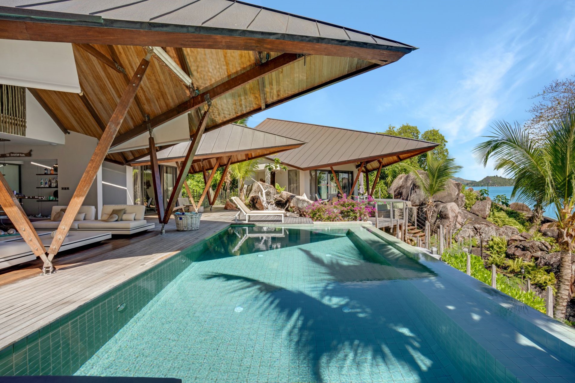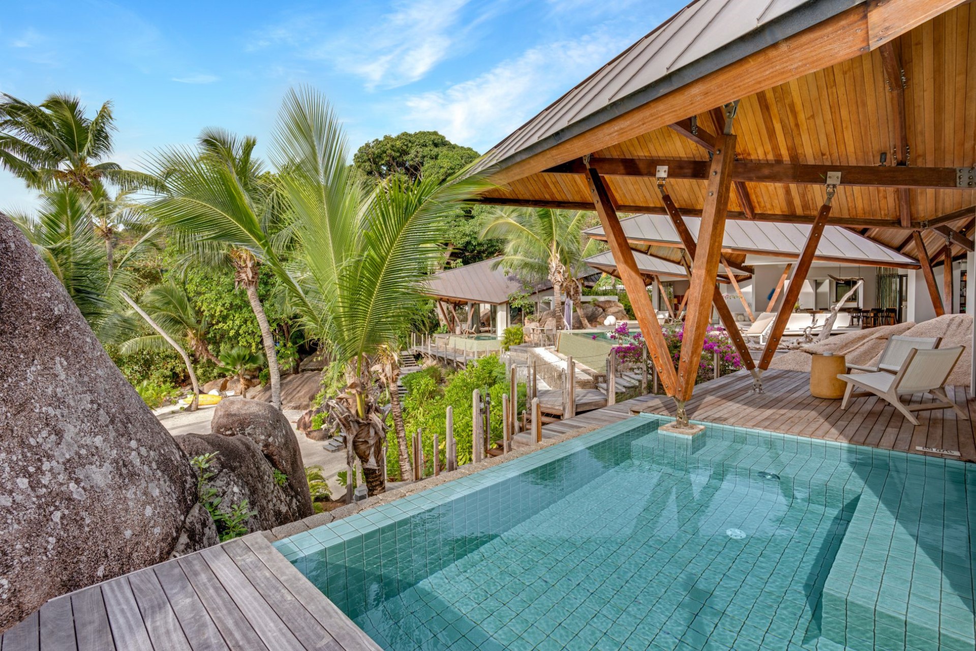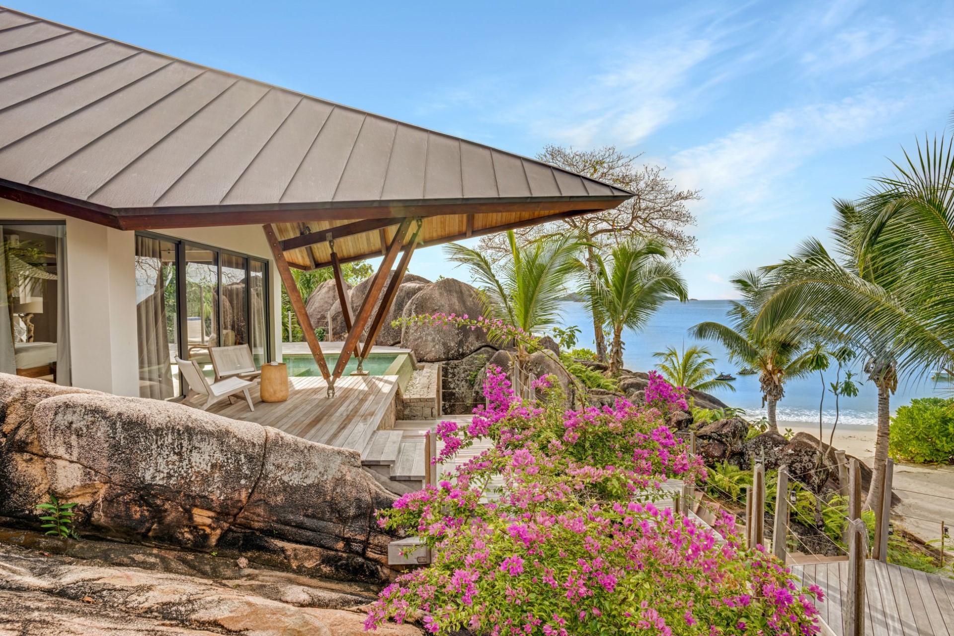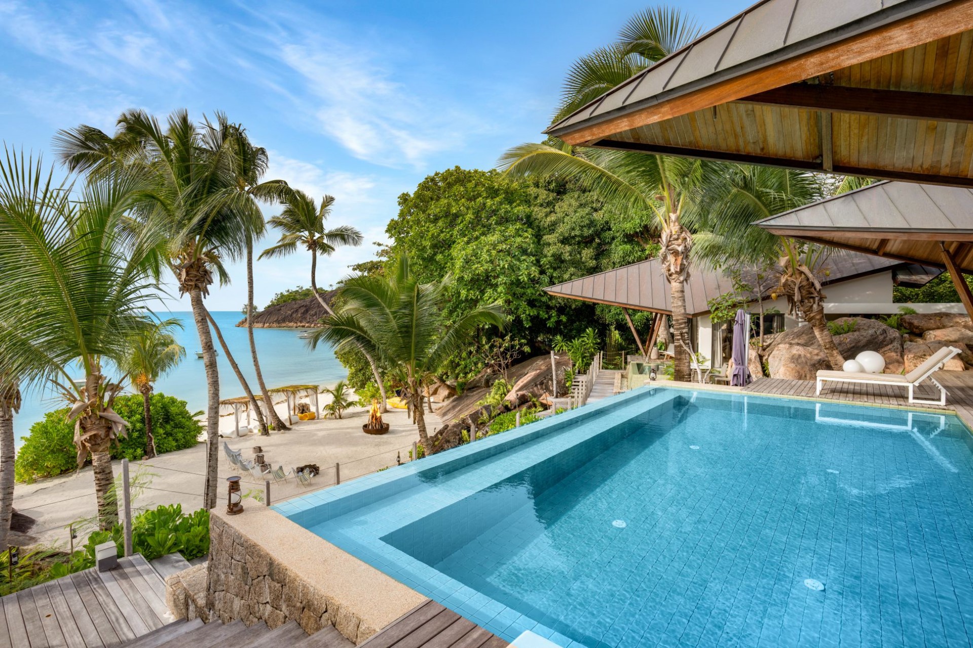 On one side of the villa, beautifully-landscaped tropical gardens welcome guests. On the other side, sprawling terraces offer ocean views, and wooden stairways lead down to the white-sand beach with spectacular granite boulder formations and crystal-clear waters.