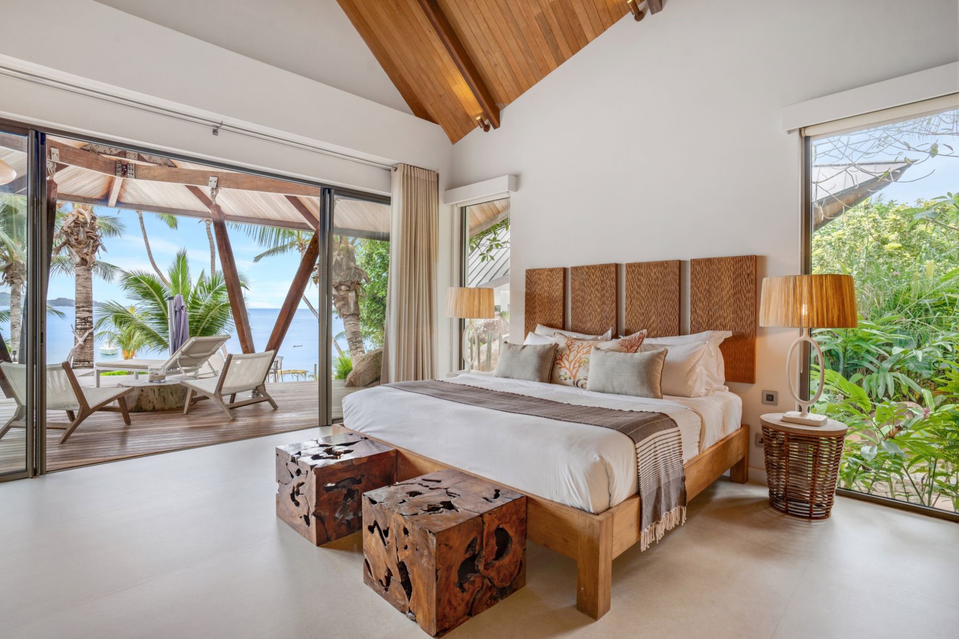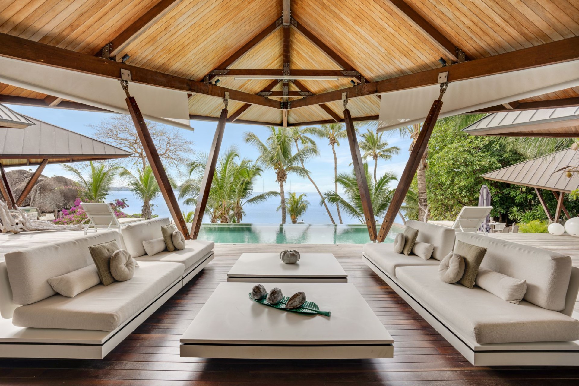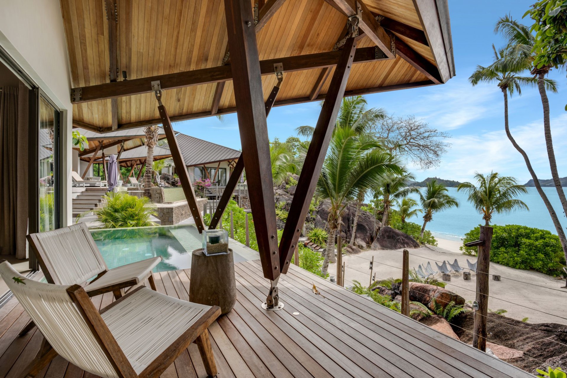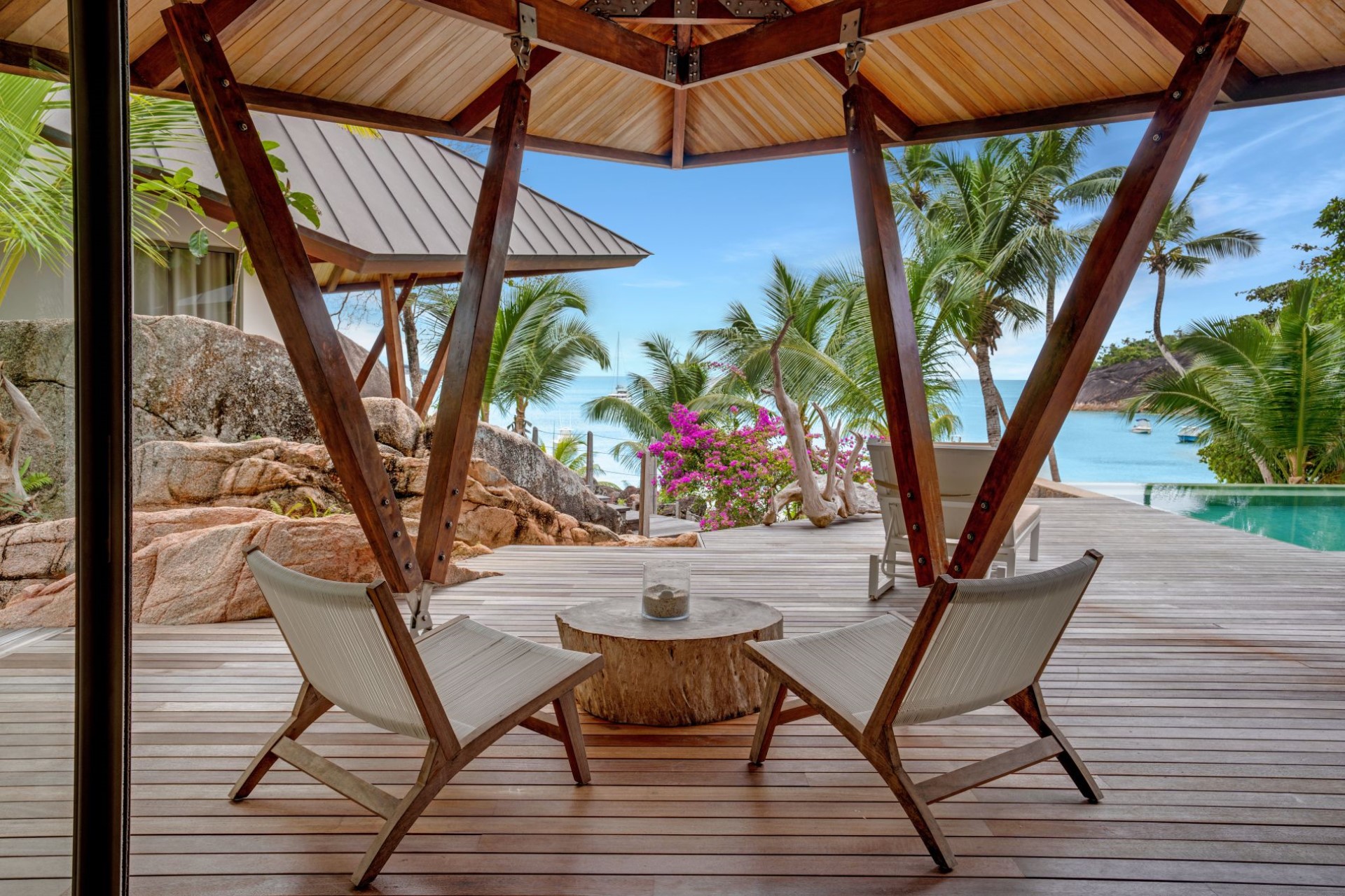 On one side of the villa, beautifully-landscaped tropical gardens welcome guests. On the other side, sprawling terraces offer ocean views, and wooden stairways lead down to the white-sand beach with spectacular granite boulder formations and crystal-clear waters.