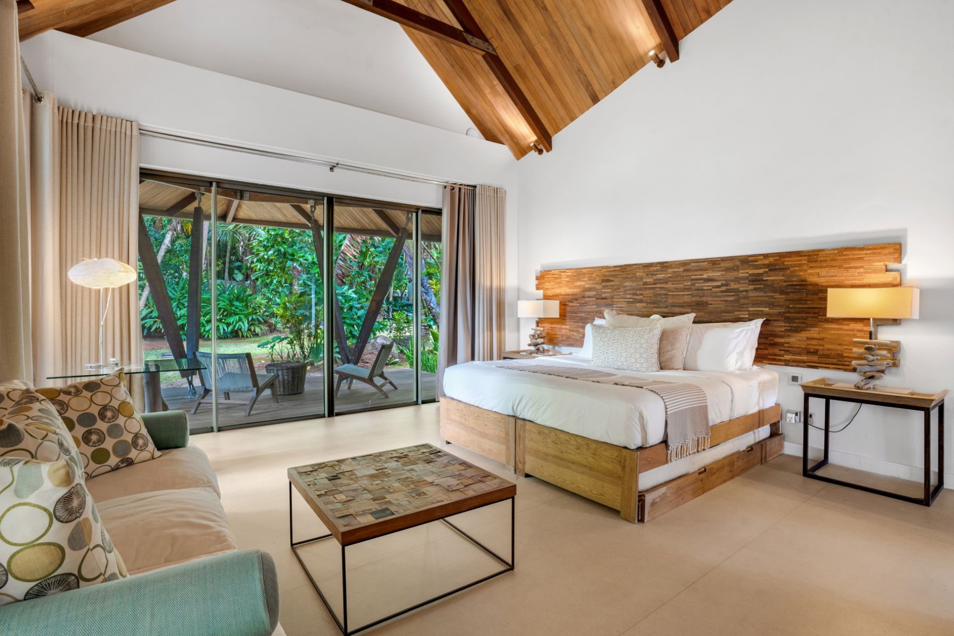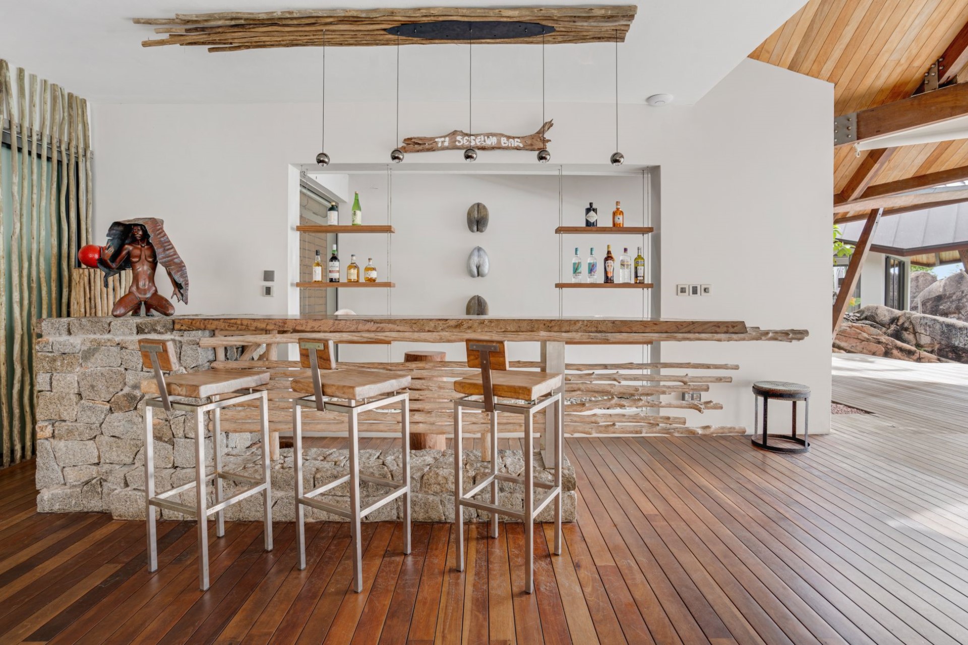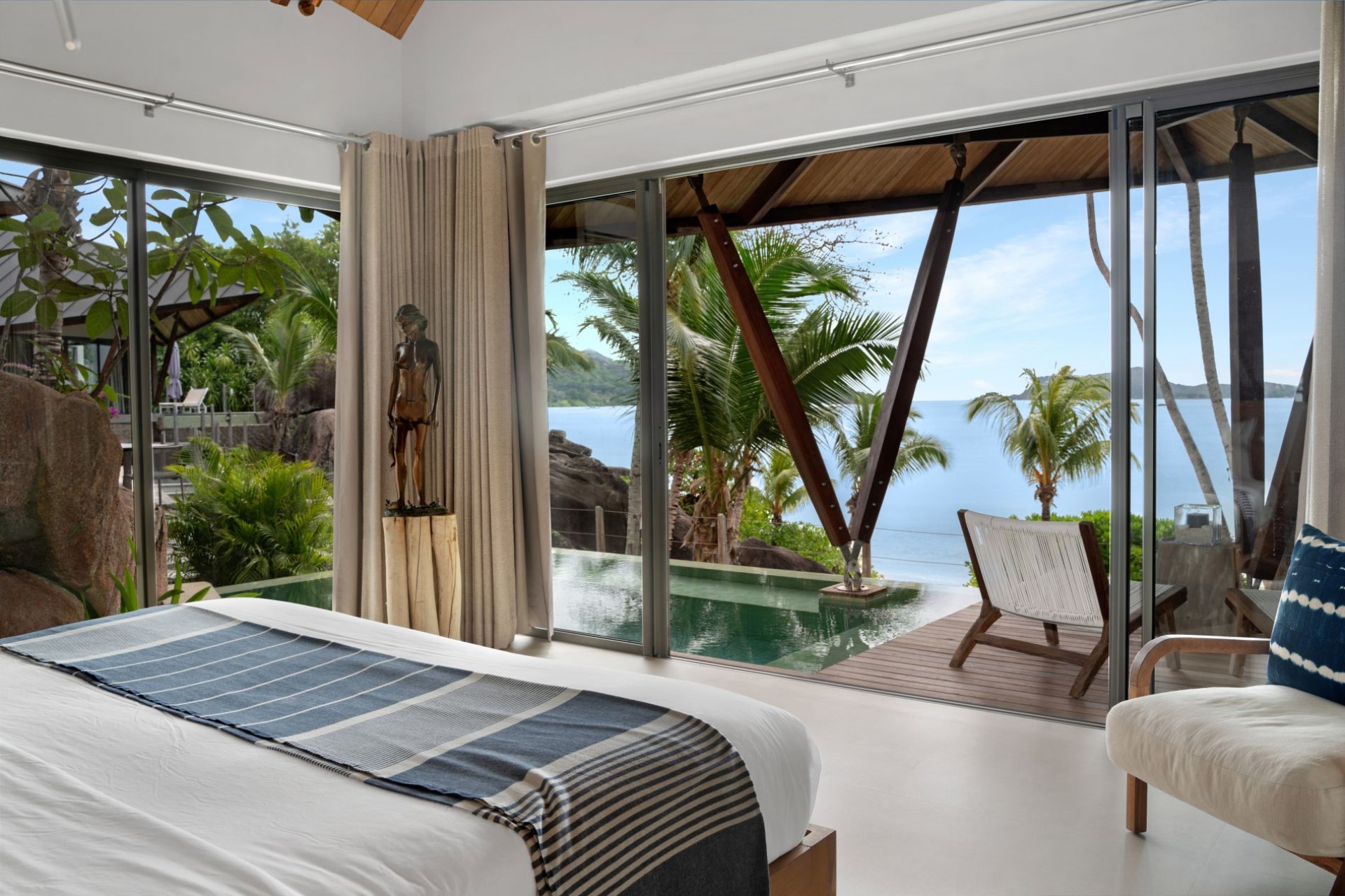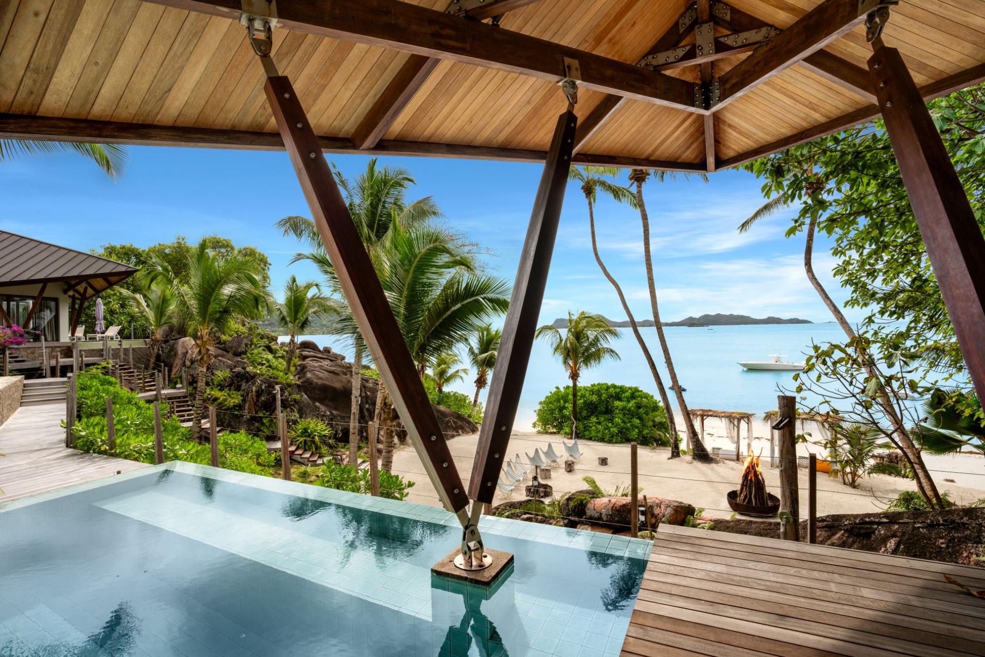 On one side of the villa, beautifully-landscaped tropical gardens welcome guests. On the other side, sprawling terraces offer ocean views, and wooden stairways lead down to the white-sand beach with spectacular granite boulder formations and crystal-clear waters.