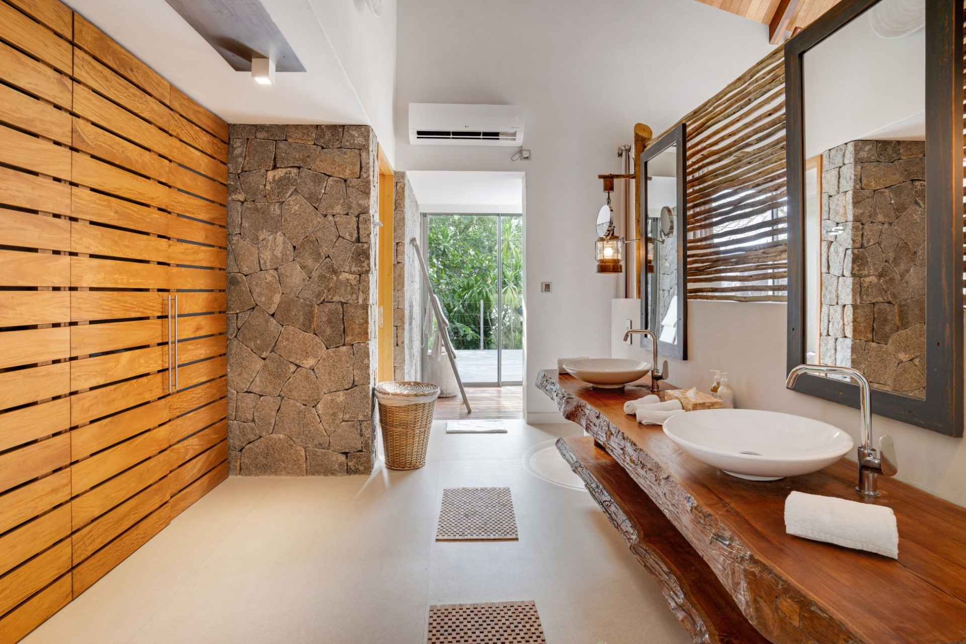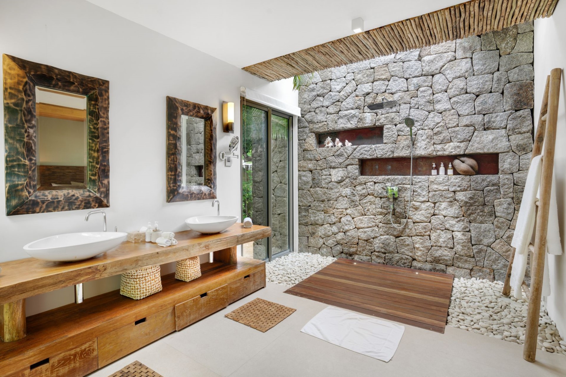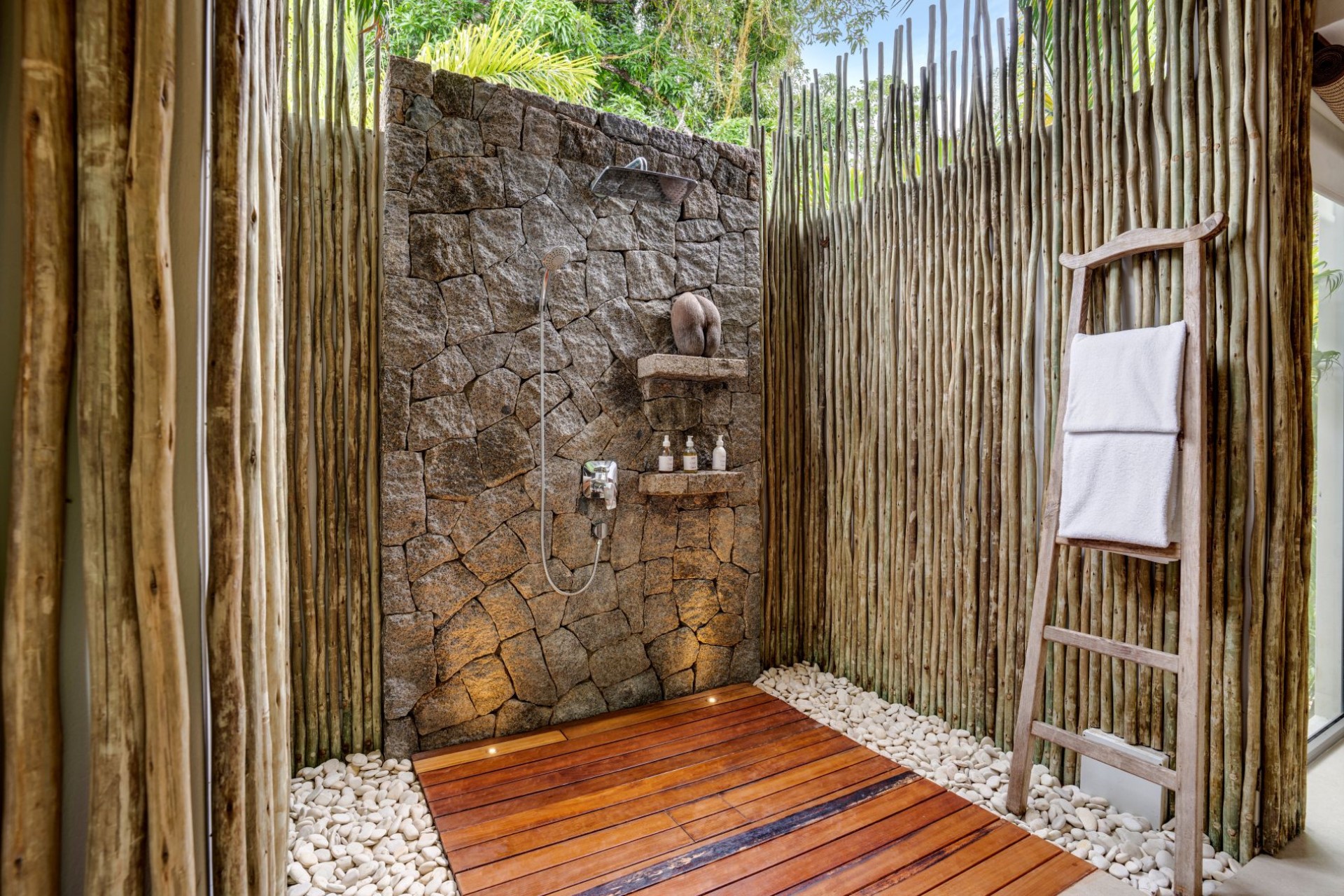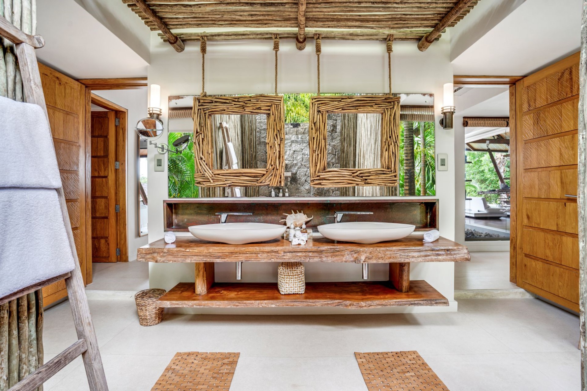 On one side of the villa, beautifully-landscaped tropical gardens welcome guests. On the other side, sprawling terraces offer ocean views, and wooden stairways lead down to the white-sand beach with spectacular granite boulder formations and crystal-clear waters.
