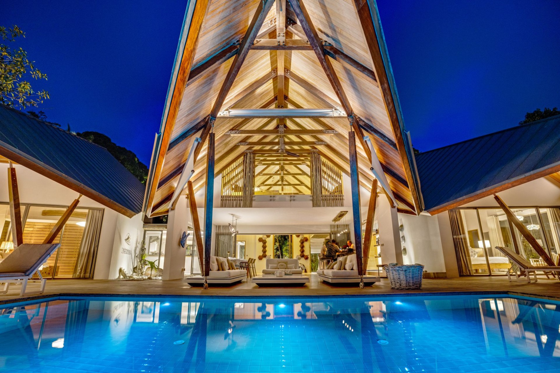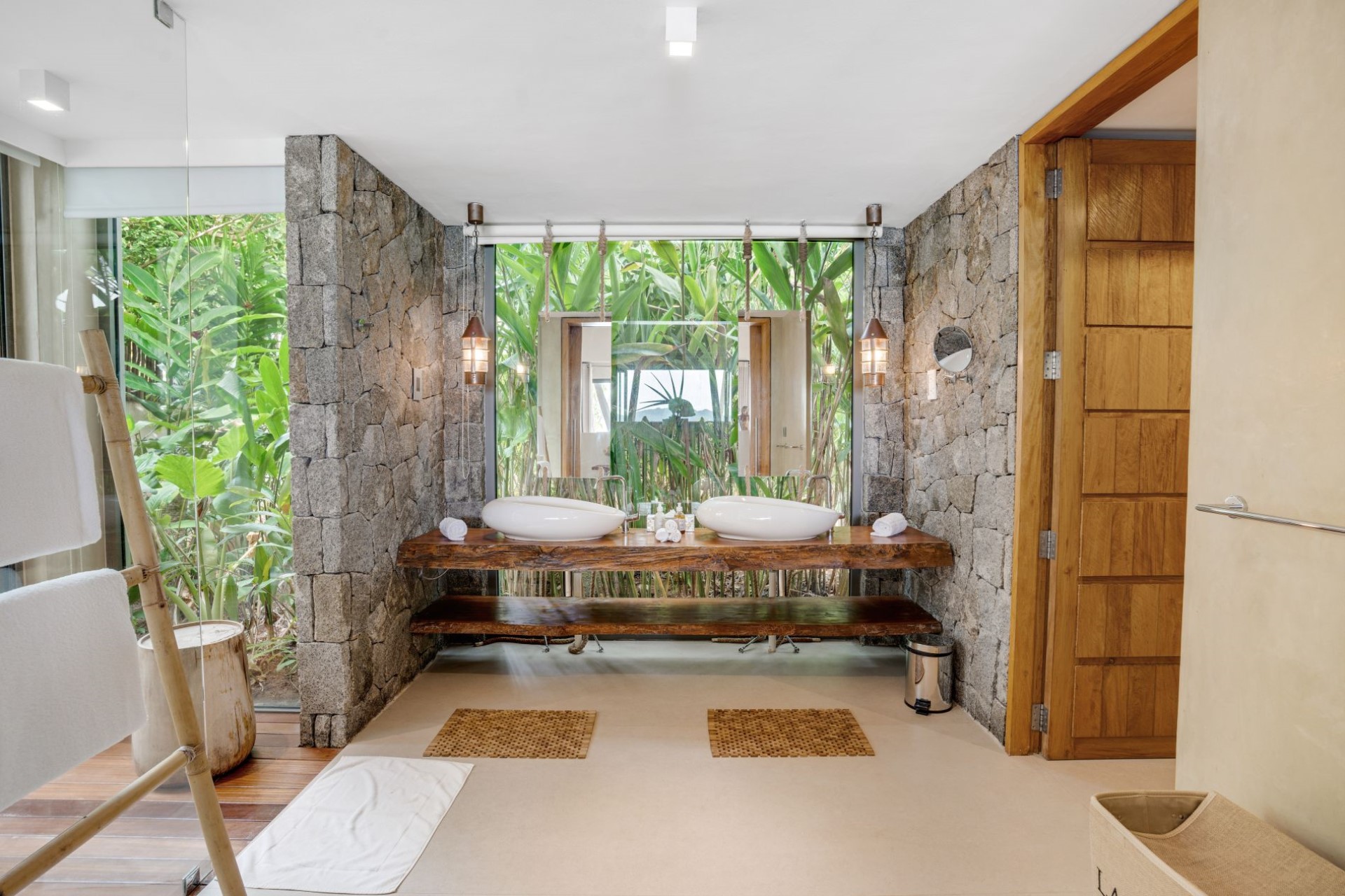 The villa was constructed with its surrounding environment in mind, using natural and complementary building materials to integrate into the natural setting as much as possible. A tropical colour scheme, natural elements, and floor-to-ceiling windows with ocean views create a relaxing atmosphere and an authentic island vibe.
