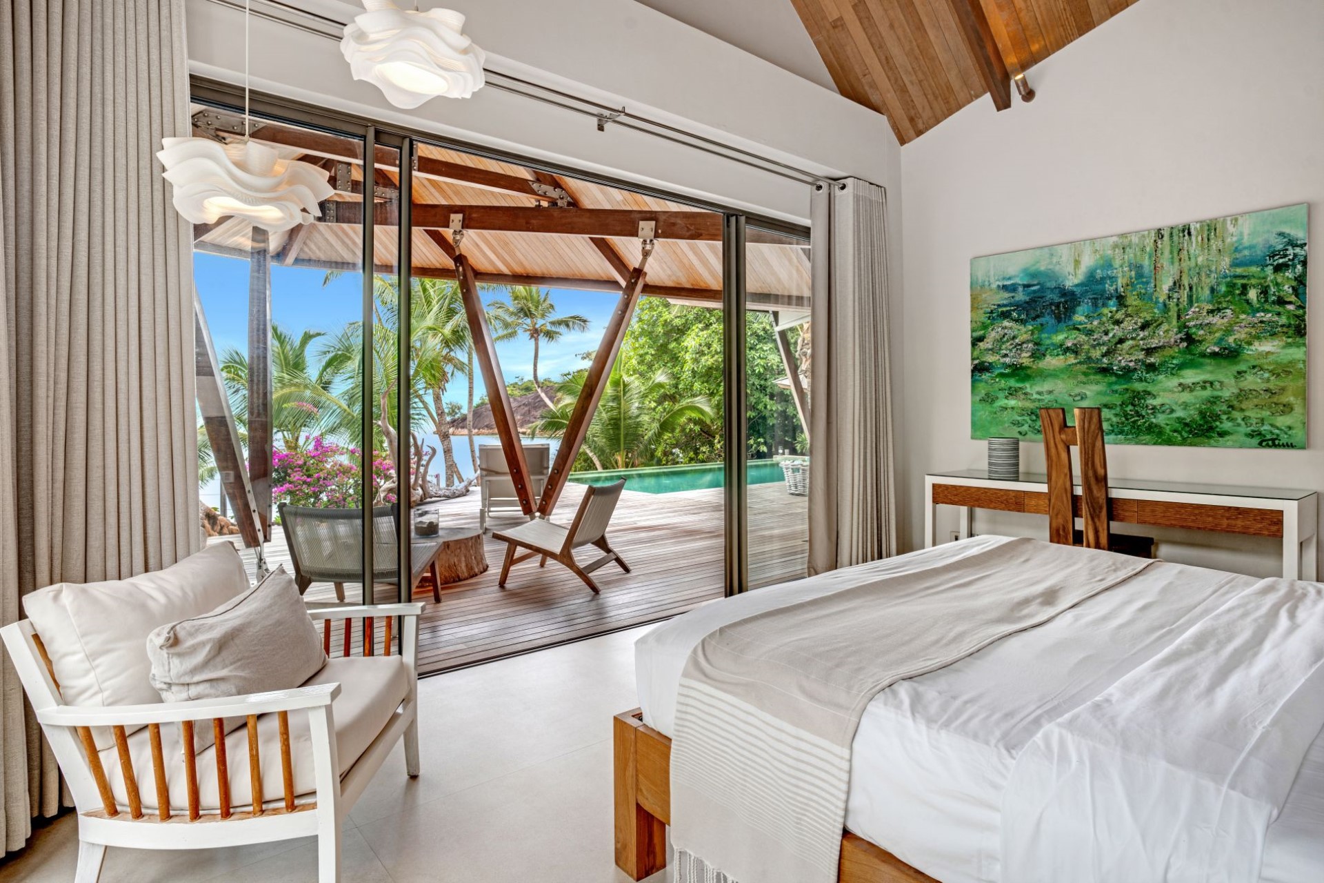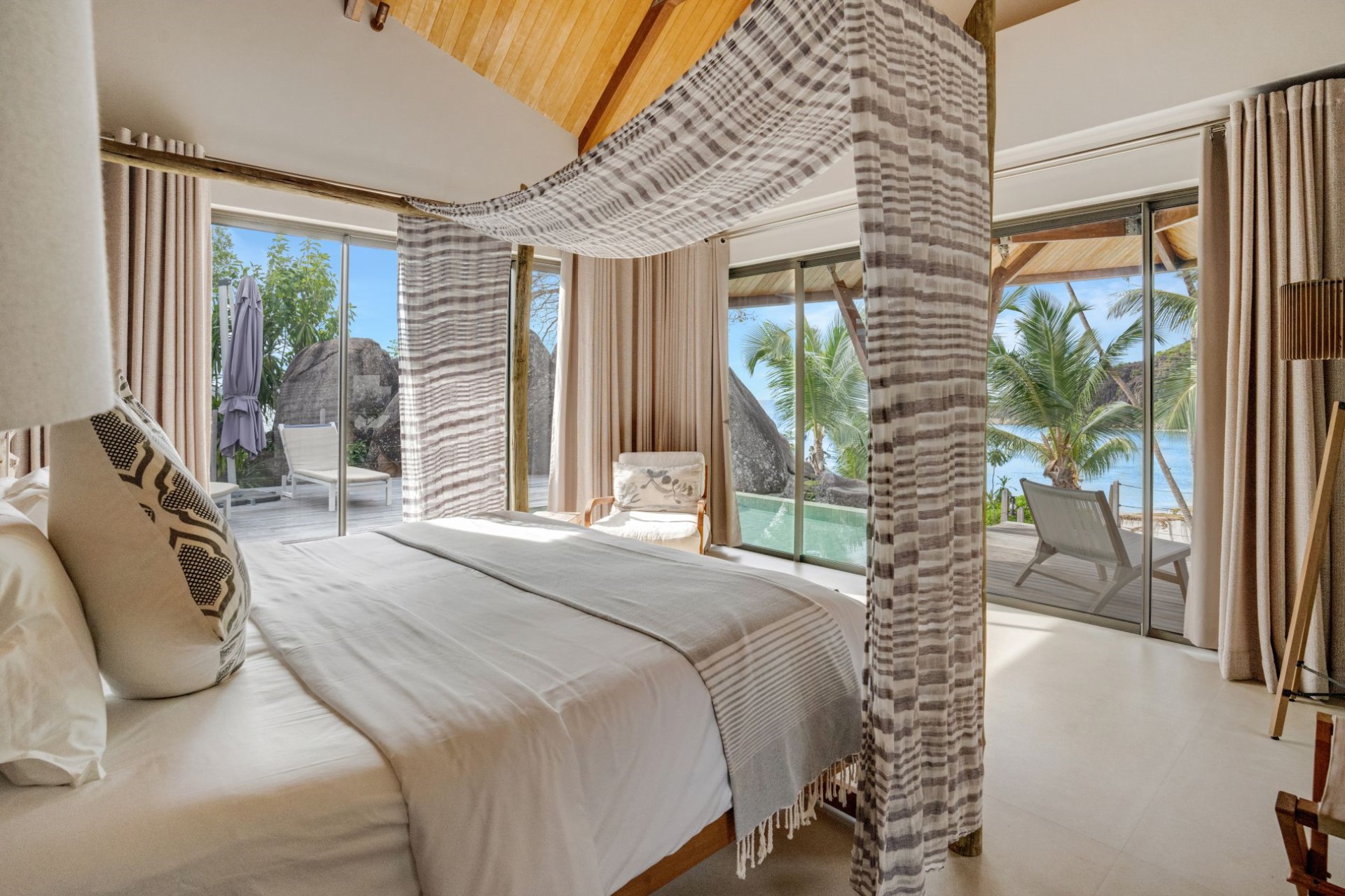 Bedroom 4 – double bed, sitting area, dressing room, en-suite bathroom with open-air shower, and private terrace with plunge pool and ocean views