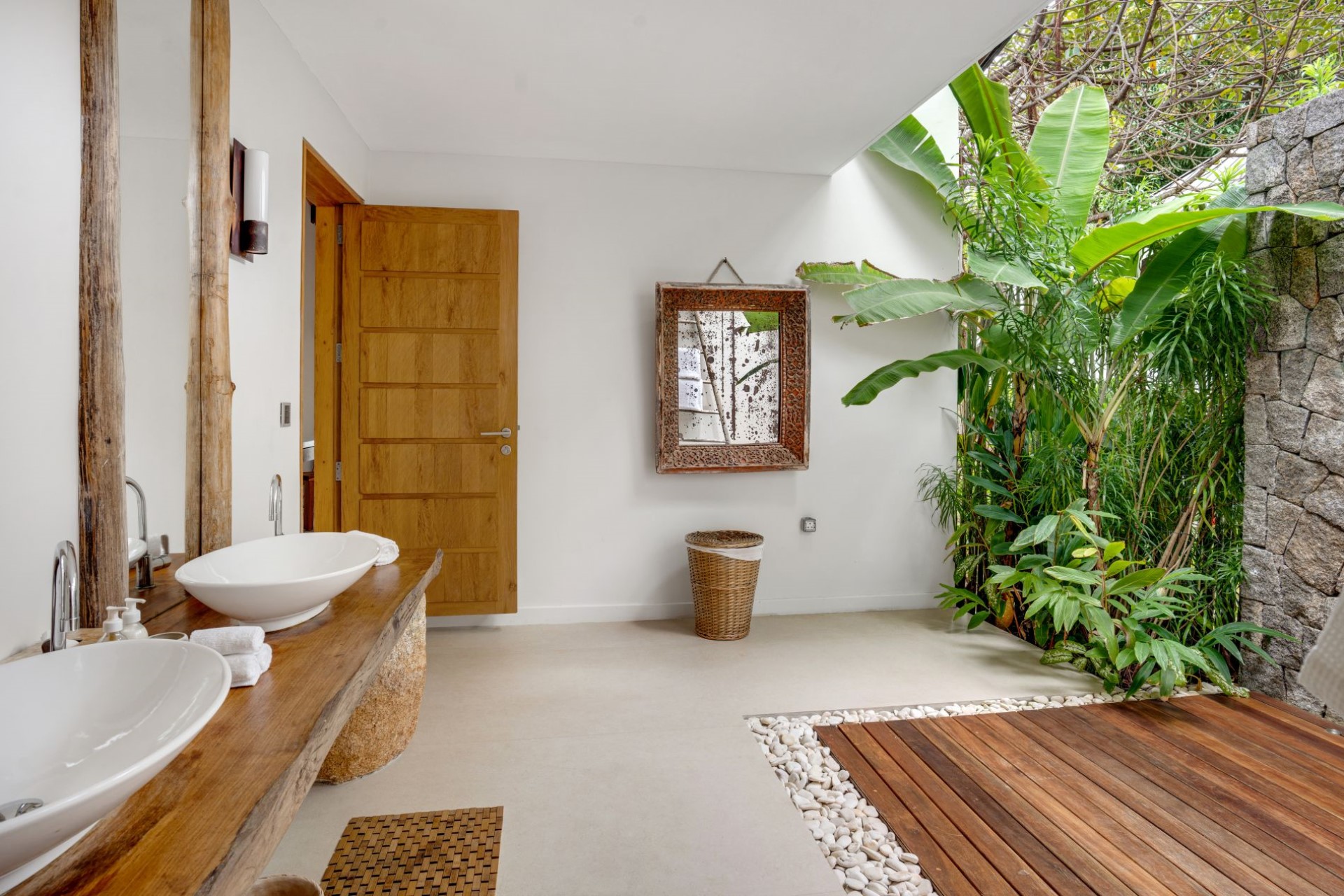 Bedroom 3 – double bed + 2 x trundle bed (suitable for children), sitting area, en-suite bathroom with open-air shower, and private terrace with garden views