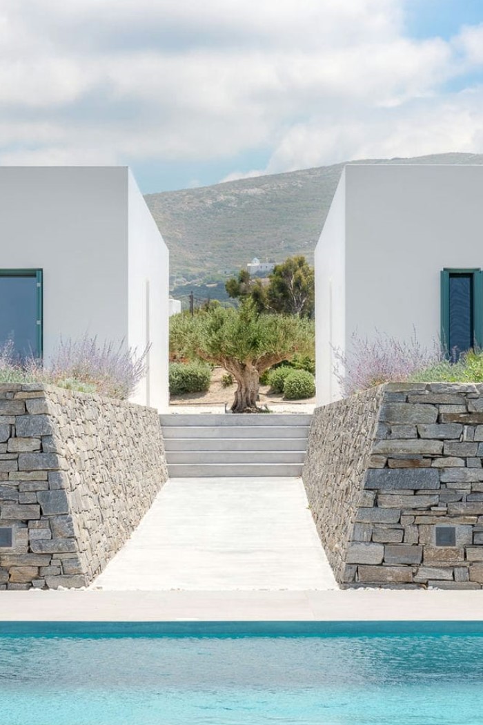 Comprised of two separate guest houses, the villa typically embodies the classic Cycladic architectural style, characterised by its clean, white lines, minimalist aesthetic, and seamless integration with the surrounding natural environment. A path separates the property’s two guest houses, leading to lush gardens on either side and a large infinity pool surrounded by an expansive pool terrace with spectacular views of the Bay of Naousa.