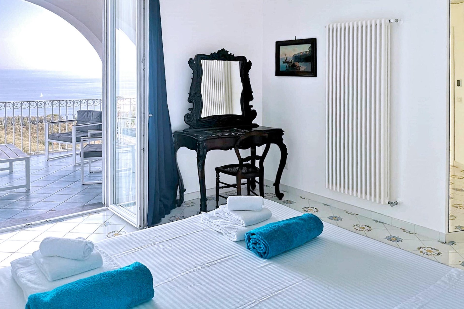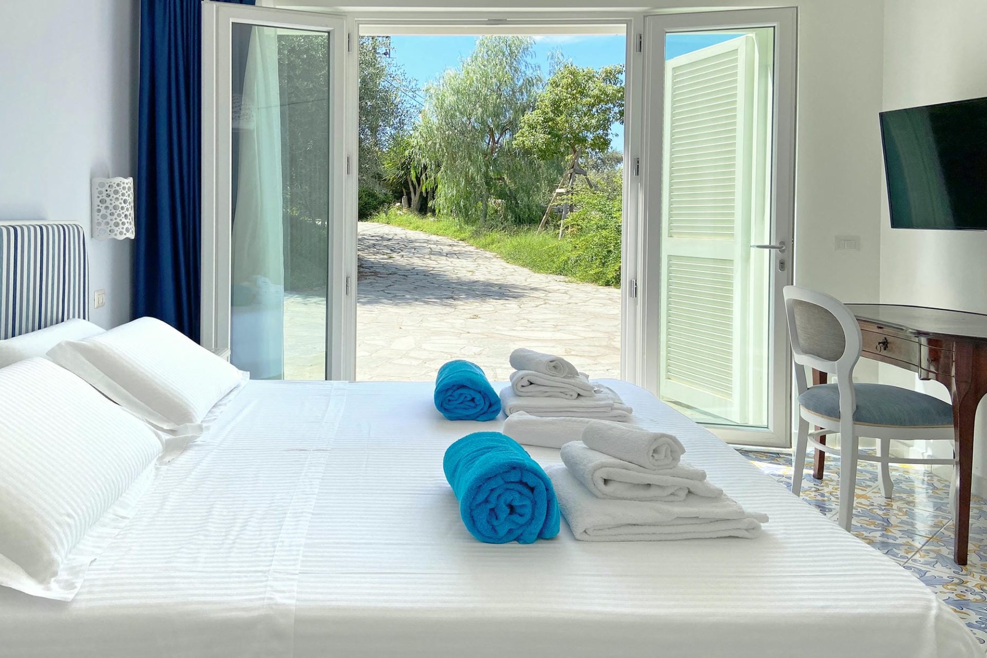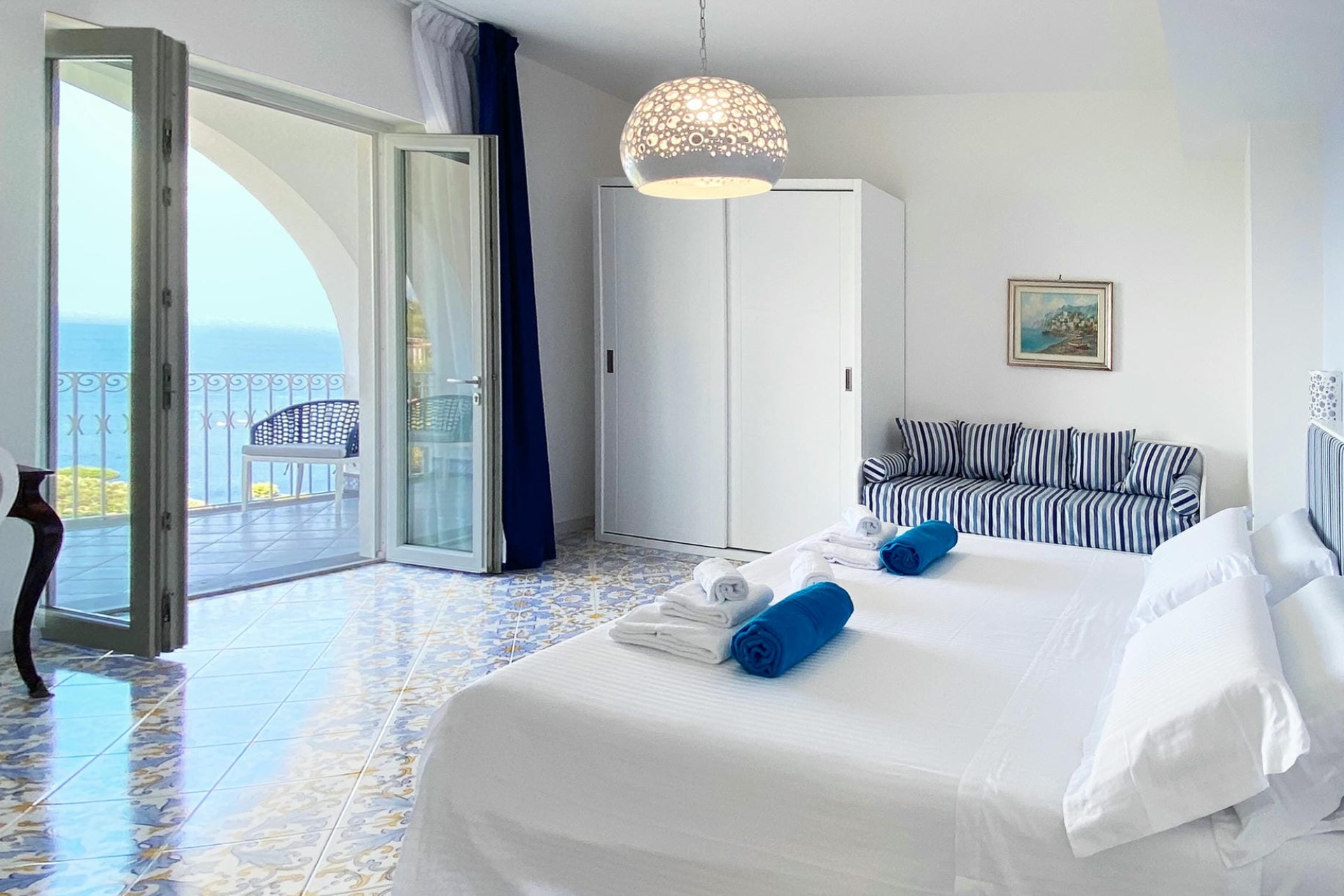Glicine Suite – king-size bed, en-suite bathroom with dual vanity & shower, terrace access, and sea views
