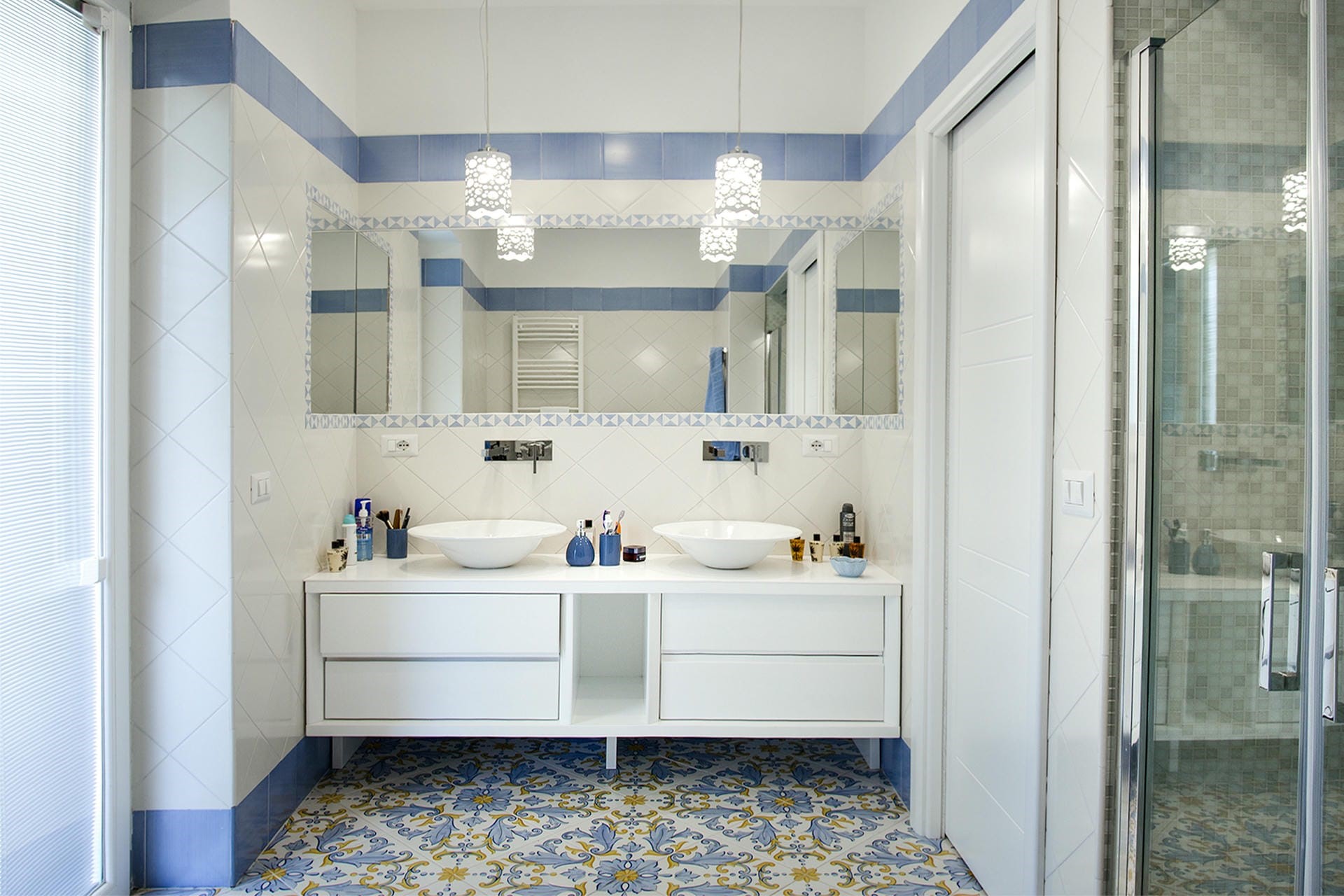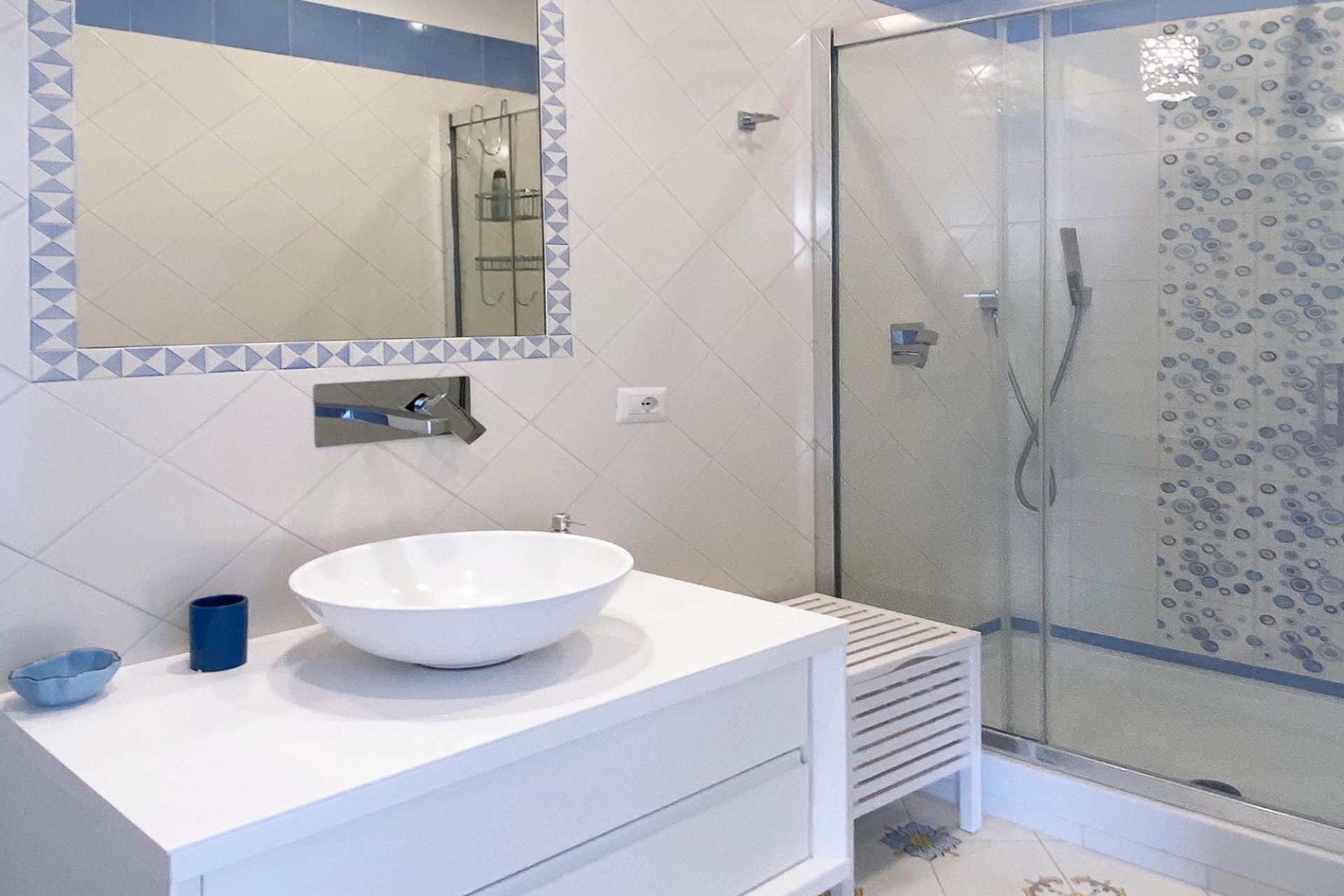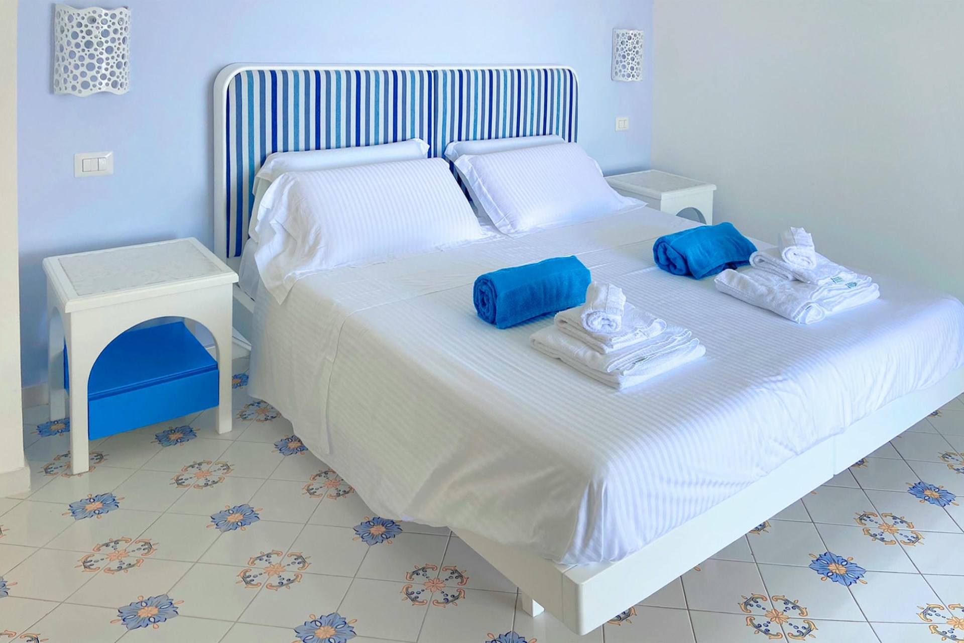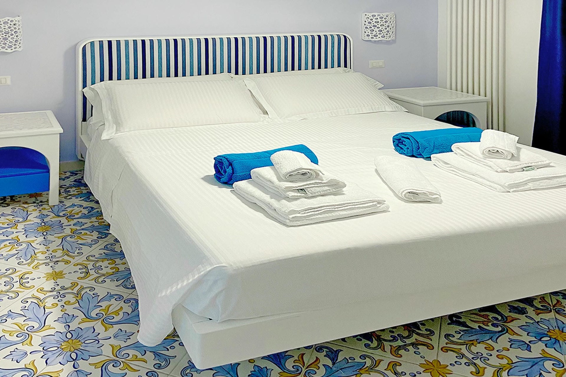 Glicine Suite – king-size bed, en-suite bathroom with dual vanity & shower, terrace access, and sea views