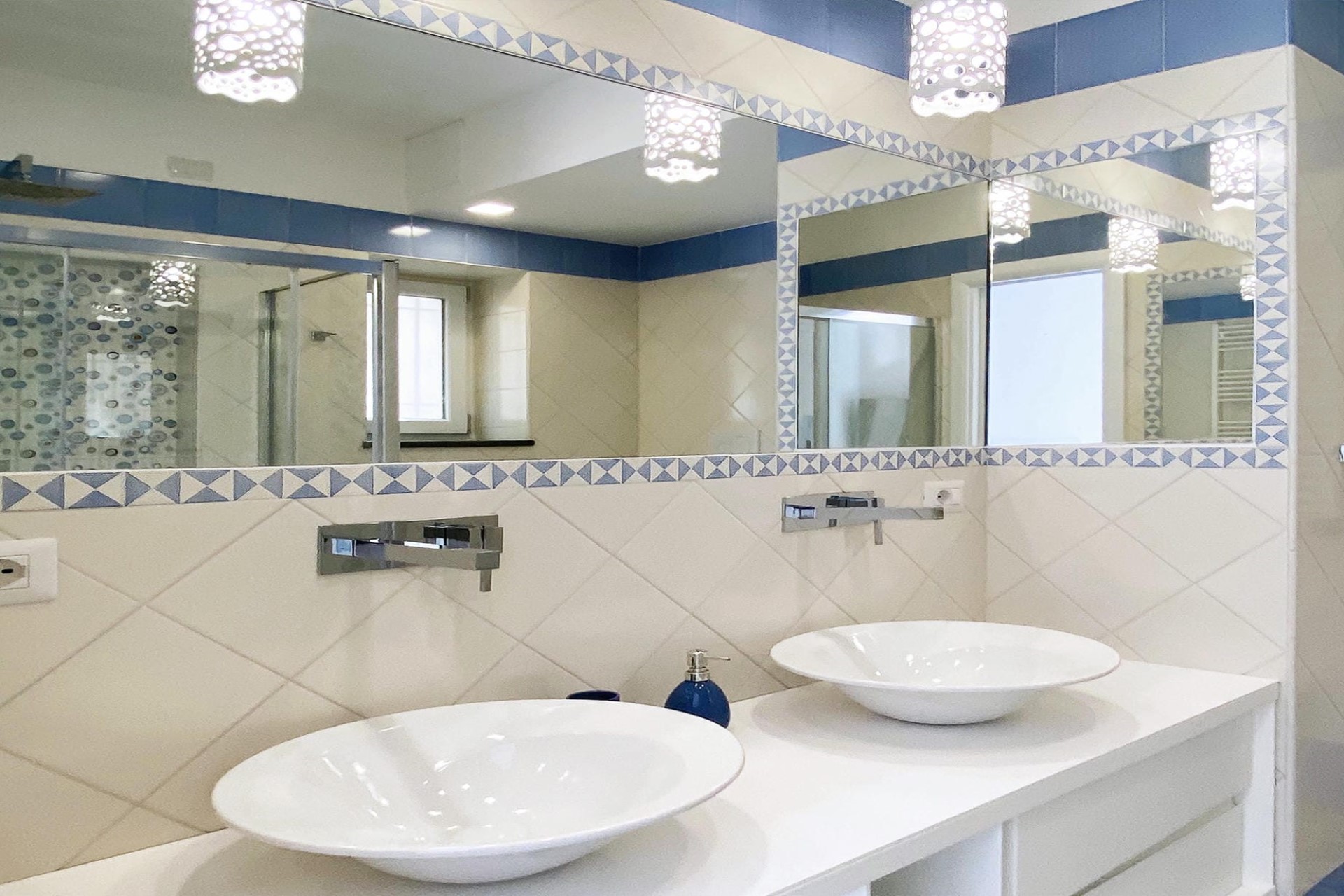 There are six en-suite bedrooms in total, each with a king or double bed and a fresh, airy style. Three are located upstairs, all with sea views and access to a long upper terrace, while one also boasts a private terrace. The three remaining bedrooms sit on the ground floor, including a sea-facing suite with terrace access, a garden-view suite, and a compact double tucked just behind, perfect for families travelling with children or teens.