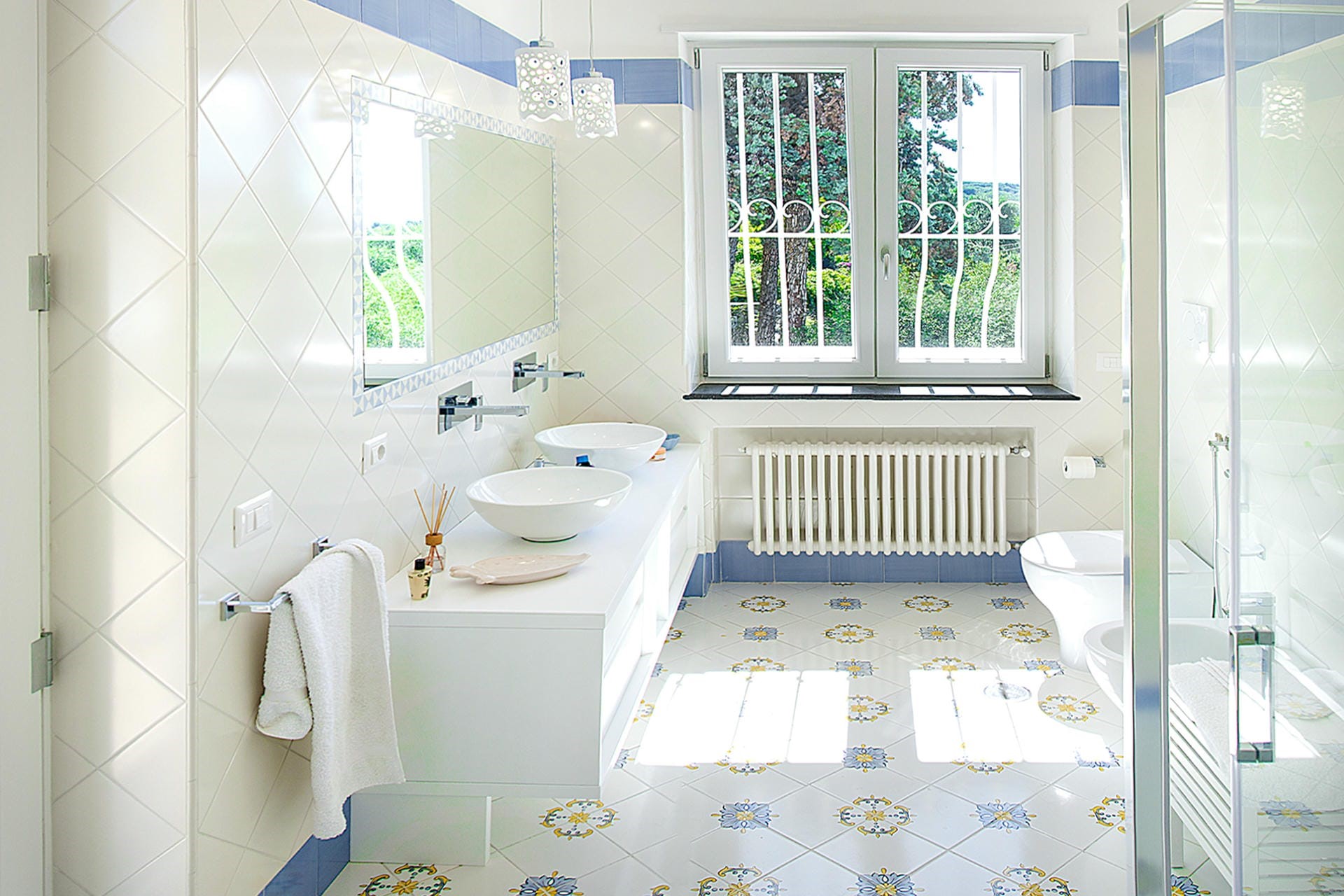 Inside, the villa’s interiors are crisp, bright and modern, with polished tile floors, sleek white walls and statement design pieces throughout. While the building is historic, the style is fresh and contemporary, from the curved sofas in the main lounge to the carefully chosen artwork and sculptural lighting. A formal dining room provides a space to gather indoors, and the kitchen is well-equipped for private use or chef-prepared meals. The overall layout works well for groups, striking a balance between shared spaces and quieter corners.