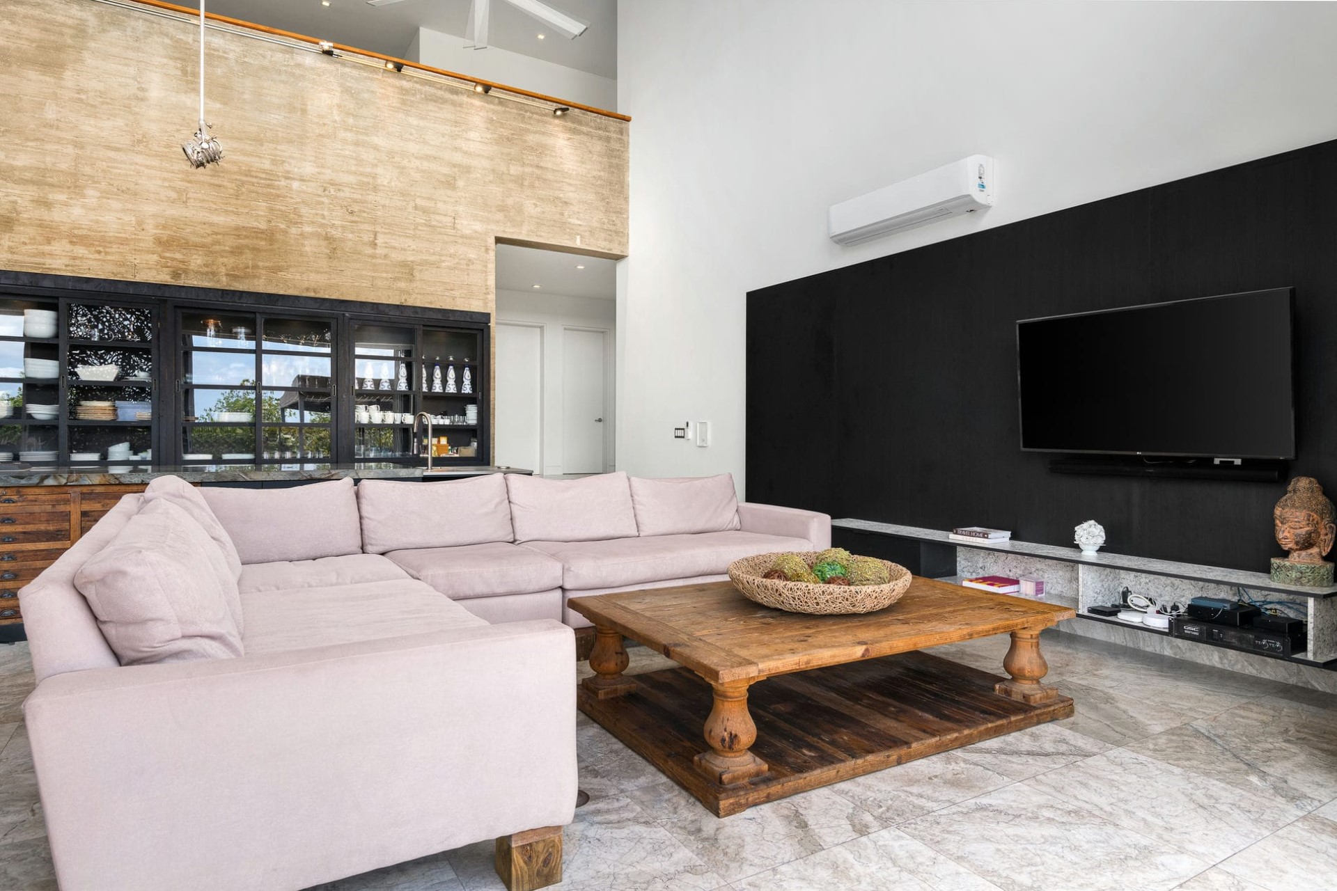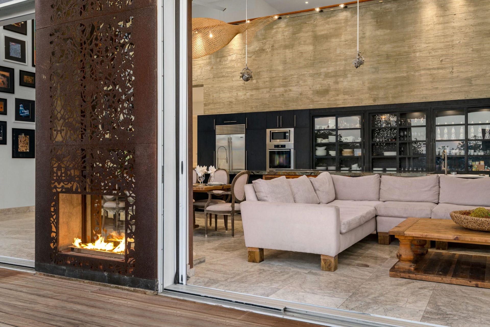 Floor-to-ceiling windows and sliding glass doors right along the villa façade blend the outdoors and in, whilst the 30-foot ceilings create a light and spacious feel. The elegant living space area features plush lounge seating surrounding a flat-screen TV and a beautiful wooden dining table. A stunning double-sided, indoor-outdoor fireplace warms the space, whilst a collage of artworks spreading up the double-height wall adds to the modern feel.
