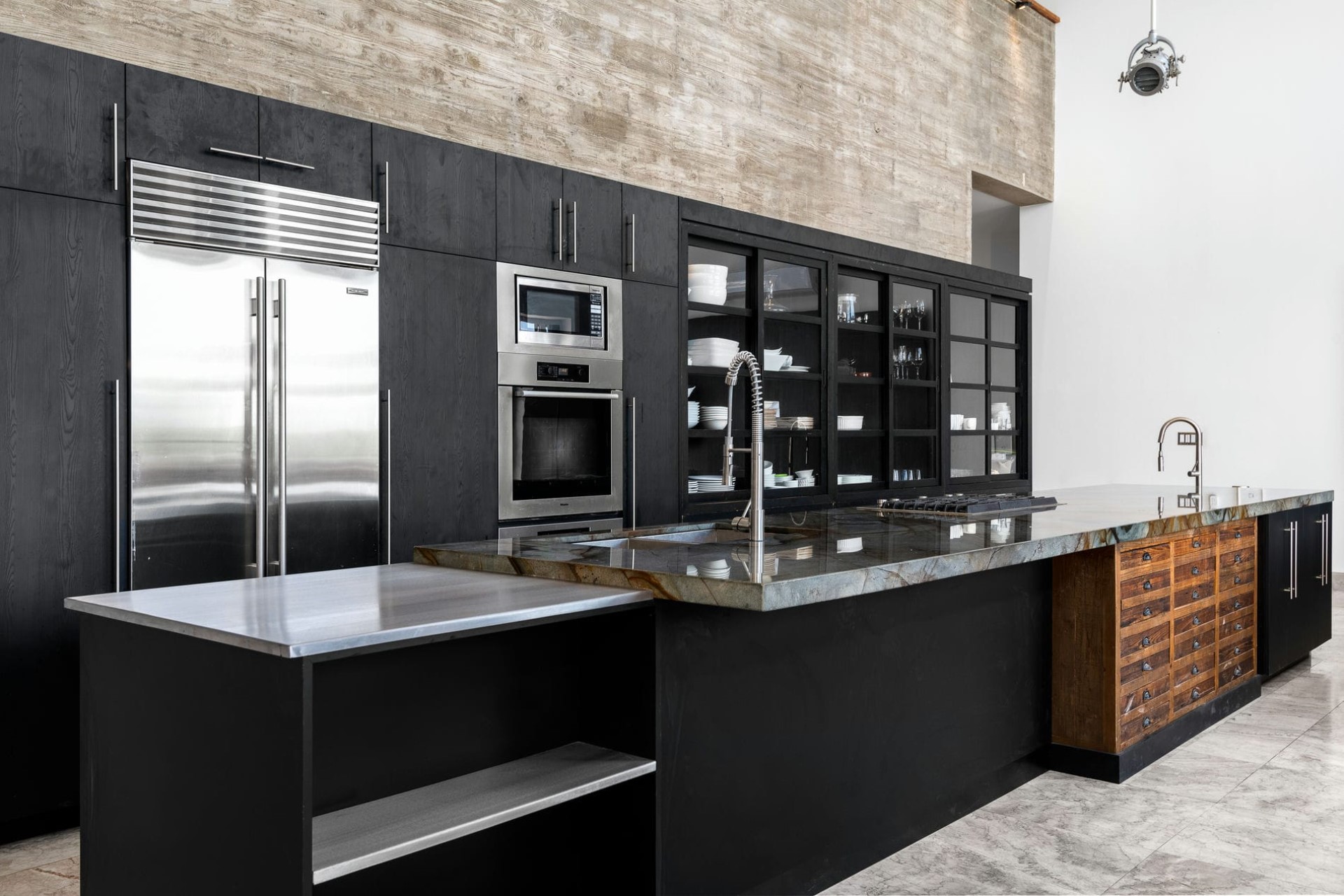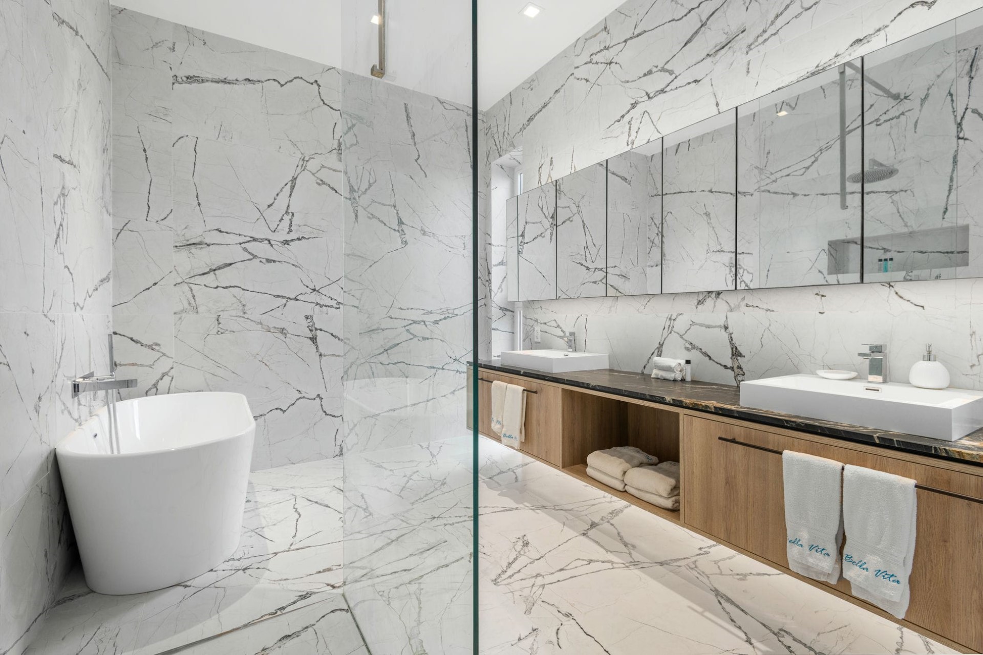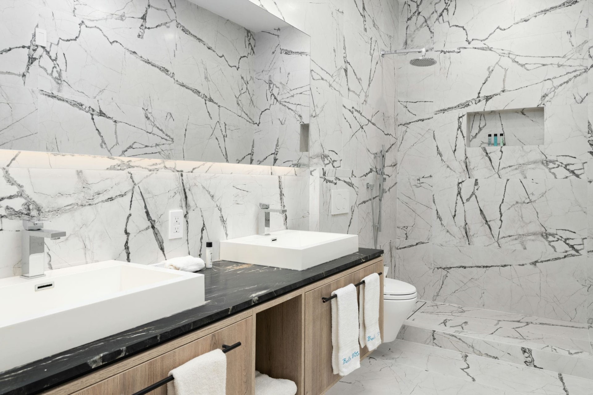 Stretching behind the lounge and dining areas is the modern and elegant kitchen. It is fully equipped with stainless steel appliances and features a beautiful and sleek marble kitchen island.