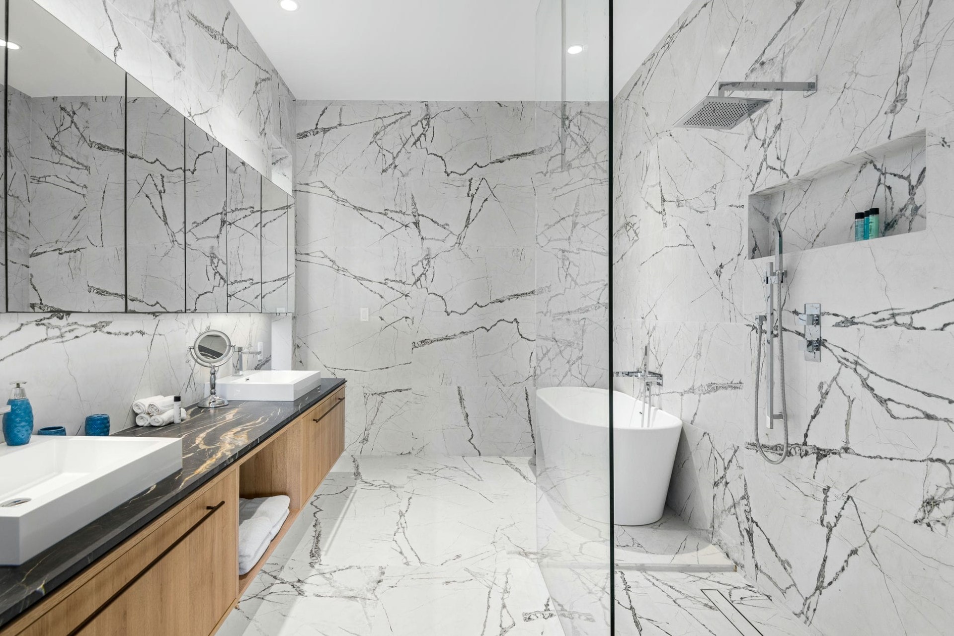 Bedroom 1 – king-size bed, en-suite bathroom with double vanity, bathtub & separate shower, and private balcony with ocean views