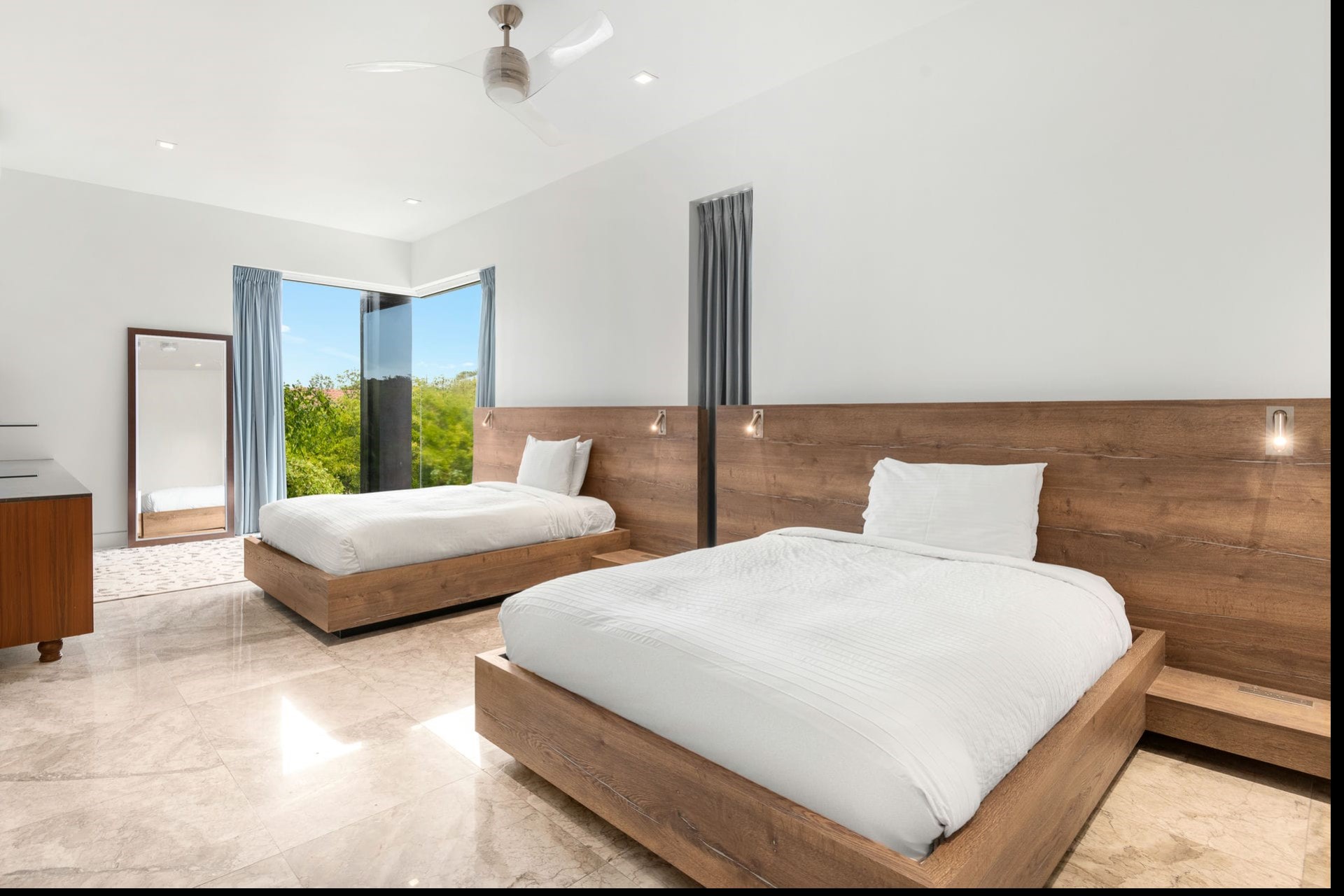 Across the main villa and the separate garden villa, nine well-appointed bedrooms sleep up to 18 guests. For larger groups, the games room can be converted to a 10th bedroom with a queen-size sofa bed. There are four ocean-view bedrooms with private balconies or terraces split across the ground and first floors, plus three bedrooms on the other side with tranquil garden views.