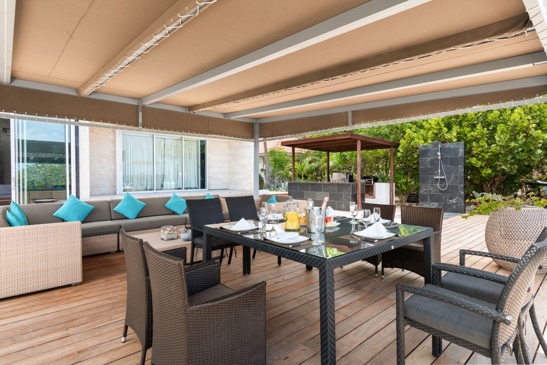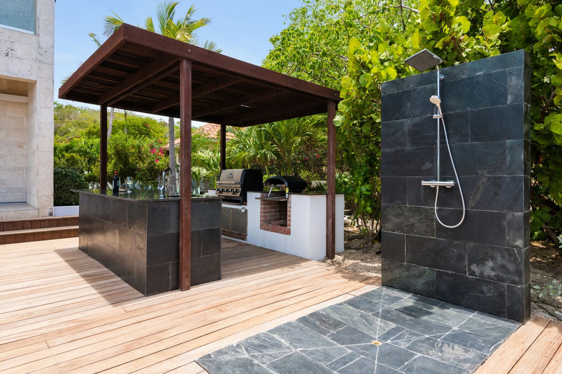 A pergola-shaded outdoor lounge and dining area is ideal for post-swim relaxation and outdoor dining. Behind the pergola is a well-equipped outdoor kitchen with a barbecue and a wood-fired grill.