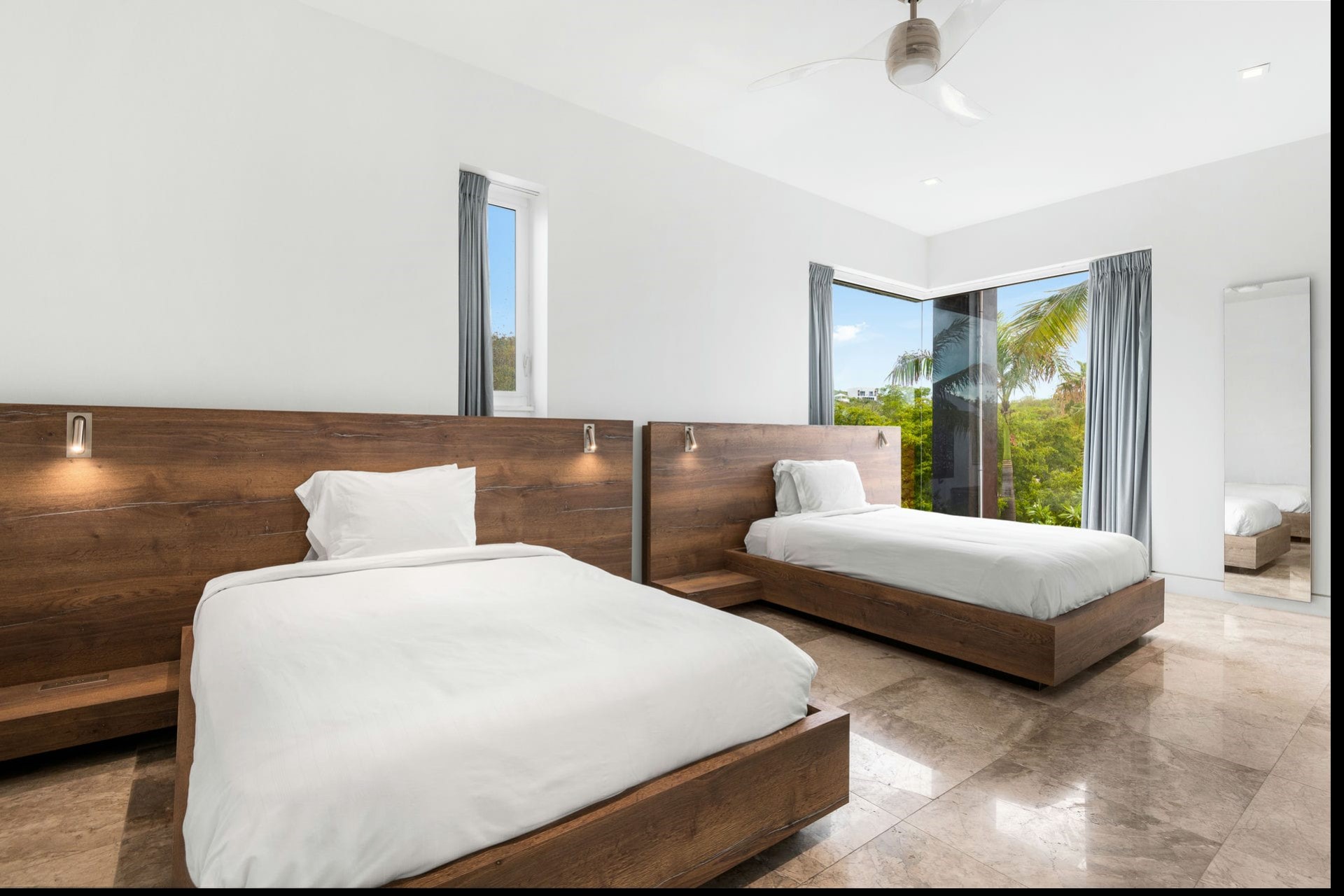 Bedroom 2 – 2 x double bed, en-suite bathroom with double vanity & shower, and garden views