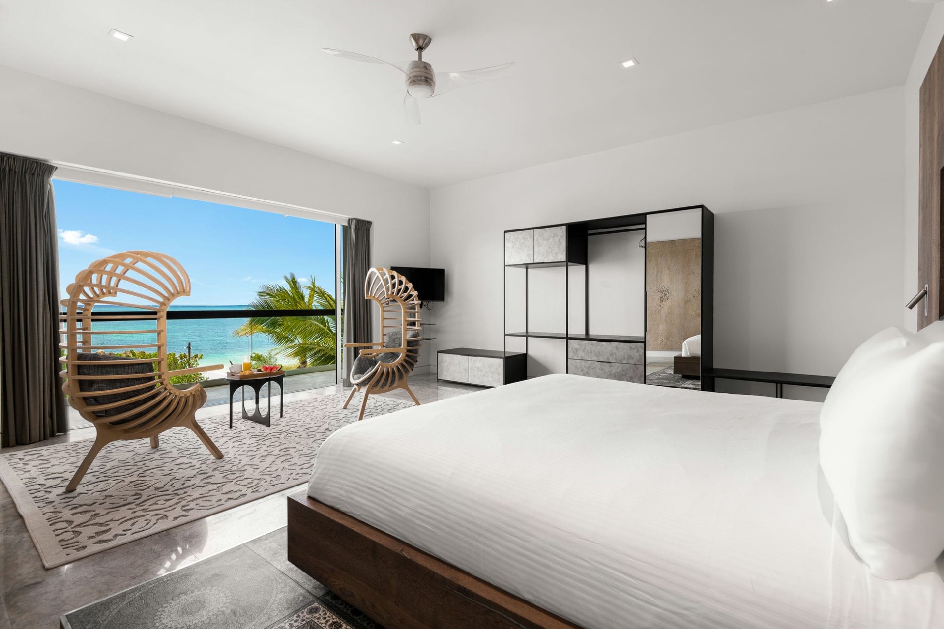 Bedroom 3 – king-size bed, en-suite bathroom with double vanity, bathtub & separate shower, and private balcony with ocean views
