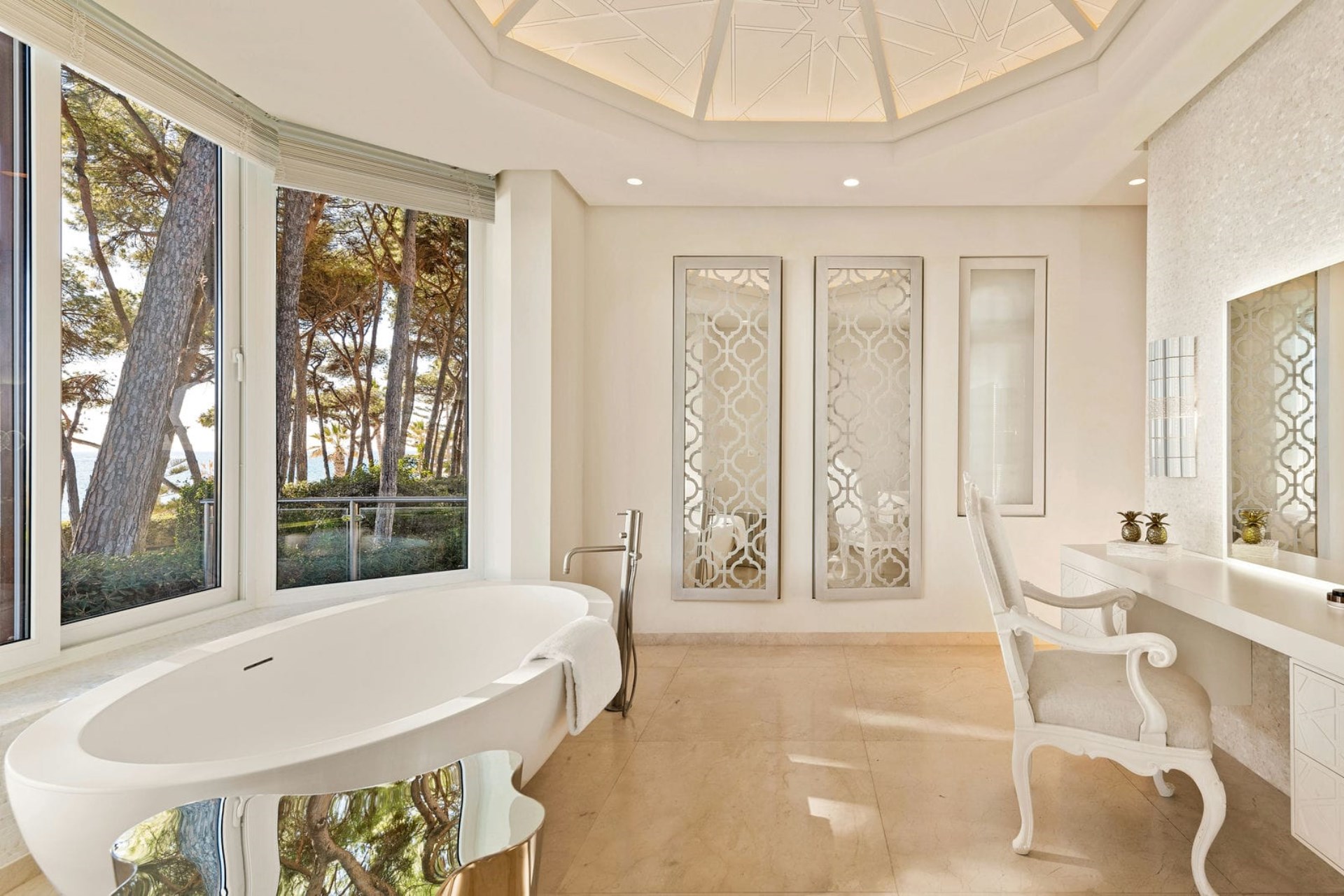 Master Bedroom 1 – king-size bed, sitting area, walk-in wardrobe, en-suite bathroom with dressing table, double vanity, bathtub & separate shower, and private terrace with sea views
