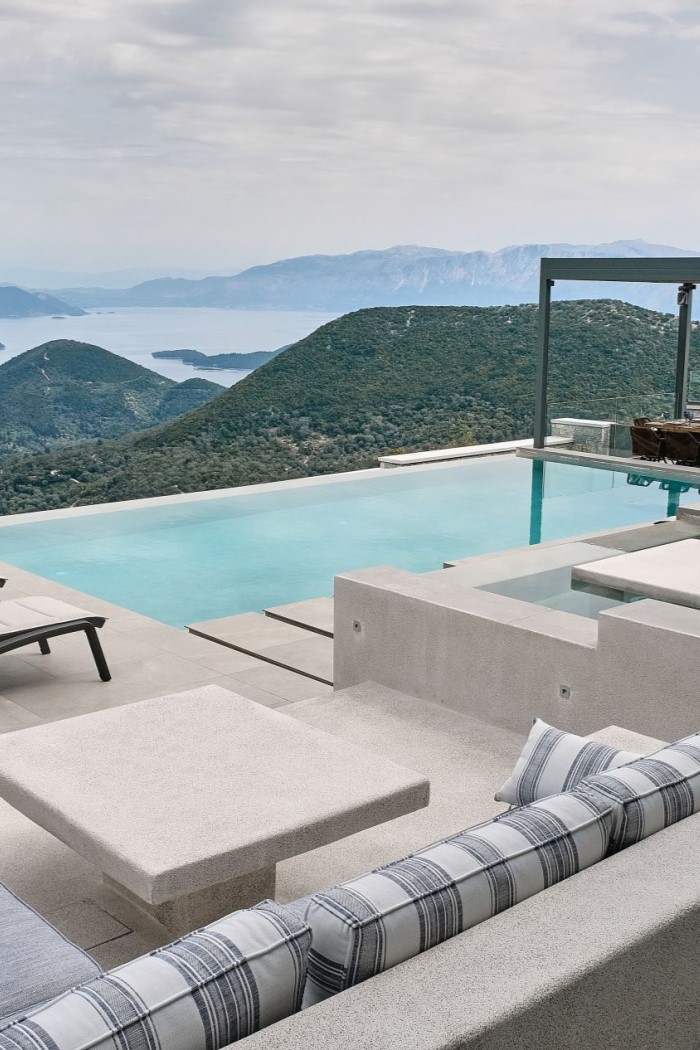 The villa is located in the peaceful hilltop village of Fterno, surrounded by olive groves and overlooking the towns Nydri and Vlicho. It has an authentic Greek feel, with the quaint village centre offering just a couple traditional tavernas. However, the lively port town of Nydri is easily accessible, just 15 minutes away by car.