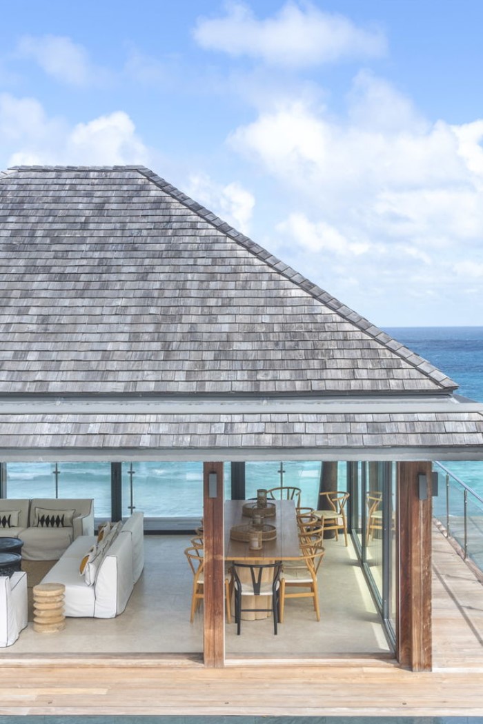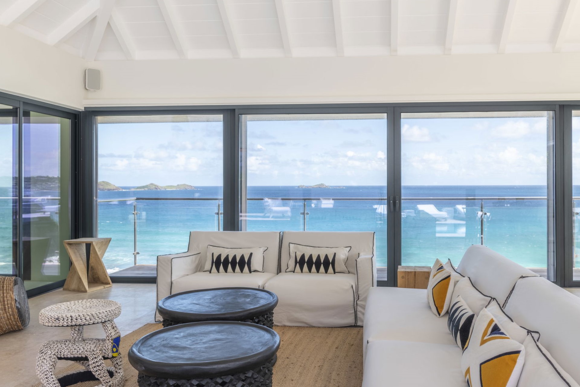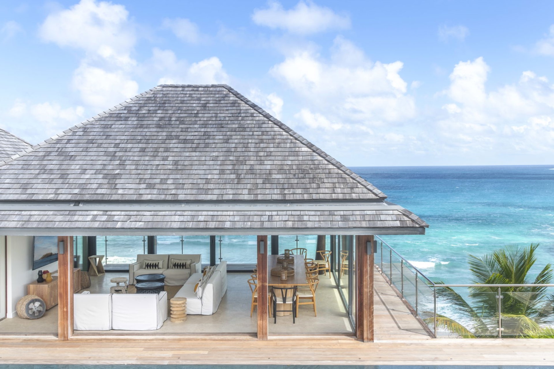 The villa’s interior features two spacious, air-conditioned living rooms furnished with comfortable sofas and large wooden dining tables, creating welcoming spaces for relaxation and entertainment. The high vaulted ceilings and large windows allow natural light to flood the rooms, enhancing the airy ambience and offering stunning ocean views. The fully equipped gourmet kitchen is perfect for preparing meals, while its connection to the outdoor bar facilitates seamless indoor-outdoor living.