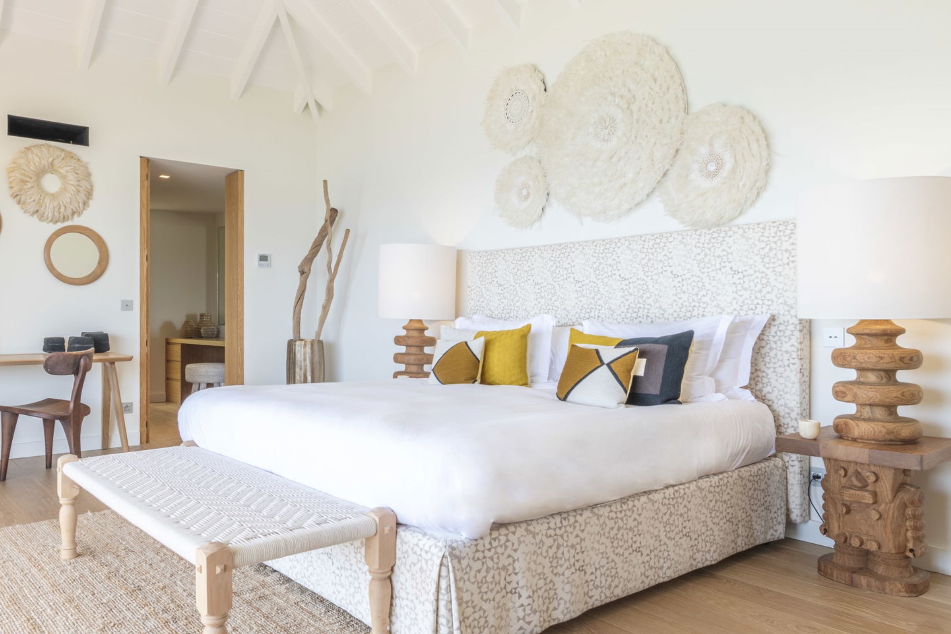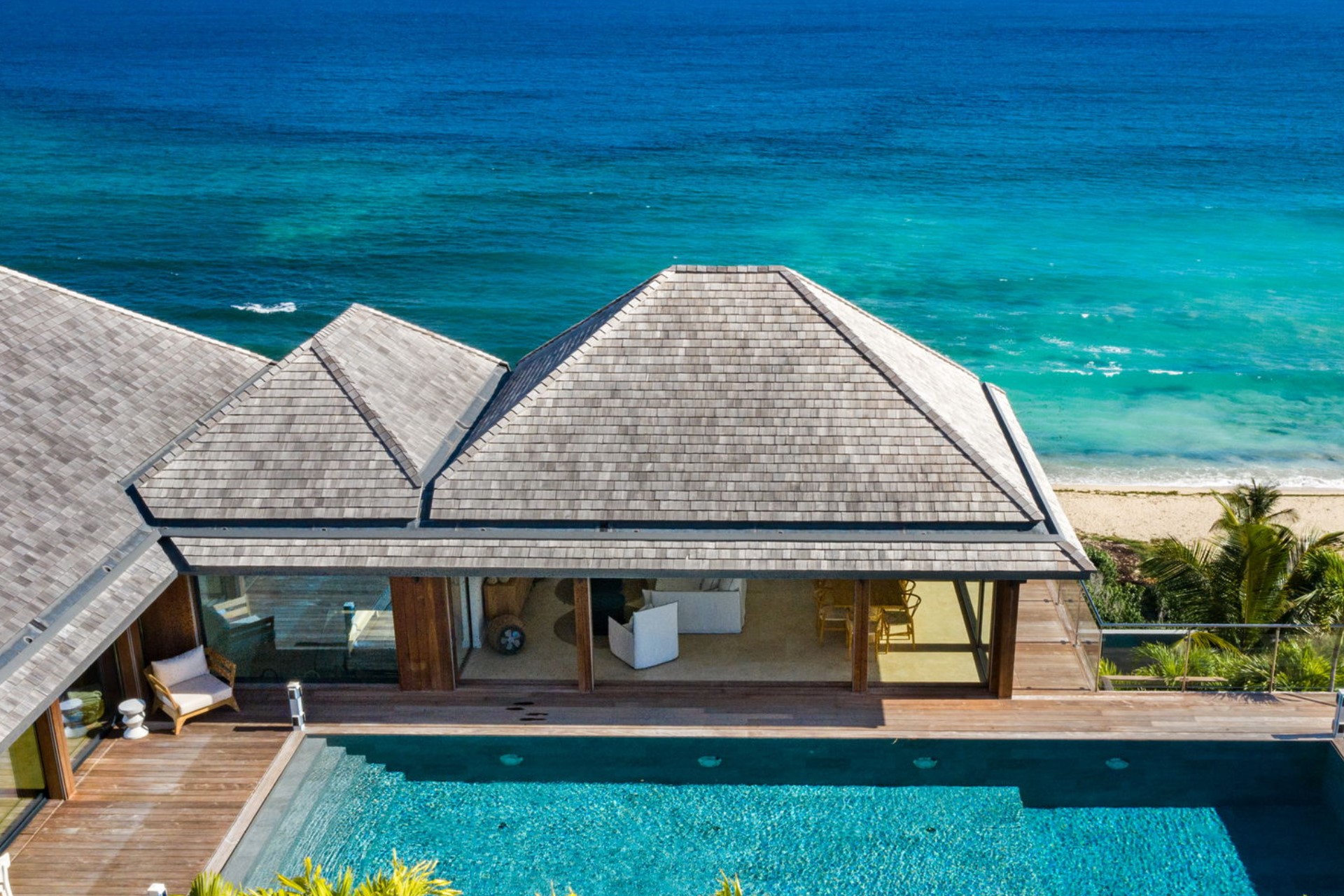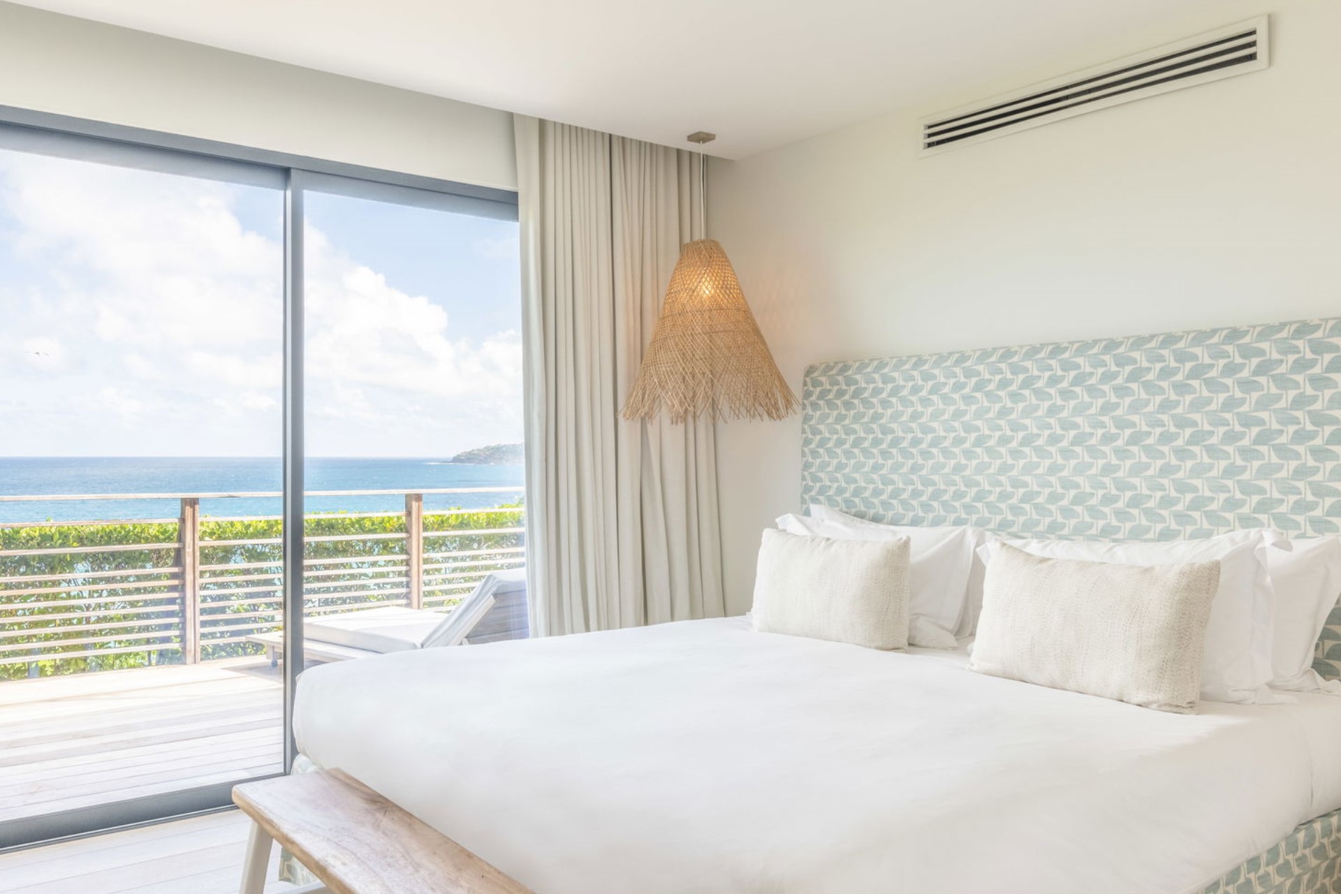 Each of the seven air-conditioned bedrooms is thoughtfully designed to offer privacy and comfort, featuring king-size beds, en-suite bathrooms, and private terraces with ocean views. The master bedroom is located in a separate pavilion at the top of the property, offering additional privacy, while the other six suites are spread over the two levels of the main building. This layout ensures a harmonious balance between shared and private spaces, catering to the needs of all guests.