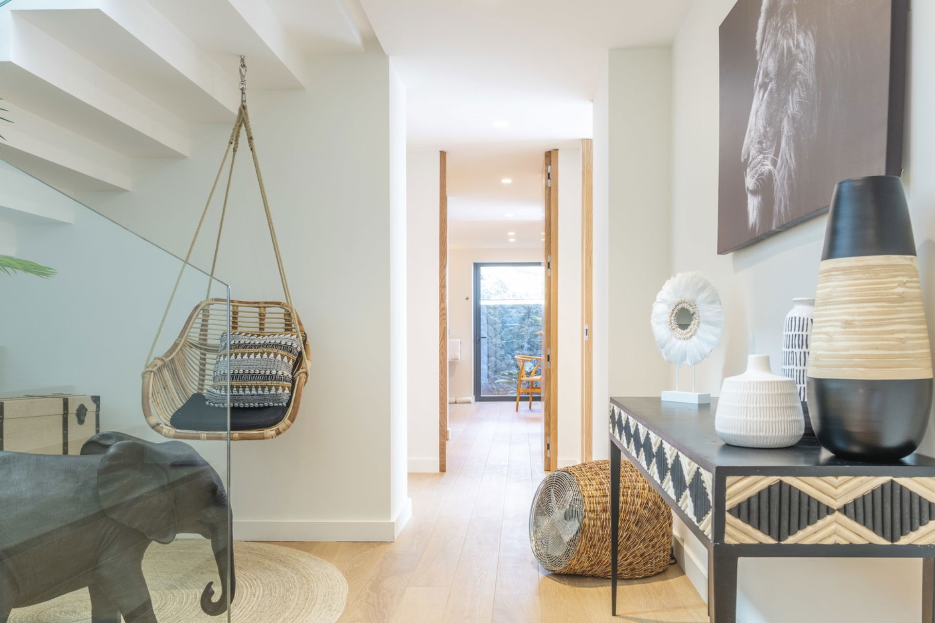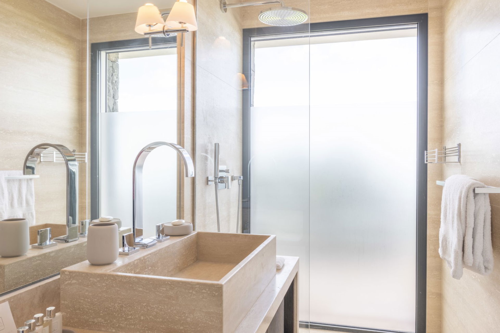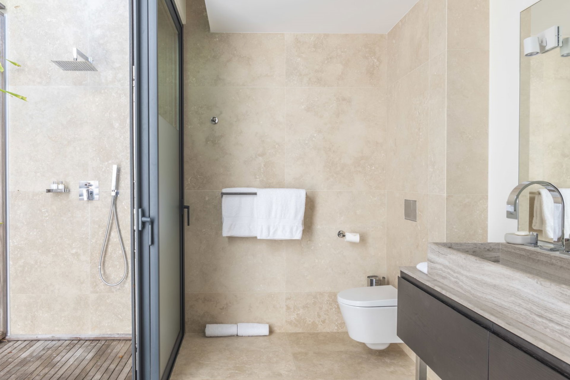 Each of the seven air-conditioned bedrooms is thoughtfully designed to offer privacy and comfort, featuring king-size beds, en-suite bathrooms, and private terraces with ocean views. The master bedroom is located in a separate pavilion at the top of the property, offering additional privacy, while the other six suites are spread over the two levels of the main building. This layout ensures a harmonious balance between shared and private spaces, catering to the needs of all guests.