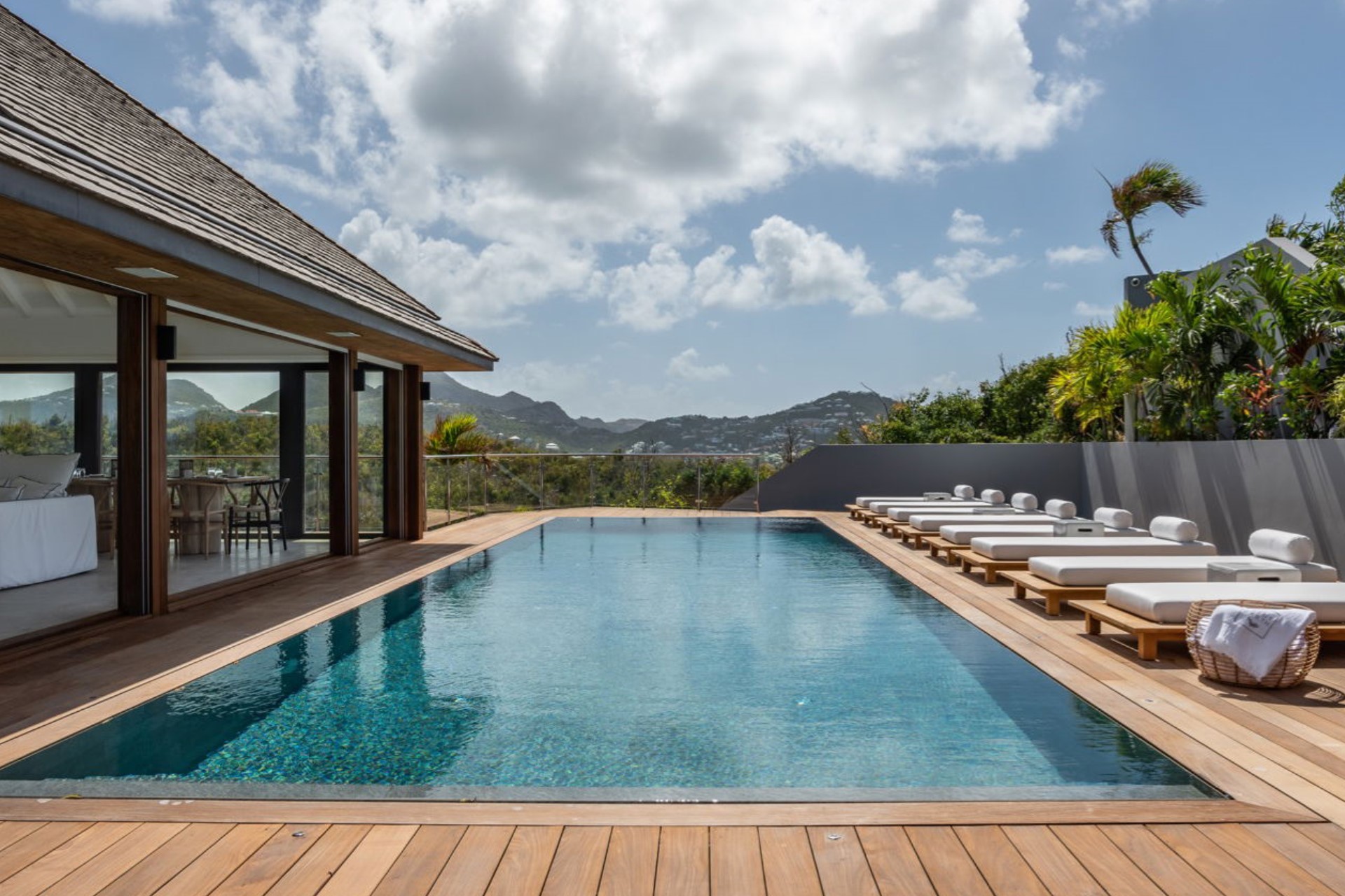 The outdoor area is designed for both relaxation and enjoyment, featuring a large heated infinity pool with steps, perfect for unwinding while taking in the beauty of St Barths. The surrounding terrace is furnished with sun loungers, providing an ideal setting for sunbathing or reading.