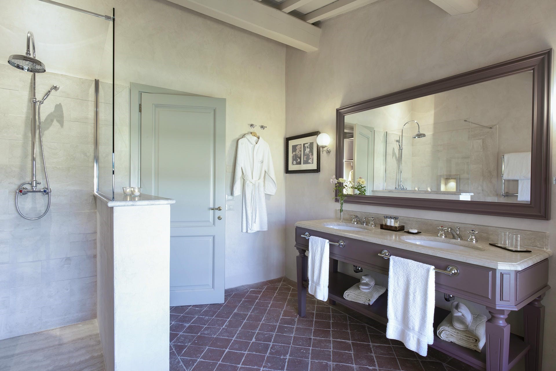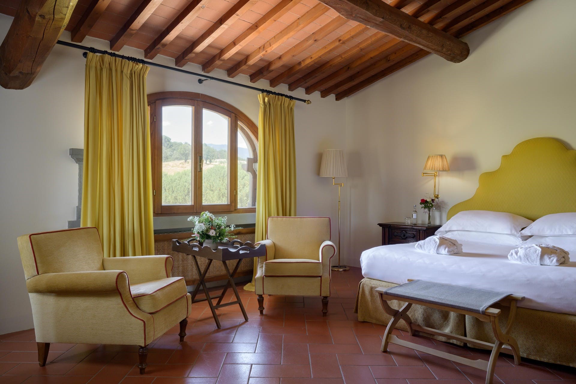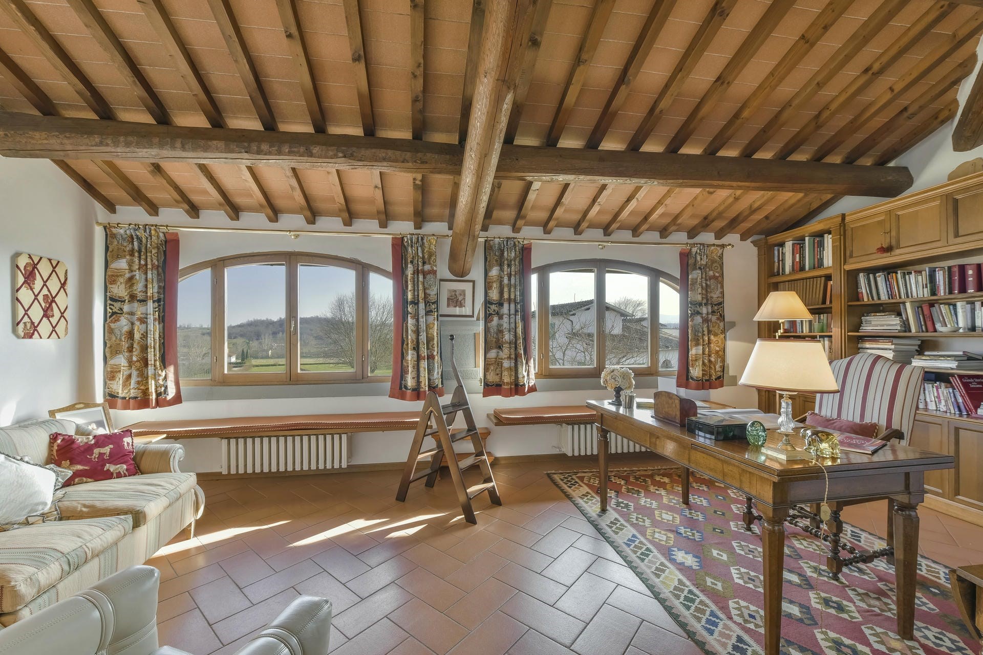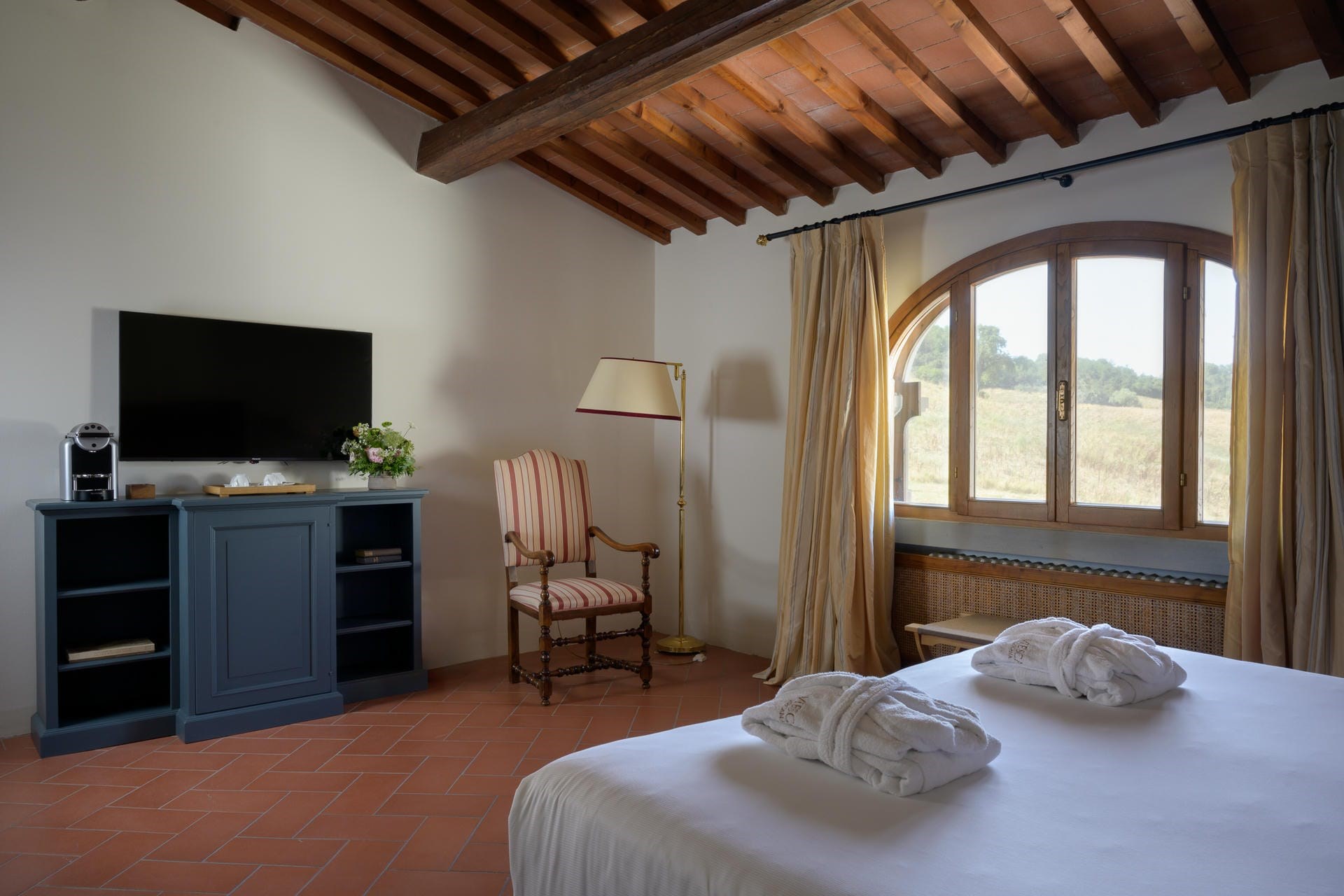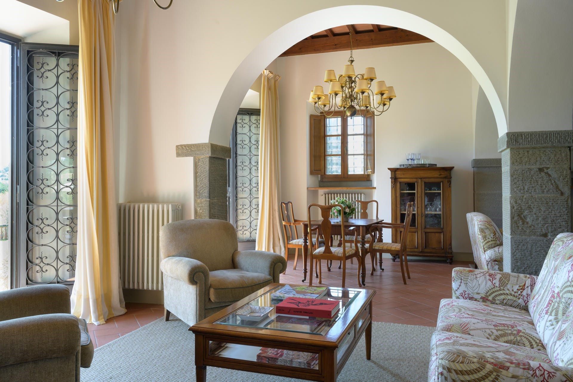 Heading into the main villa via the typical Tuscan loggia and into the main entrance hall, guests are greeted with a vast living area, featuring two French doors, opening out onto the terrace giving spectacular views of the Tuscan landscape. Beautiful high ceilings with partially exposed beams add a sense of warmth and charm to this enchanting property, and guests can relax on sumptuous sofas and enjoy the view.