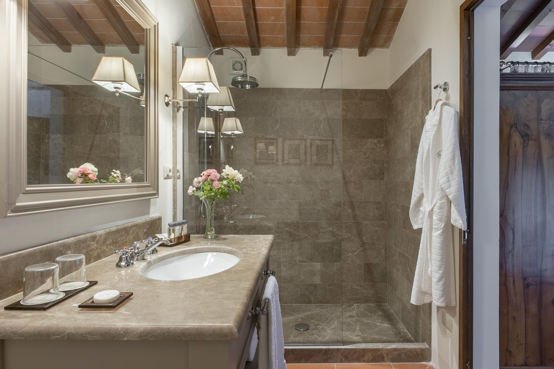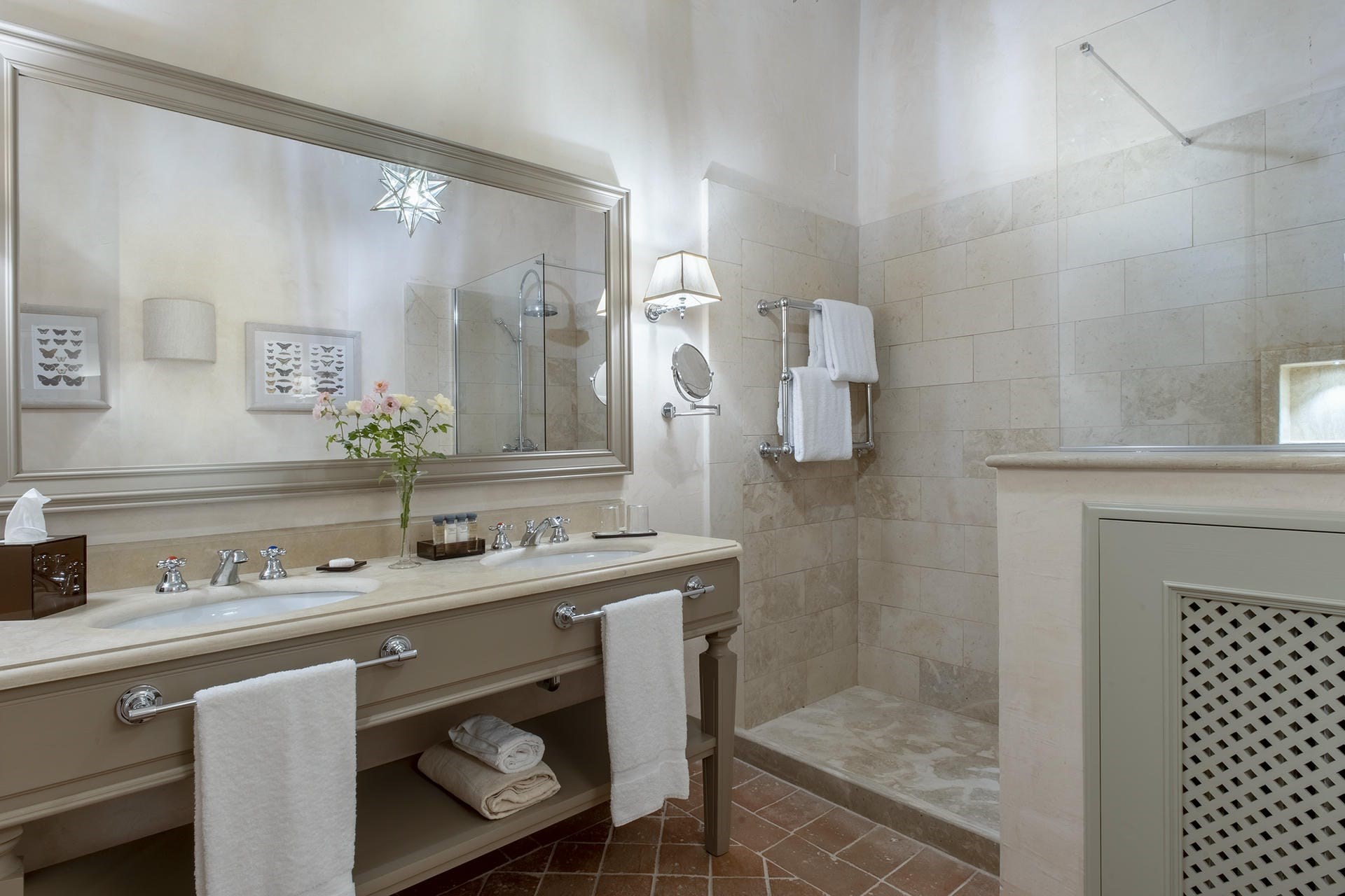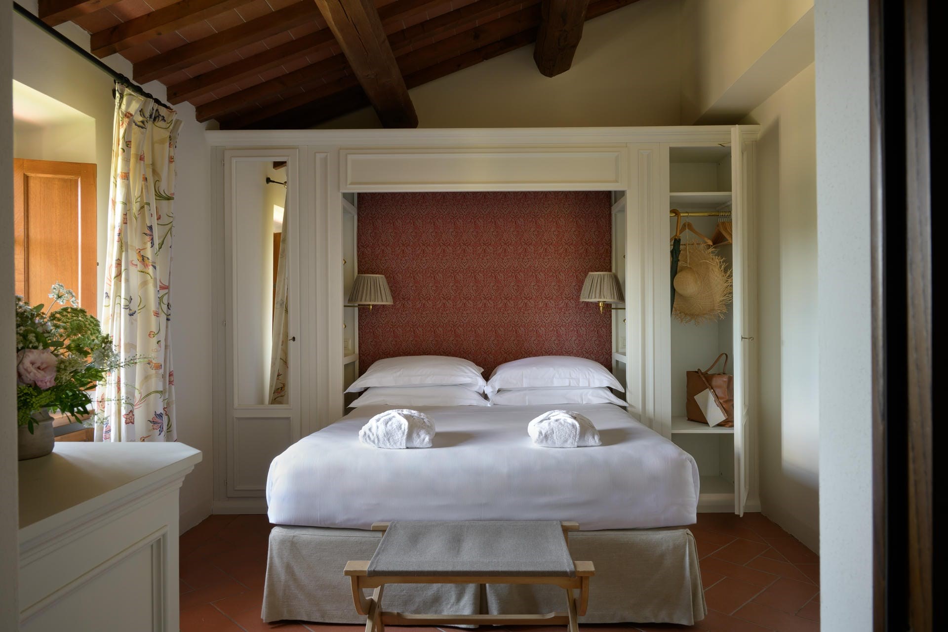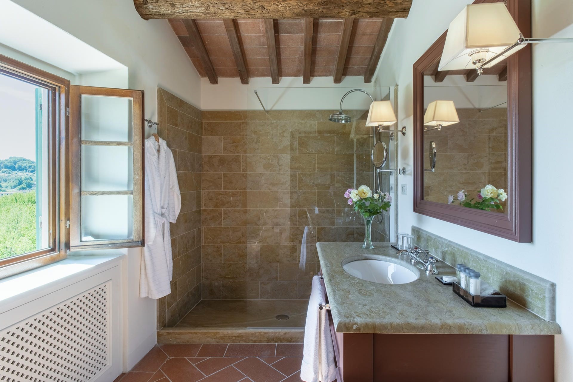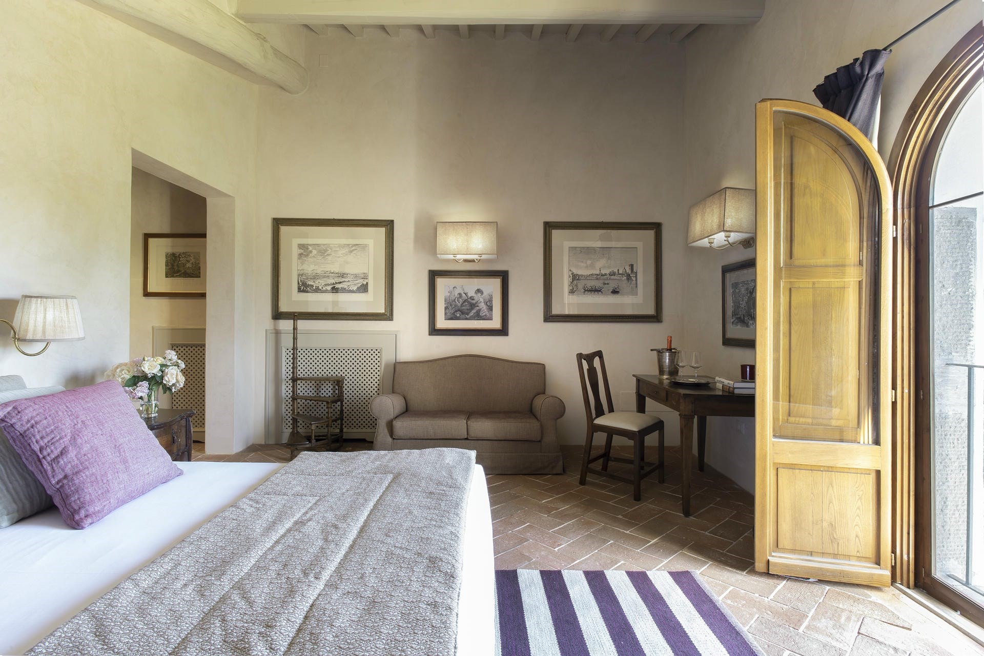 Heading into the main villa via the typical Tuscan loggia and into the main entrance hall, guests are greeted with a vast living area, featuring two French doors, opening out onto the terrace giving spectacular views of the Tuscan landscape. Beautiful high ceilings with partially exposed beams add a sense of warmth and charm to this enchanting property, and guests can relax on sumptuous sofas and enjoy the view.