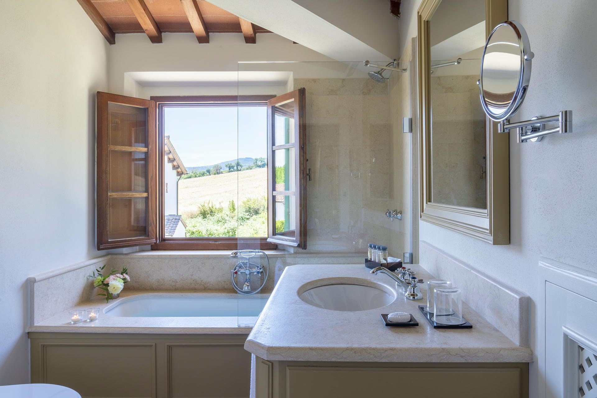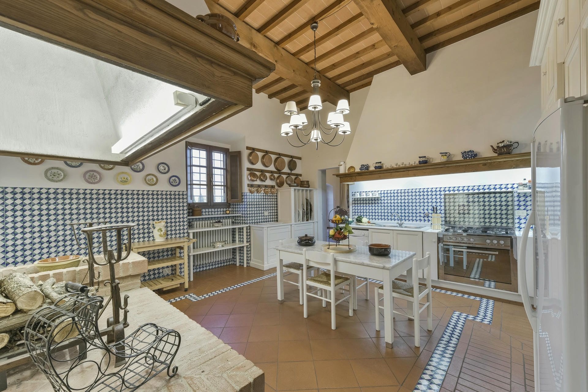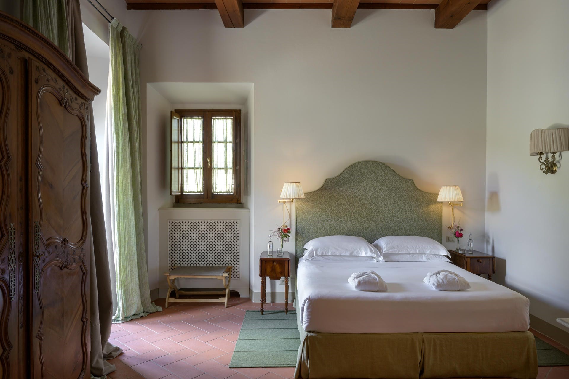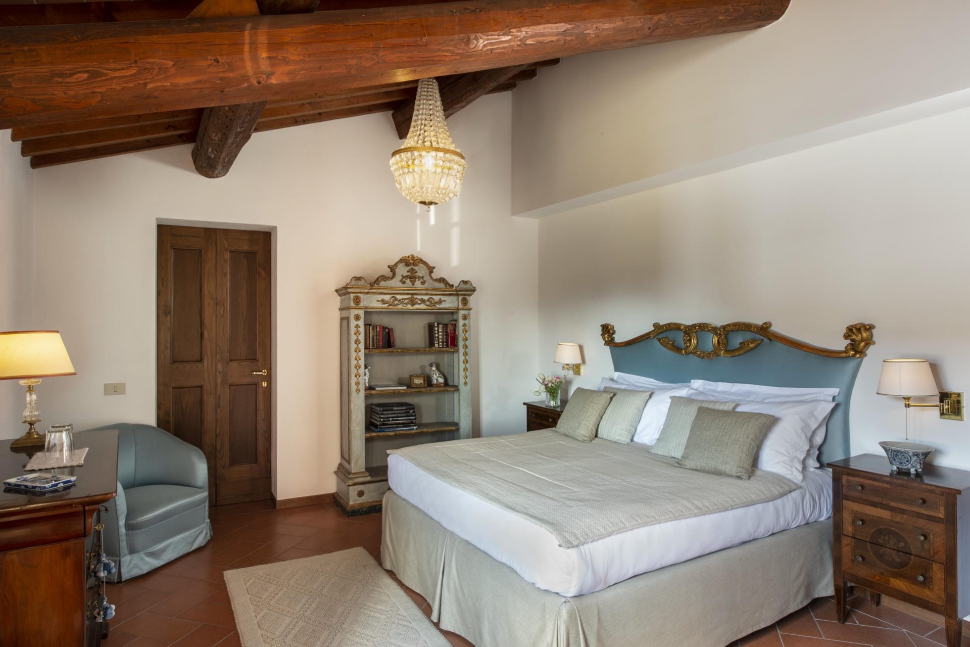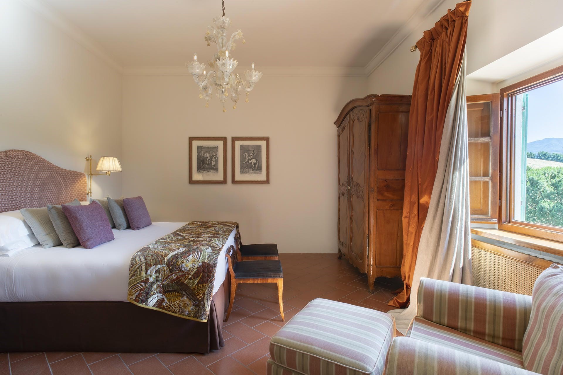 Heading into the main villa via the typical Tuscan loggia and into the main entrance hall, guests are greeted with a vast living area, featuring two French doors, opening out onto the terrace giving spectacular views of the Tuscan landscape. Beautiful high ceilings with partially exposed beams add a sense of warmth and charm to this enchanting property, and guests can relax on sumptuous sofas and enjoy the view.