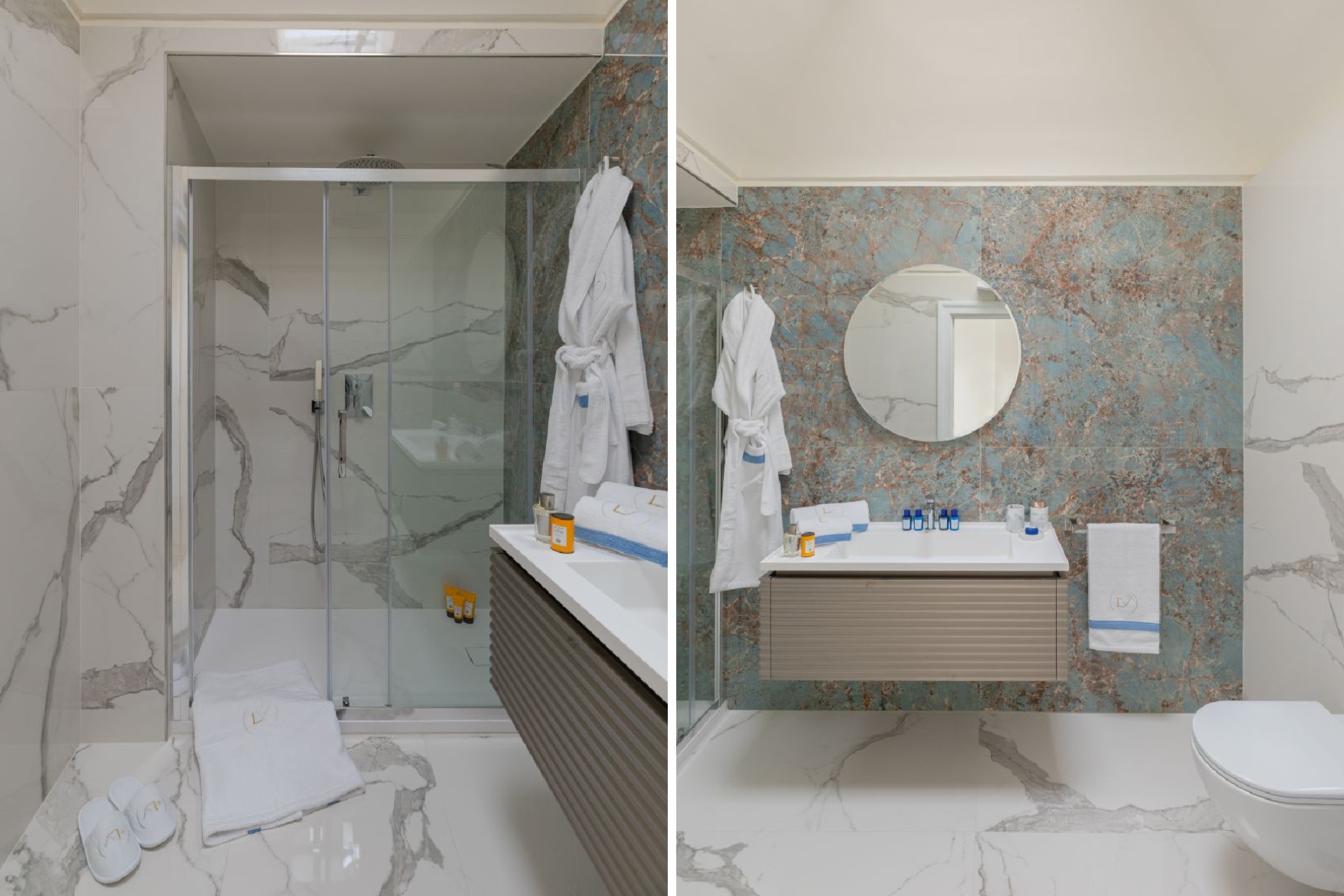 Master Suite – double bed, walk-in wardrobe, en-suite bathroom with shower, private living room with lounge area, fireplace & dining table, and direct terrace access