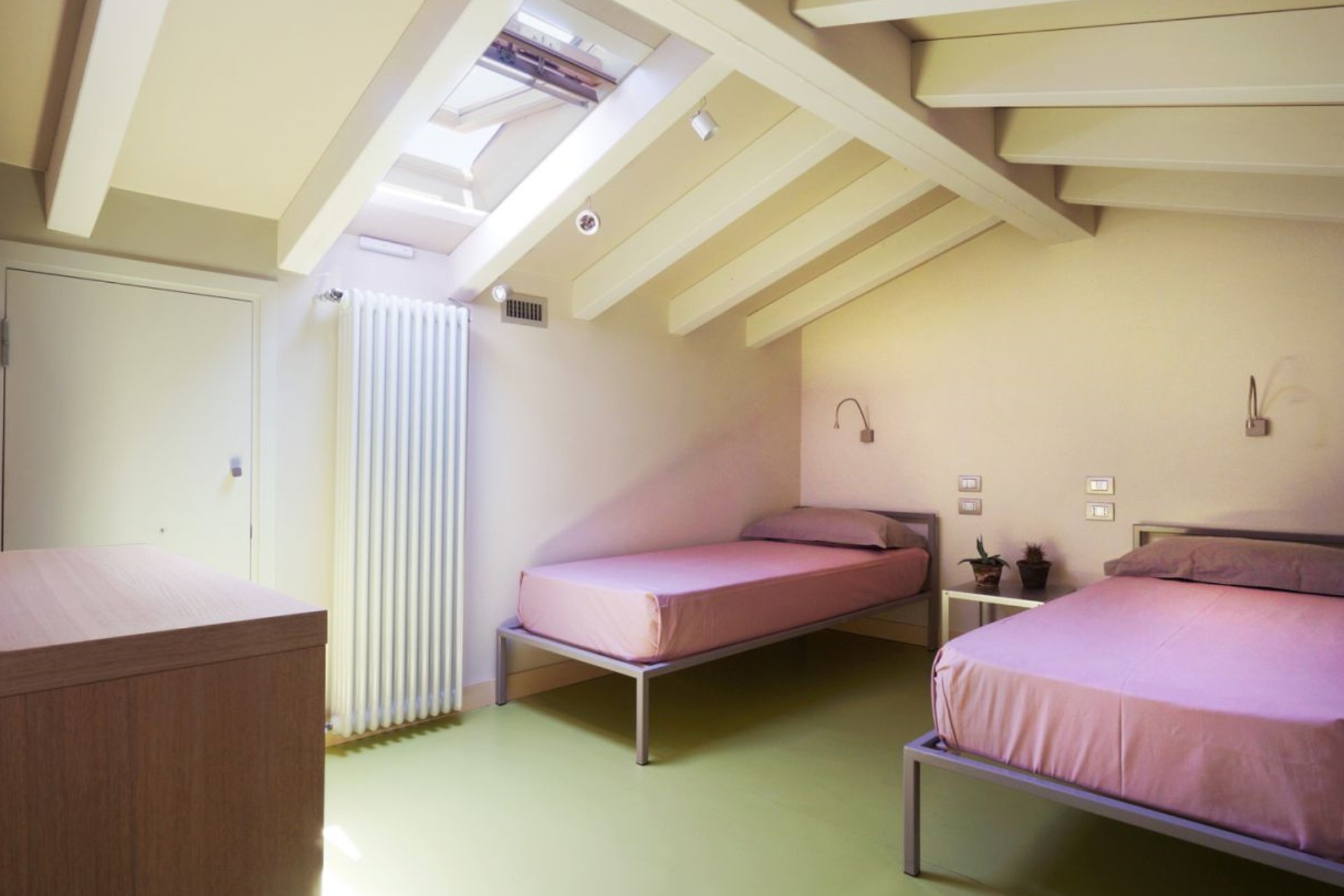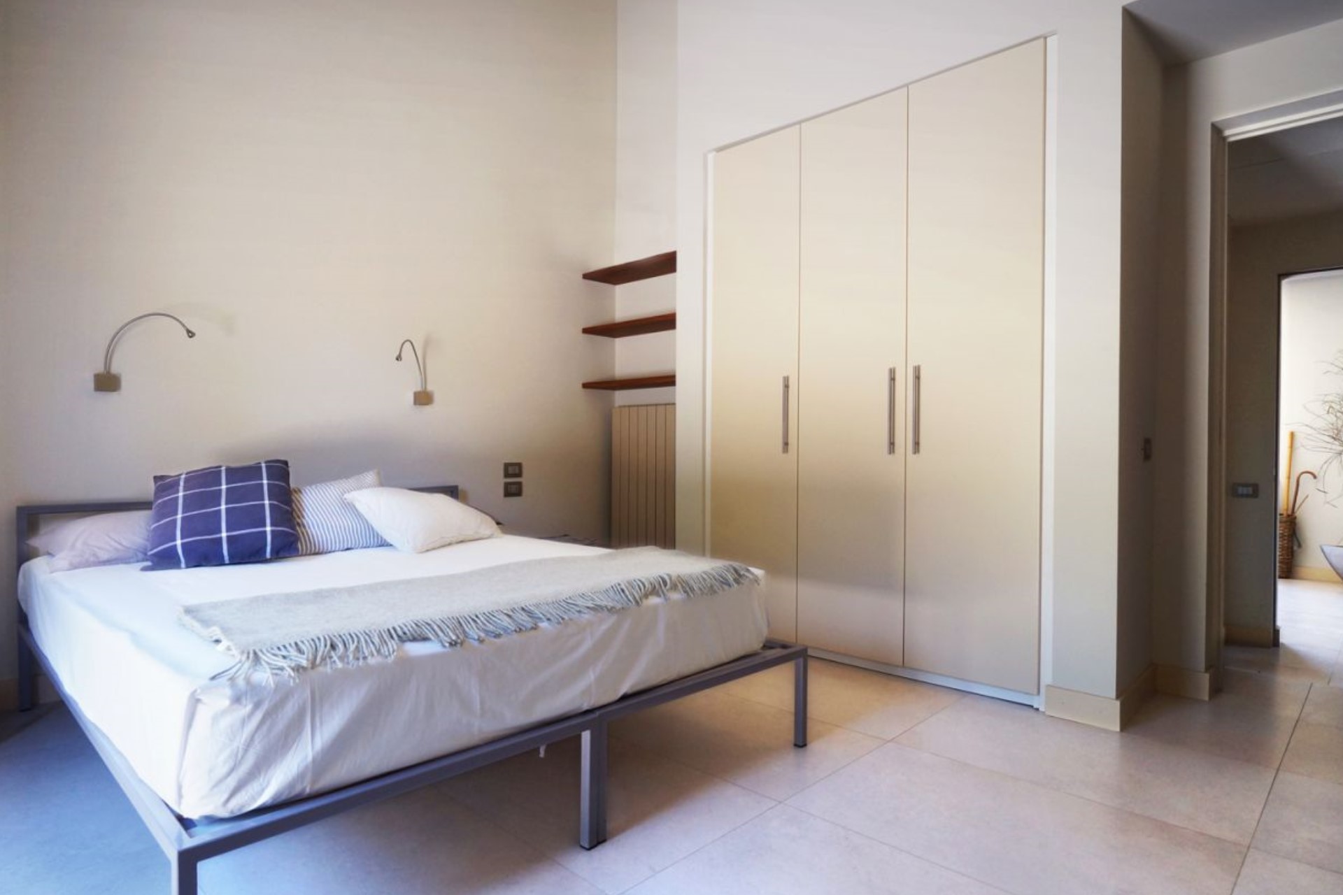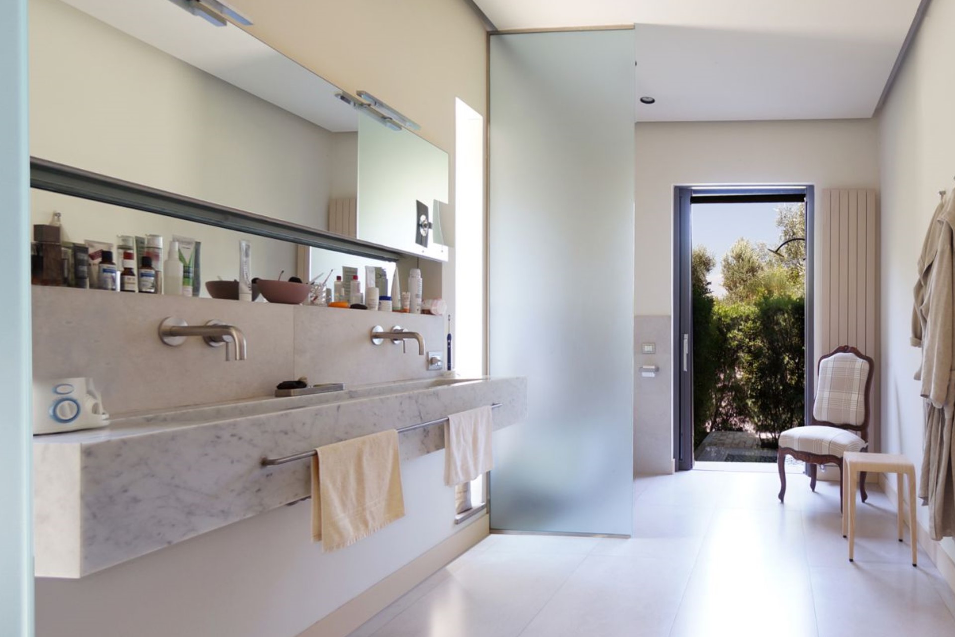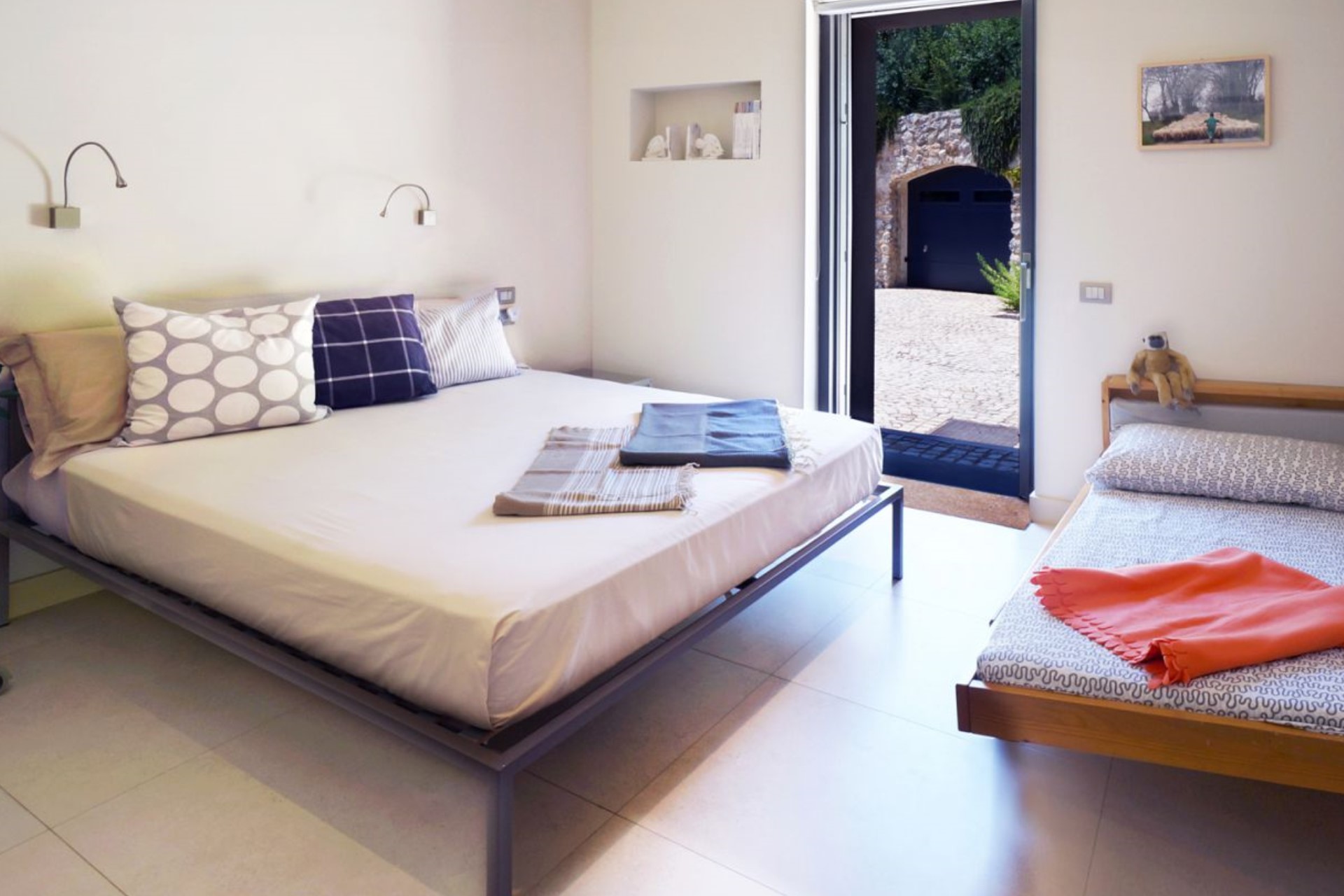 Four bedrooms can accommodate up to eight guests comfortably. The master bedroom boasts a king-sized bed, an en-suite bathroom with a marble sink, a functioning fireplace, and a large French window offering views of the olive grove. The second and third bedrooms feature double beds and en-suite bathrooms, and enjoy independent access from the patio. The fourth bedroom is located in the attic and has access to a private shower room on the ground floor. With its cosier size and twin beds, this room is ideal for children.