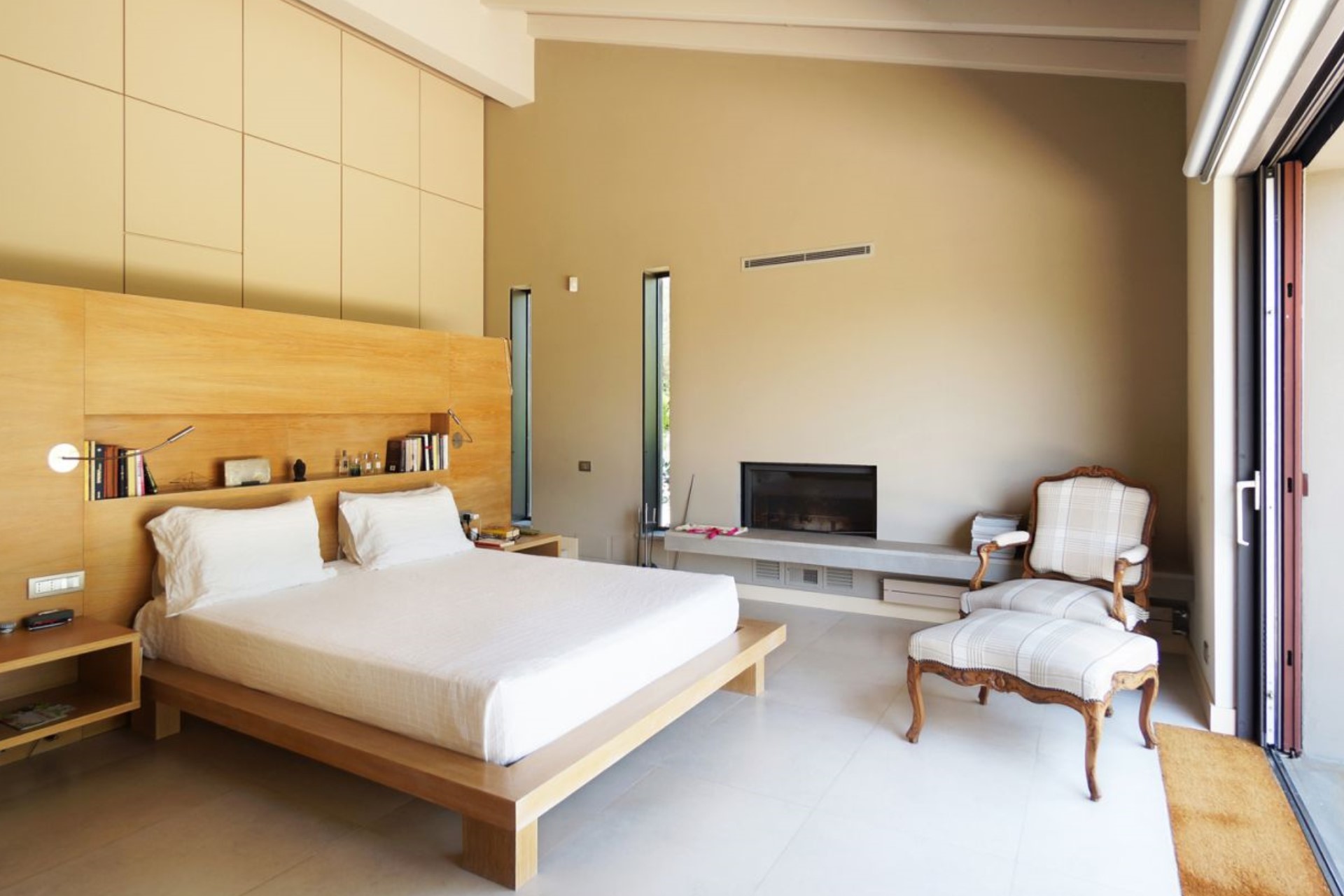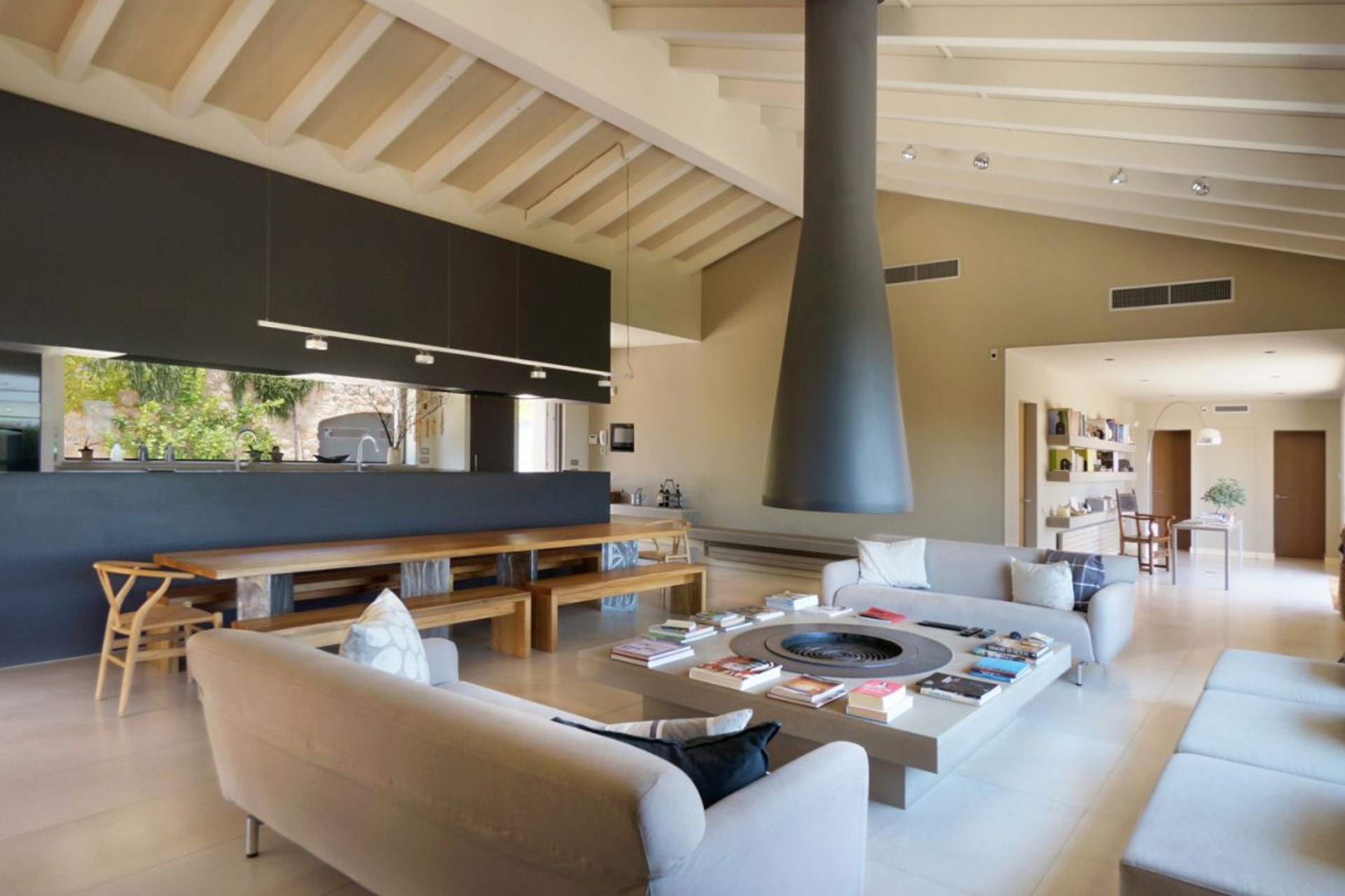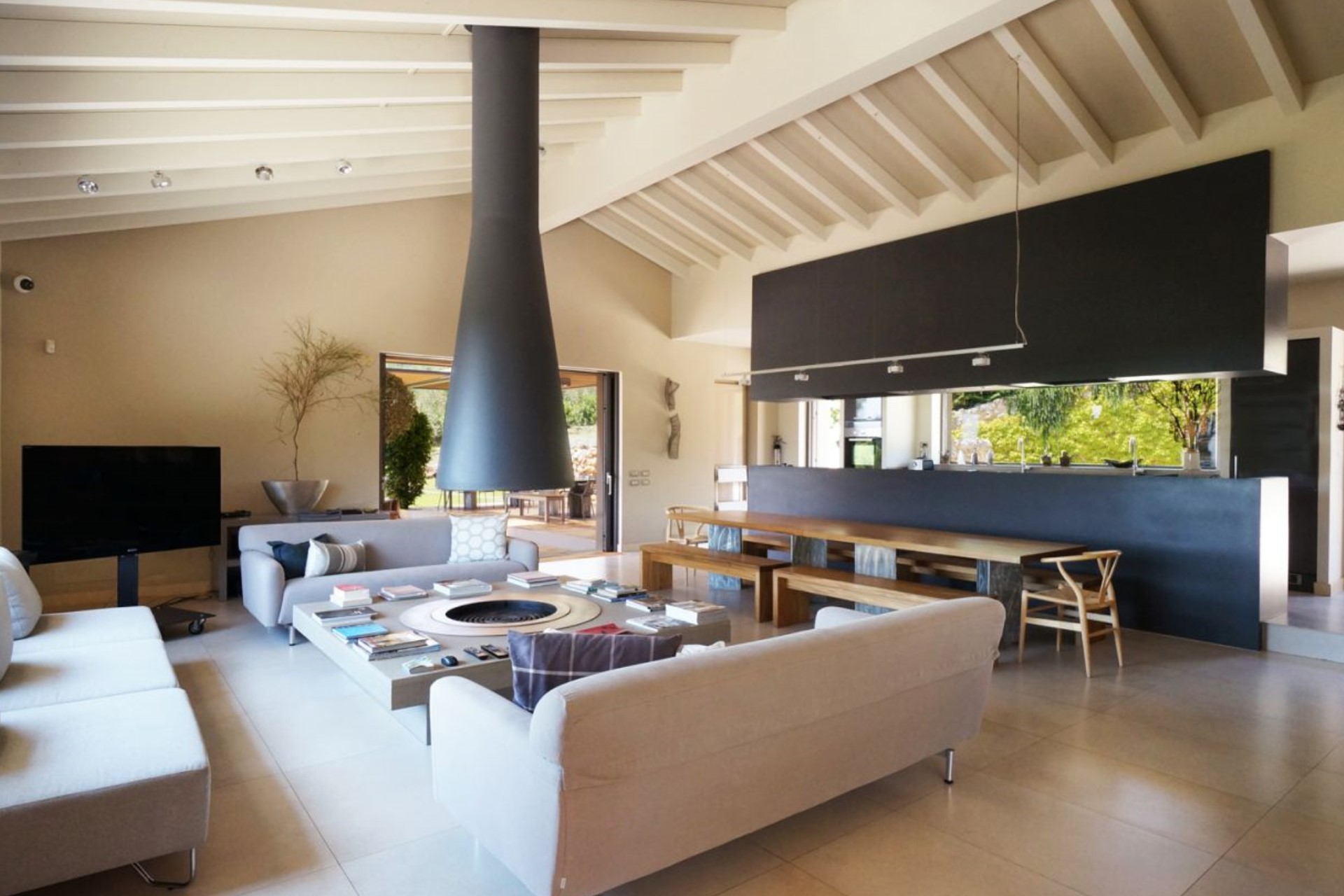 Inside, the living area features an open-plan living, dining, and kitchen area, which opens out onto an external patio, perfect for maximising space for larger groups. The highlight of the living room is the central fireplace, located right in the centre of the room. The modern kitchen features only top-of-the-range facilities along with an indoor barbecue that is perfect for receptions. To further enhance the symbiotic relationship with the surrounding nature, this property has been equipped with large windows that allow guests to constantly enjoy the views.