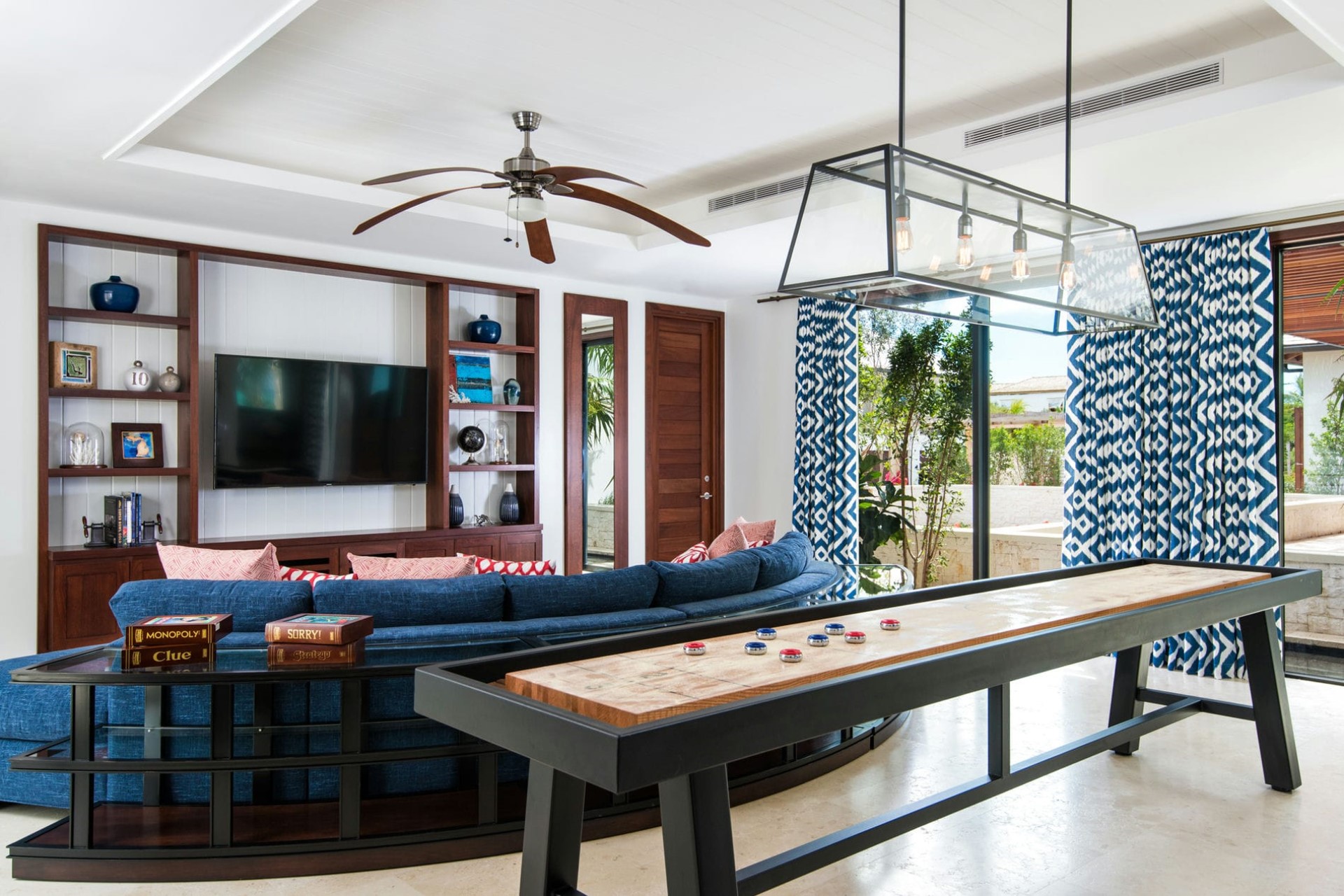 Inside, the villa blends modern elegance with a tropical touch, featuring high ceilings, plush sofas, soft lighting, and direct terrace access for seamless indoor-outdoor living. The spacious dining area, offers both indoor and outdoor options, flowing effortlessly onto the terrace with ocean views. A stylish kitchen, complete with high-end appliances, a breakfast bar, a wine fridge, and a coffee station, opens to the outdoor dining area, making entertaining effortless. A fully equipped gym, cinema room, massage room, and shuffleboard table add to the villa’s luxurious appeal.