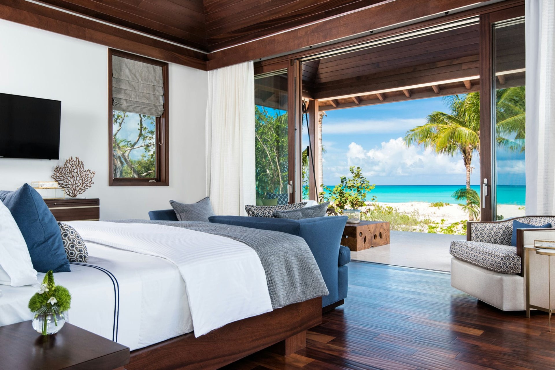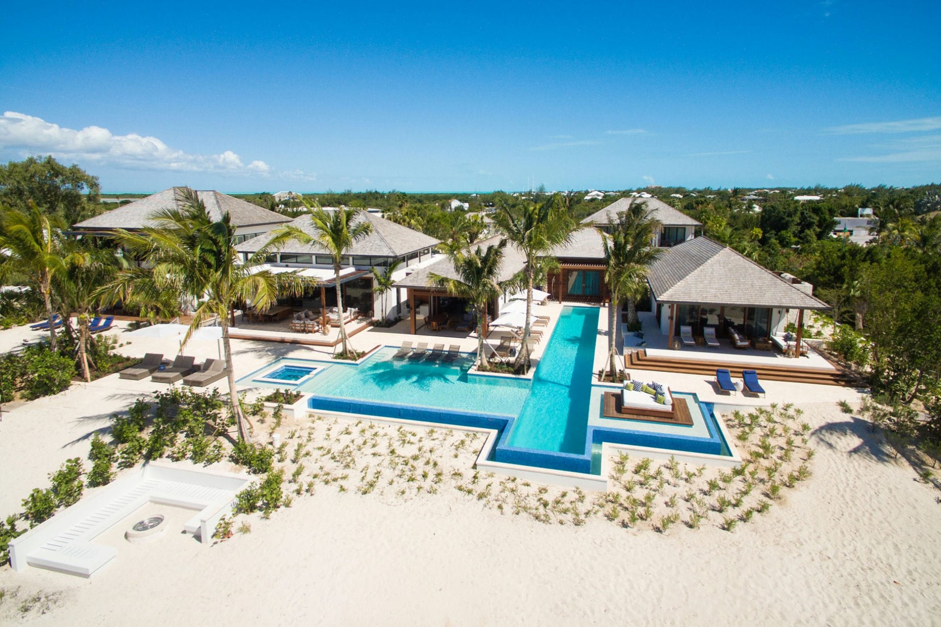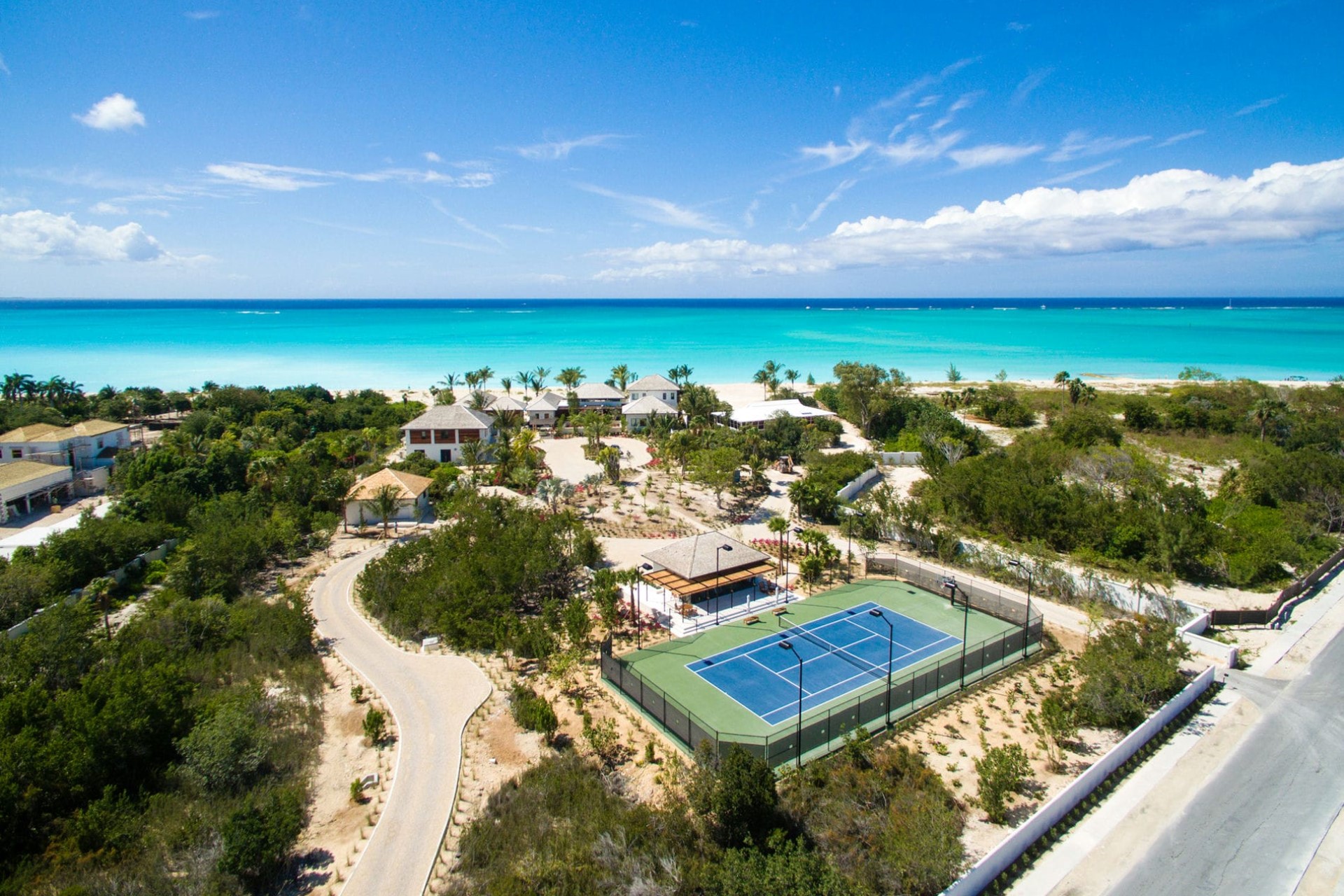 A grand beachfront estate in Turks and Caicos with a private heated pool, a tennis court, and direct beach access.