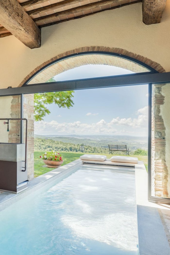 The hilltop location of the outdoor swimming pool offers guests magnificent panoramic views of the property’s vineyards, the surrounding fields, and the historic village of Castellina. After a refreshing dip, guests can soak up the sunshine from a poolside lounger or day bed or head to the pool bar and kitchen for a barbecue lunch or refreshing cocktail.