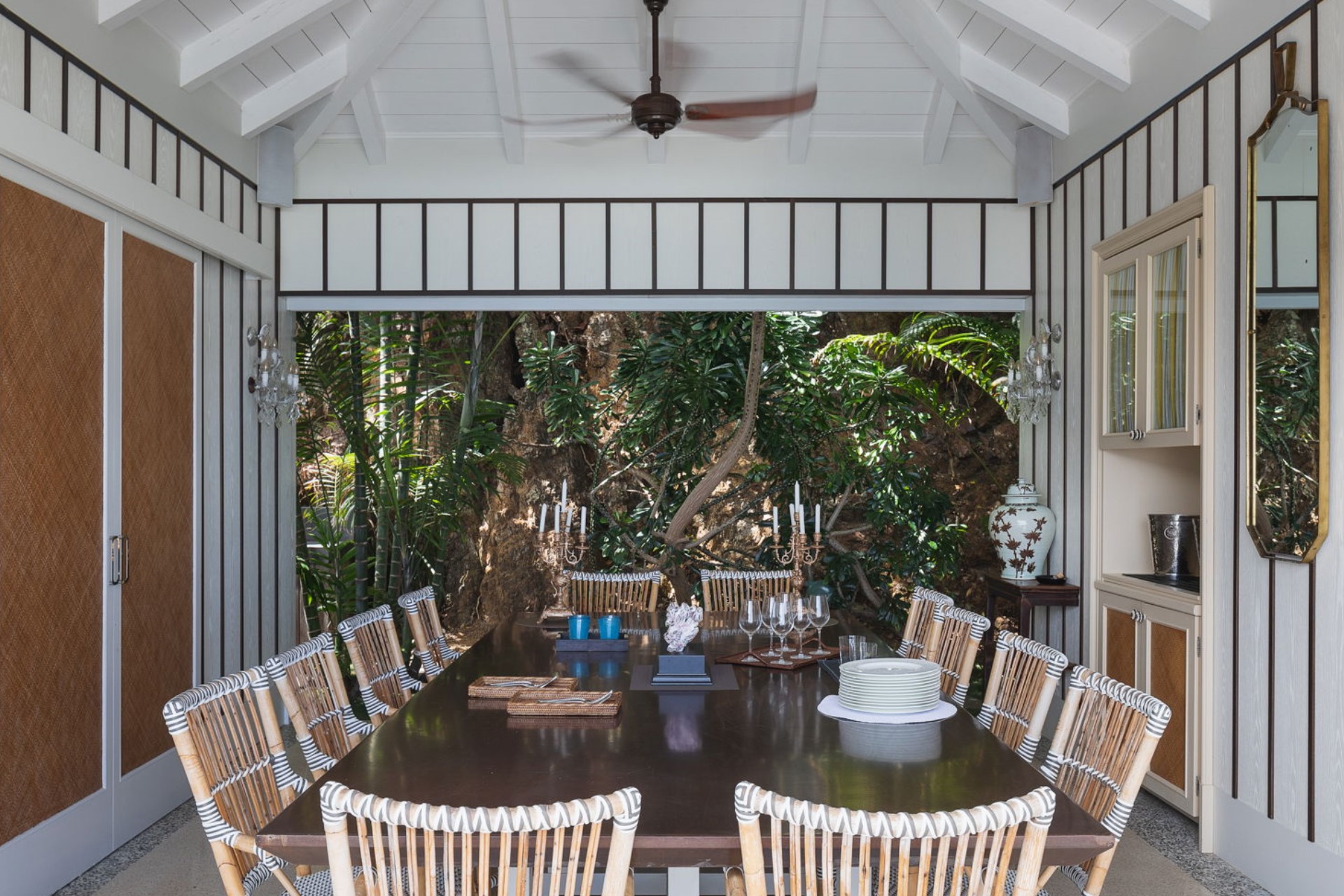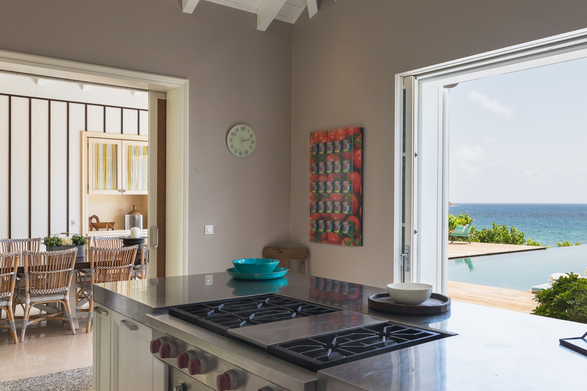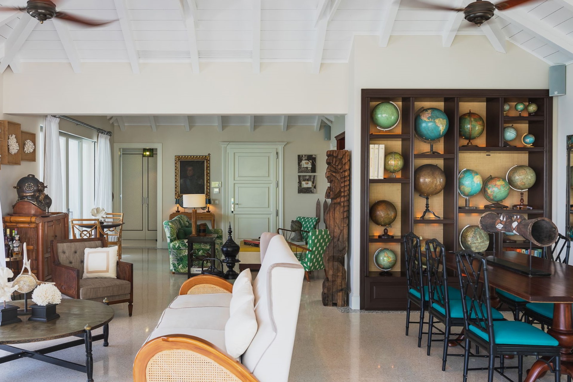 The villa’s interior boasts a spacious, air-conditioned living area adorned with dark wood furniture, plush sofas, and a curated collection of art, including globes, sculptures, and paintings, creating a cosy and inviting atmosphere. The high vaulted ceilings enhance the sense of space, while the seamless blend of indoor and outdoor living areas allows guests to fully embrace the island’s natural beauty. The fully equipped kitchen features high-end appliances and a breakfast bar, perfect for casual dining or entertaining. Adjacent to the kitchen is an elegant dining area that comfortably seats up to fourteen guests, making it ideal for shared meals and celebrations.