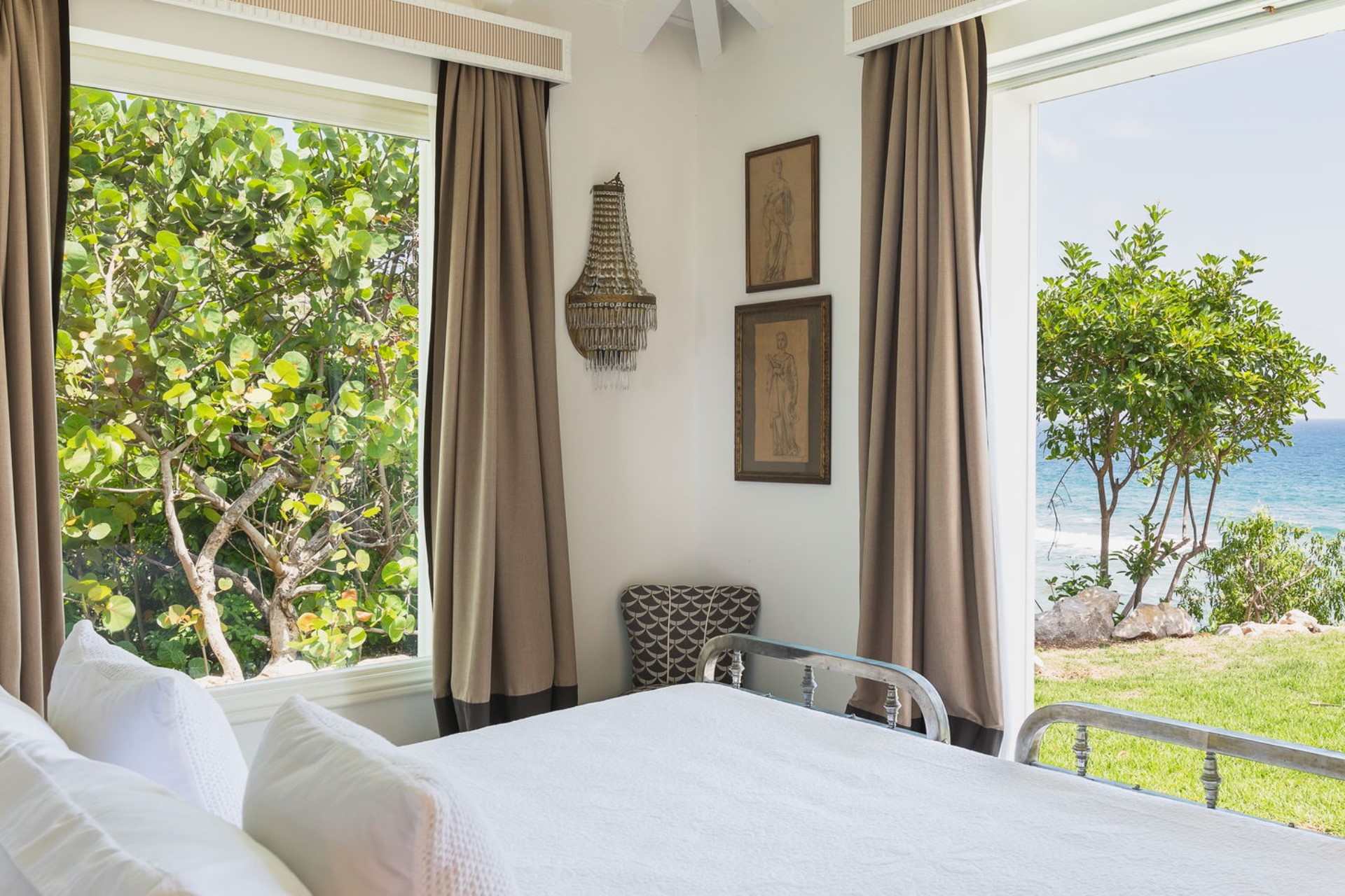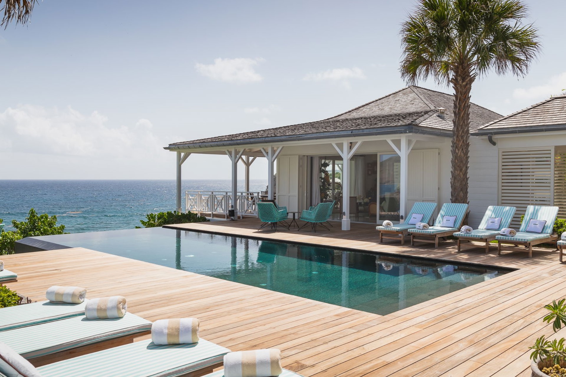 The outdoor area is a haven of relaxation and entertainment, featuring a heated infinity pool that appears to merge with the azure ocean. The surrounding terrace is furnished with sun loungers and shaded seating areas, providing the perfect setting for sunbathing or unwinding with a good book. A covered dining area and a barbecue are also available, allowing guests to enjoy meals under the Caribbean stars. The lush tropical garden enhances the villa’s serene ambience, making it an ideal place to enjoy the glorious sunsets over the ocean.