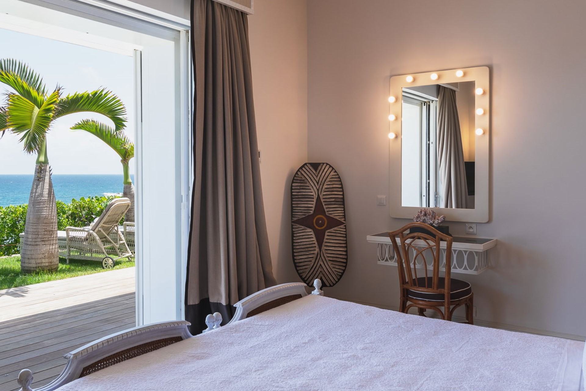 Each of the seven air-conditioned bedrooms is thoughtfully designed to offer privacy and comfort, most featuring king-size beds, en-suite bathrooms, and private terraces with ocean views. The master suite, located on the main level, boasts a spacious en-suite bathroom with a rain shower and a bathtub, as well as direct access to the terrace. The additional bedrooms are situated on various levels, ensuring a harmonious balance between shared and private spaces, catering to the needs of all guests.