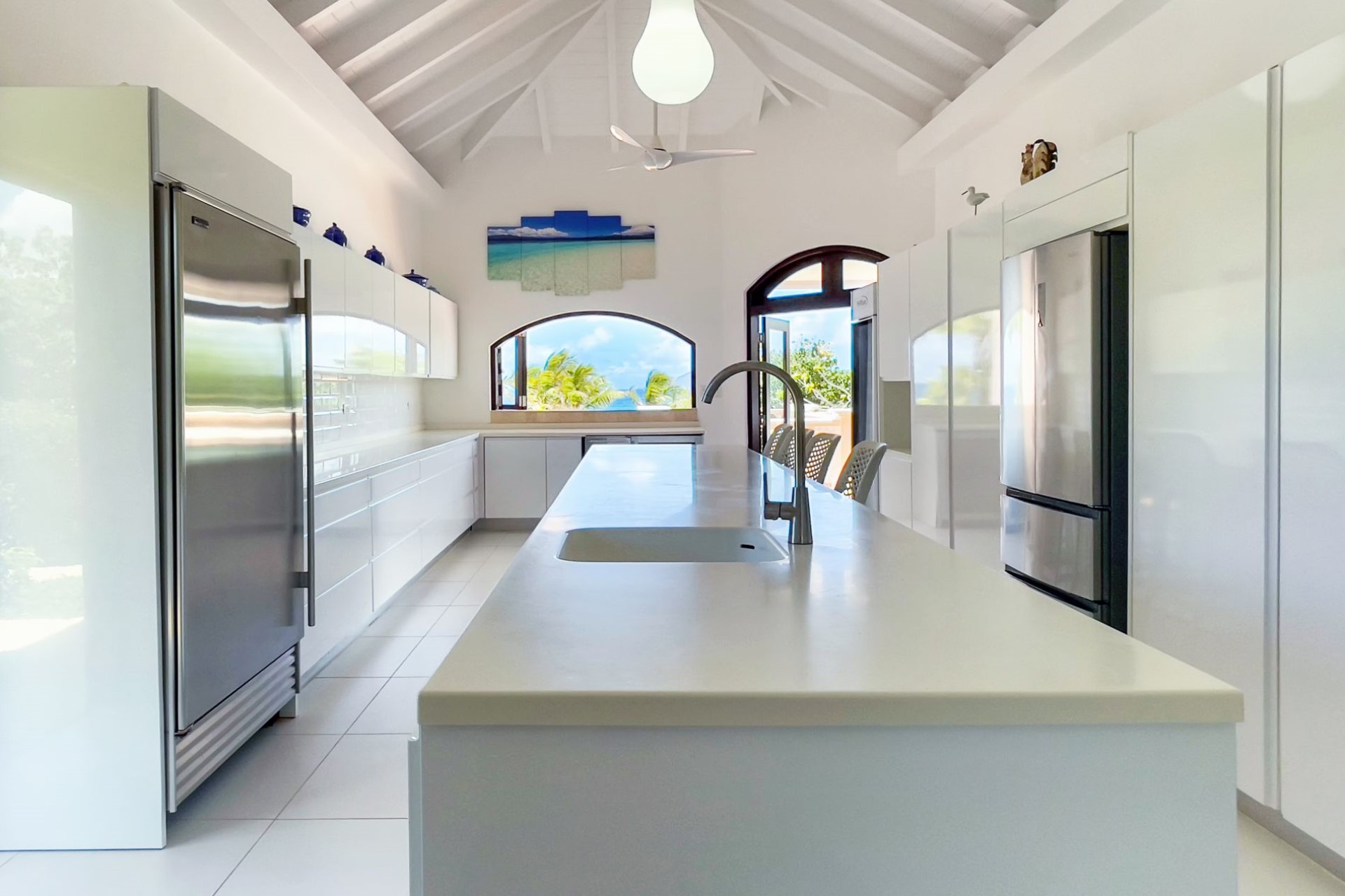 A spectacular entrance hall welcomes guests indoors to bright, airy spaces of understated elegance created by high ceilings, tall archways, indulgent soft furnishings, beautiful textiles and panoramic views of the islands beyond. Guests can relax in the spacious, elegant lounge that opens onto a magnificent terrace, with a superb contemporary kitchen.