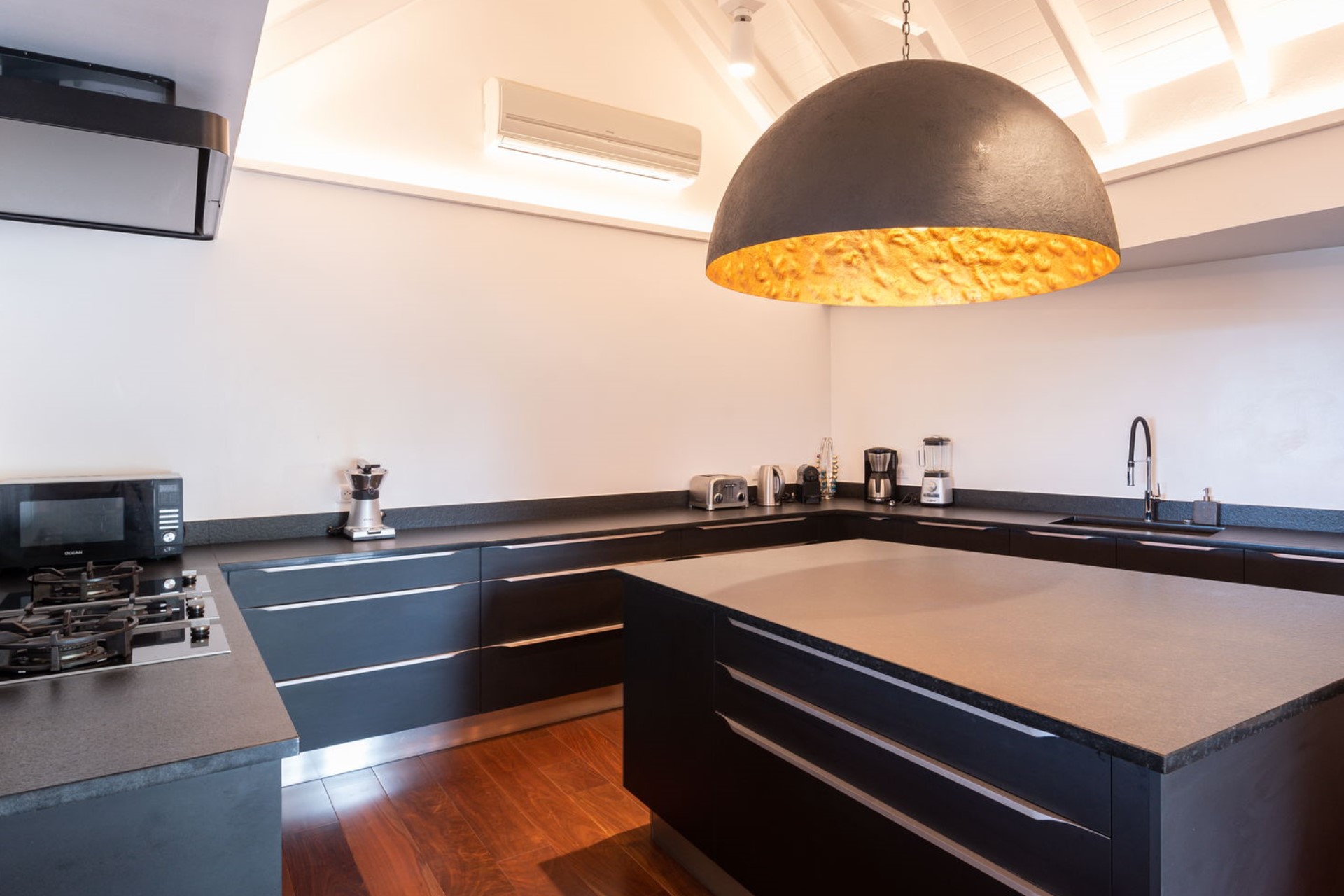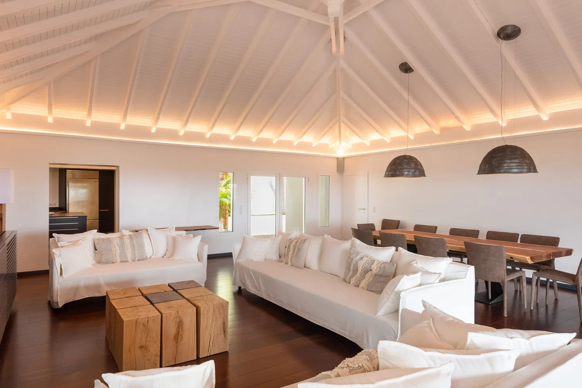 The villa’s interior features a spacious, air-conditioned living area adorned with warm wood accents and contemporary décor, creating a serene and inviting atmosphere. The open-plan living room is furnished with comfortable sofas under a high vaulted ceiling, perfect for relaxation. Adjacent to the living area is a dining room with a large table for up to 12 guests and a fully equipped gourmet kitchen with a central island, ideal for preparing and enjoying meals.
