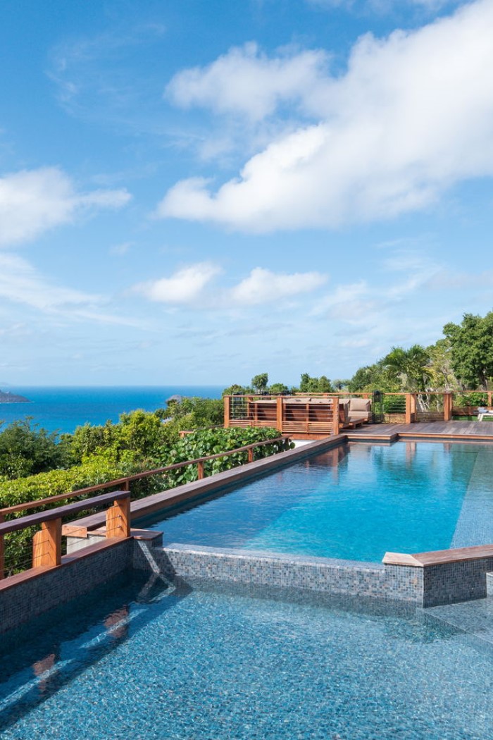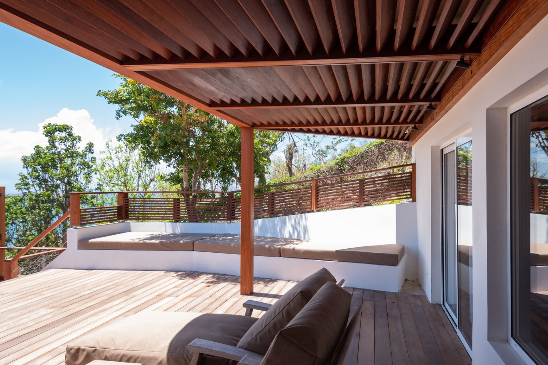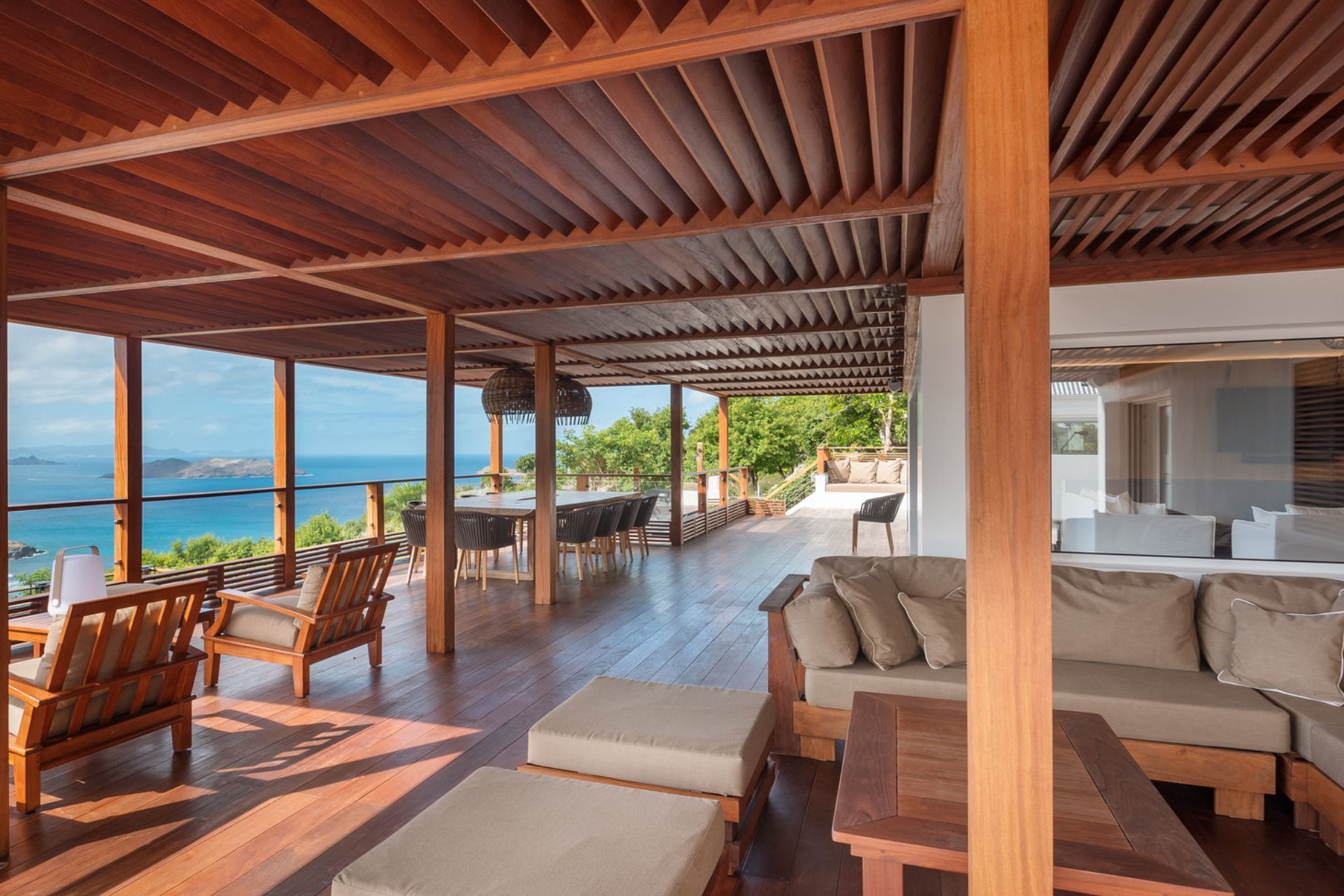 The expansive terrace includes sun loungers for sunbathing, a bar area, and multiple lounge spaces, all offering unobstructed views of the ocean and lush tropical surroundings. An alfresco dining area provides the perfect setting for meals under the Caribbean sky.